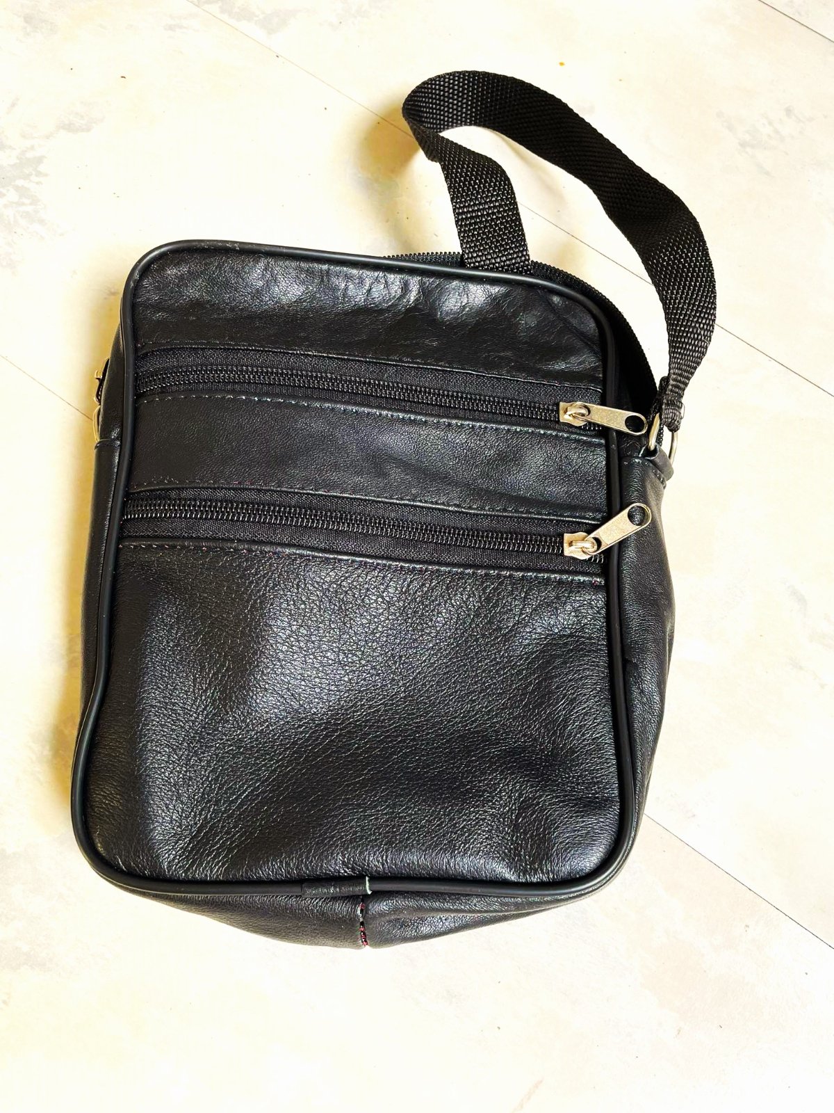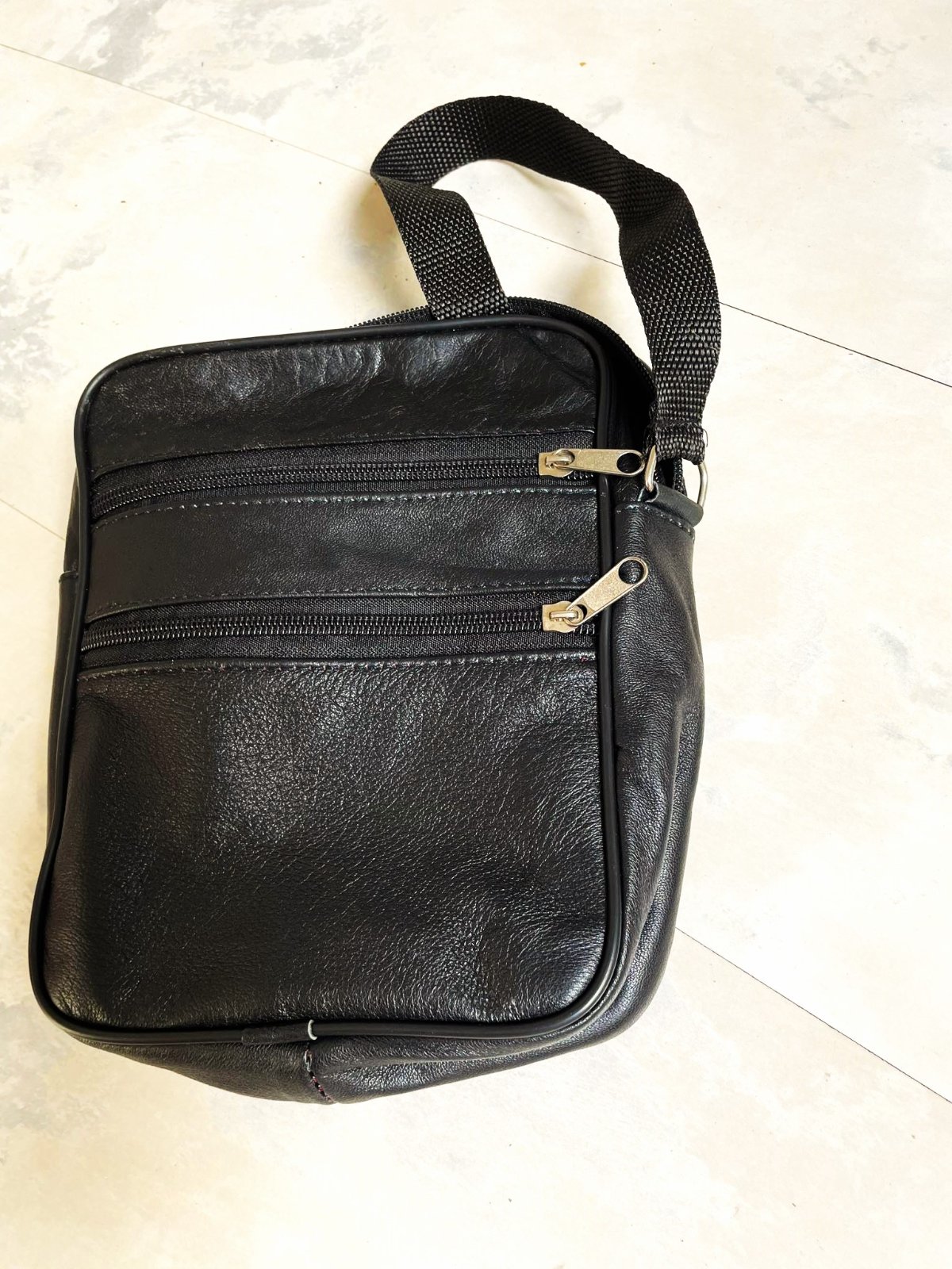 kvalitná over cross taška,pravá koža,matná,sýtočierna,22 cm ( výška ) x 17 ( šírka ) x 5 cm ( dno ),vpredu priehradky na 2 zipsy, dnu bez priehradok,rúčka posuvná až do 134 cm - nie je z kože,ale z textilného hrubého ripsu,je min. používaná