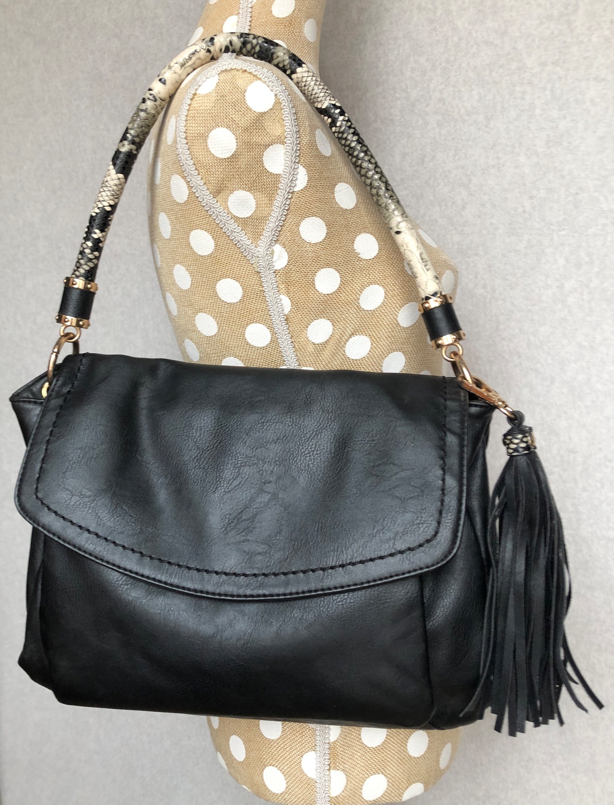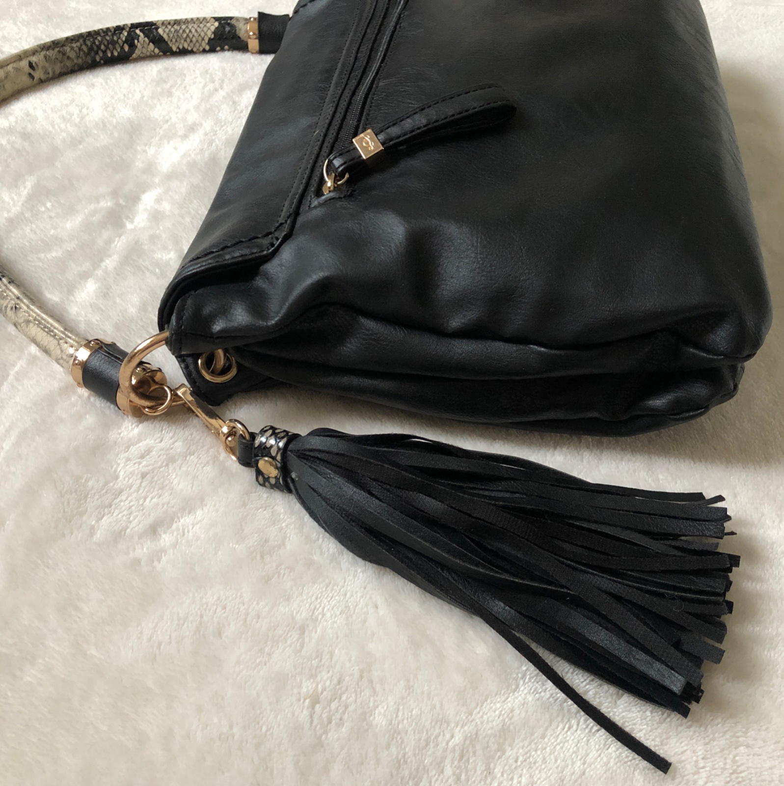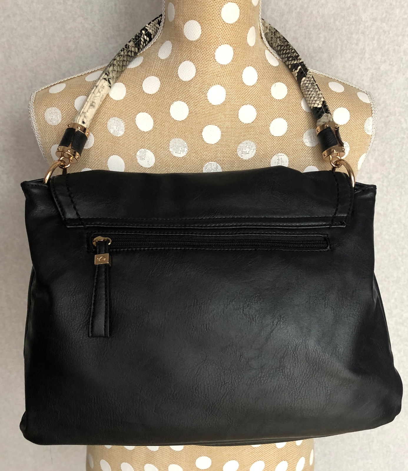 Štýlová elegantná praktická taška kabelka na rameno aj do ruky - má dve hlavné časti, každá z nich má samostatne menšie vrecká. Vpredu je ďalšie kratšie vrecko. Zatváranie na magnetický gombík. Vzadu je ešte zipsové vrecko.