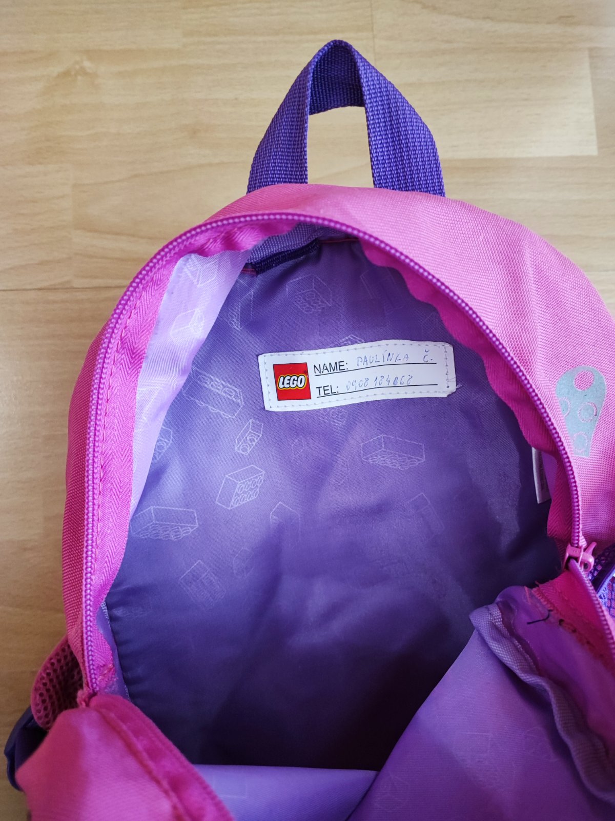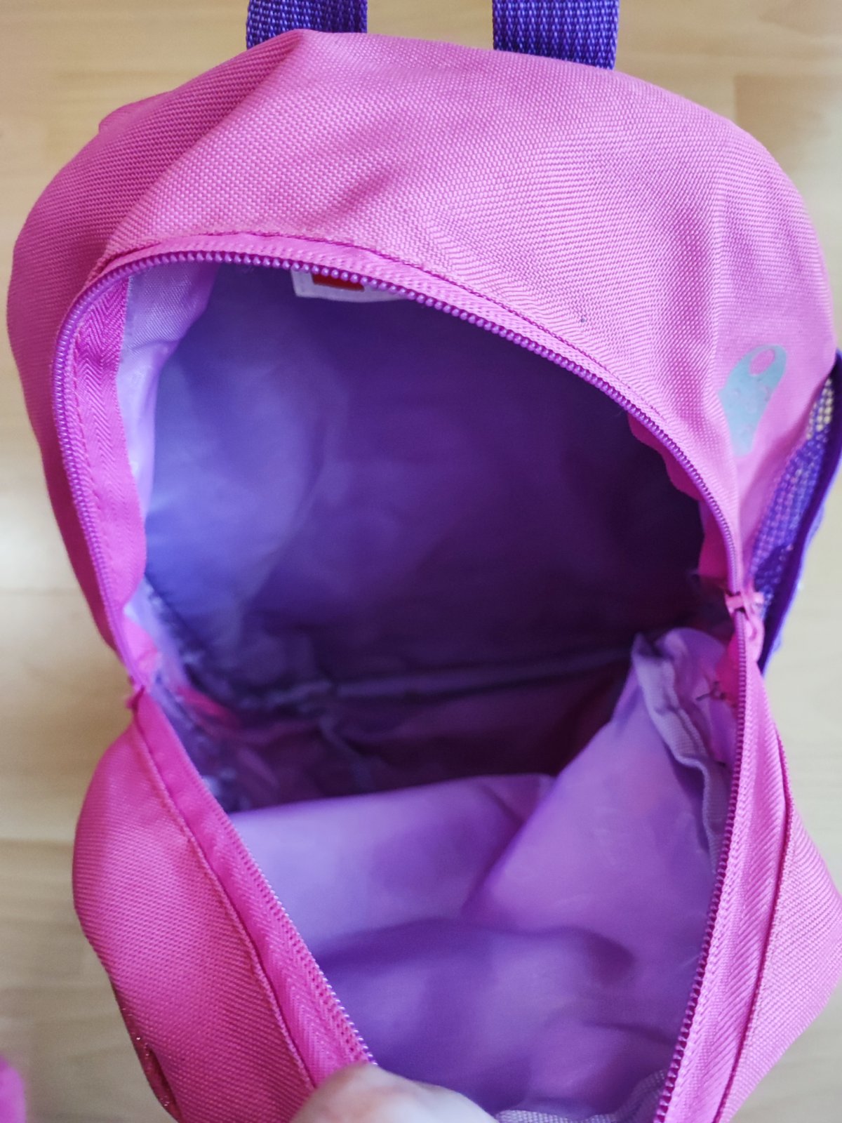Ruksak rozmerov cca 25 x 32cm. Vhodný pre škôlkarov. Veľmi pekný, bez poškodenia. Menovku si treba prepísať vnútri. Ja som ho už neprala, narýchlo triedim veci. Mená ale žiadne fľaky, ani nič také.
