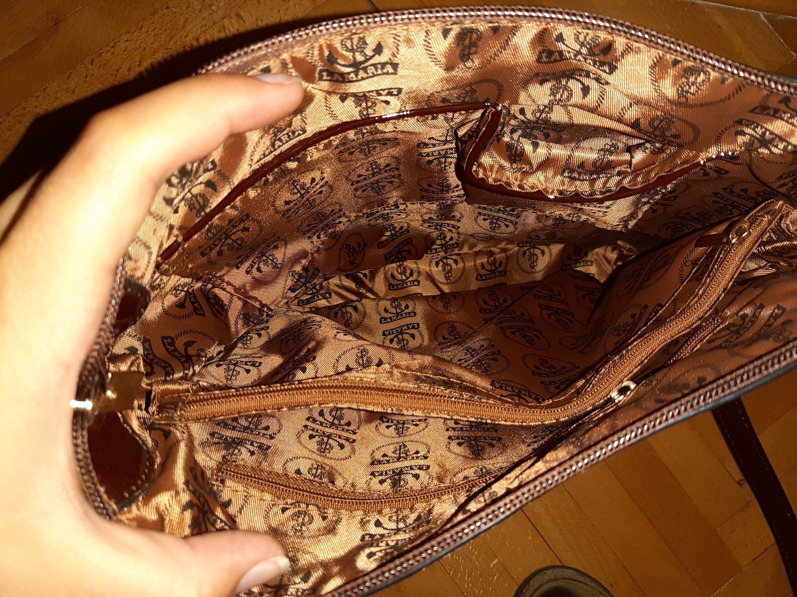 Krásna lakovaná taška s nastaviteľným remienkom a úložným priestorom na zips. Taška je ako nová, nemá žiadne poškodenia, veľmi málo používaná.
