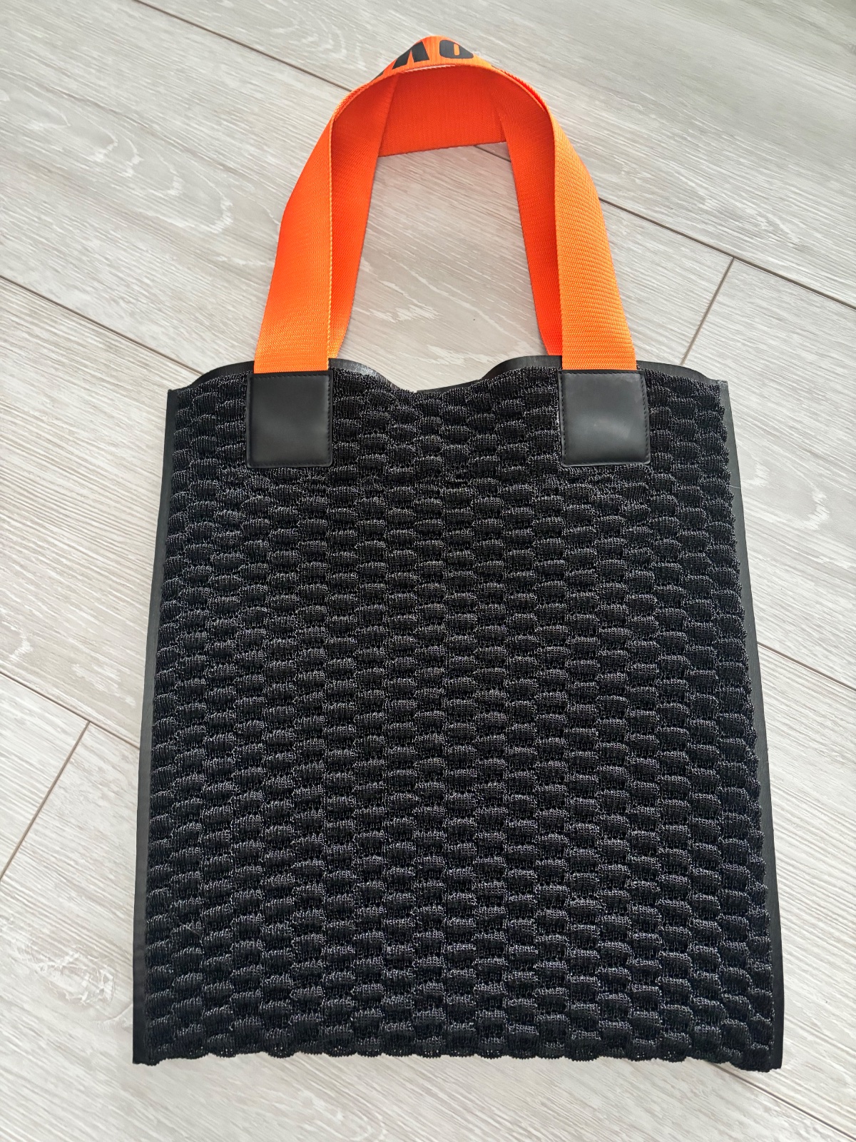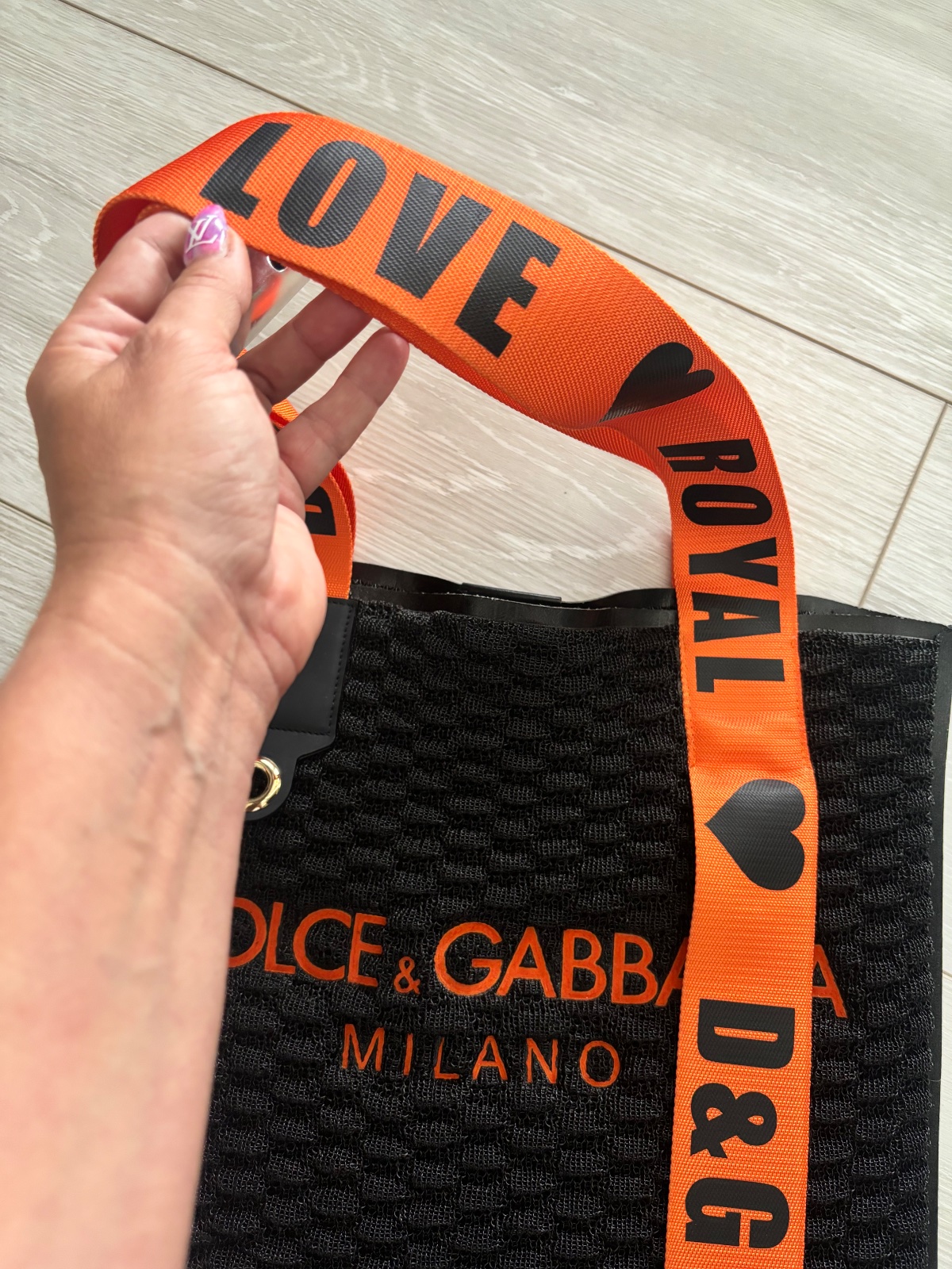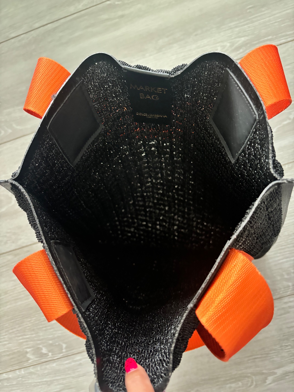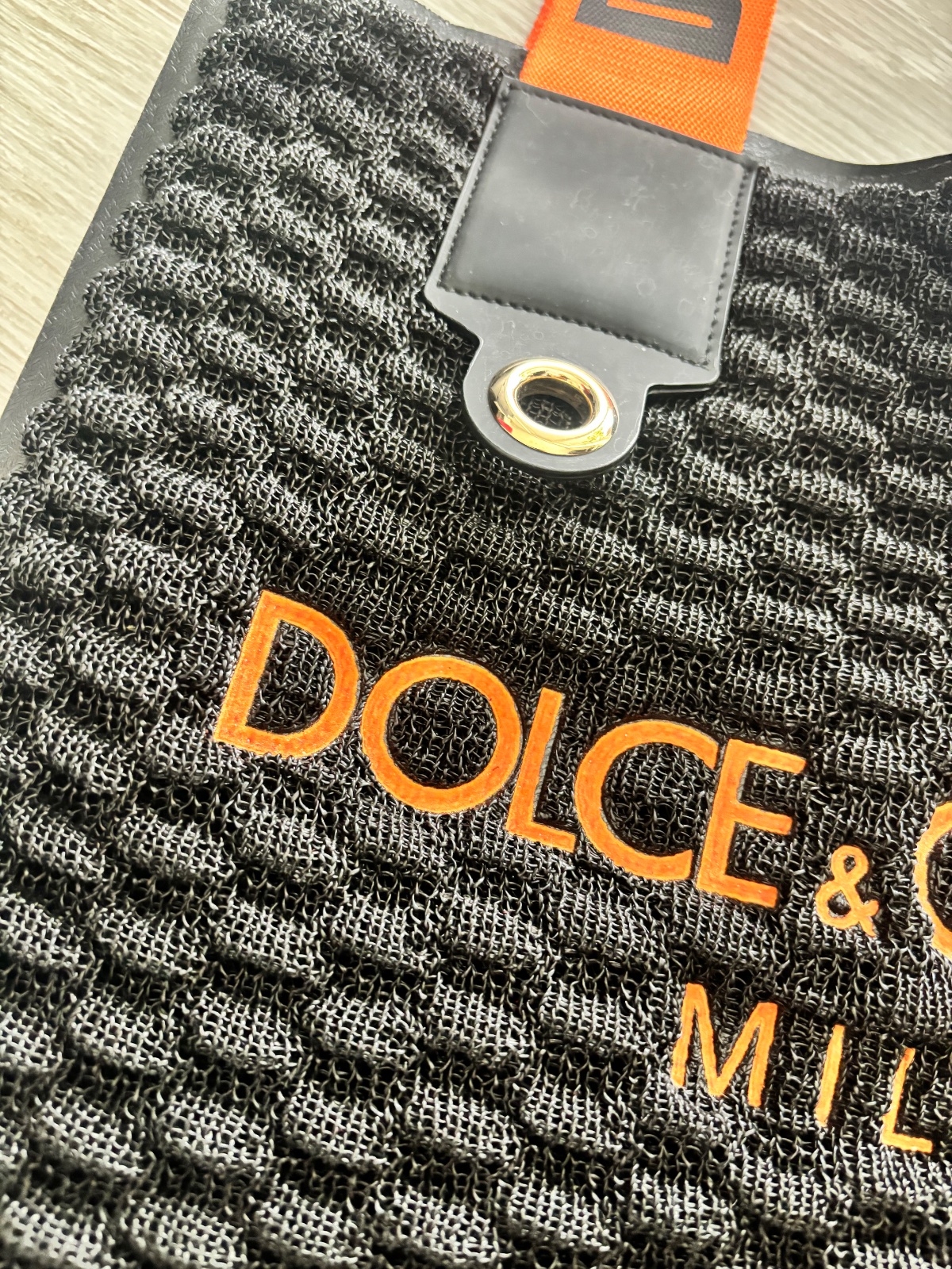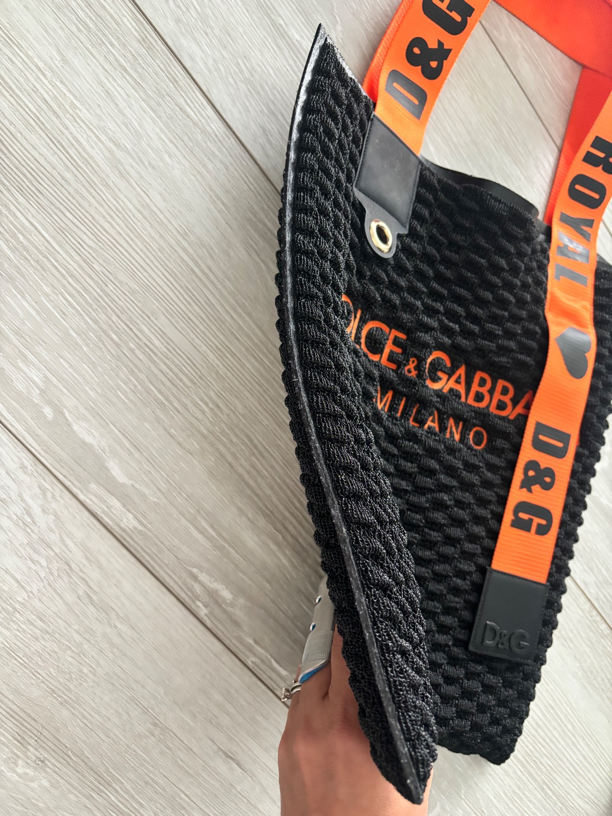 Krásna a velmi originálne riešená taška D&G. Čierna kombinovaná oranžovou. Materiál niečo ako pletená guma. Velmi dobrý nosený stav. Bežné známky nosenia, bez poškodenia. Mierne ošúchané logo na vnútornom štítku. Komplet balenie. Miery 40x35 cm.