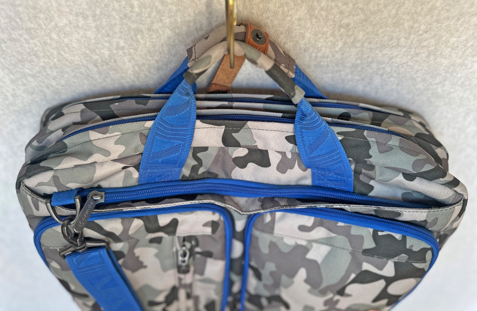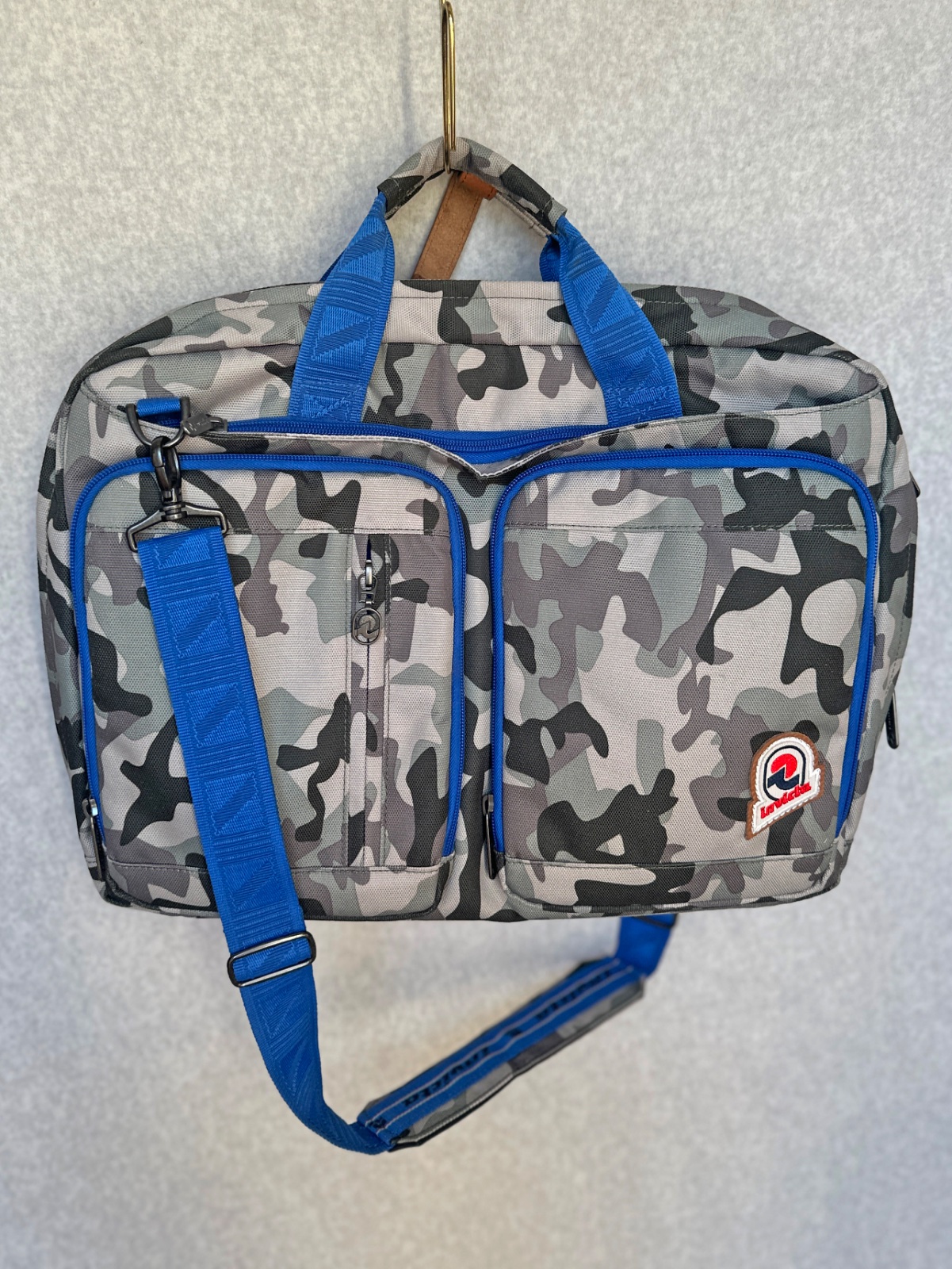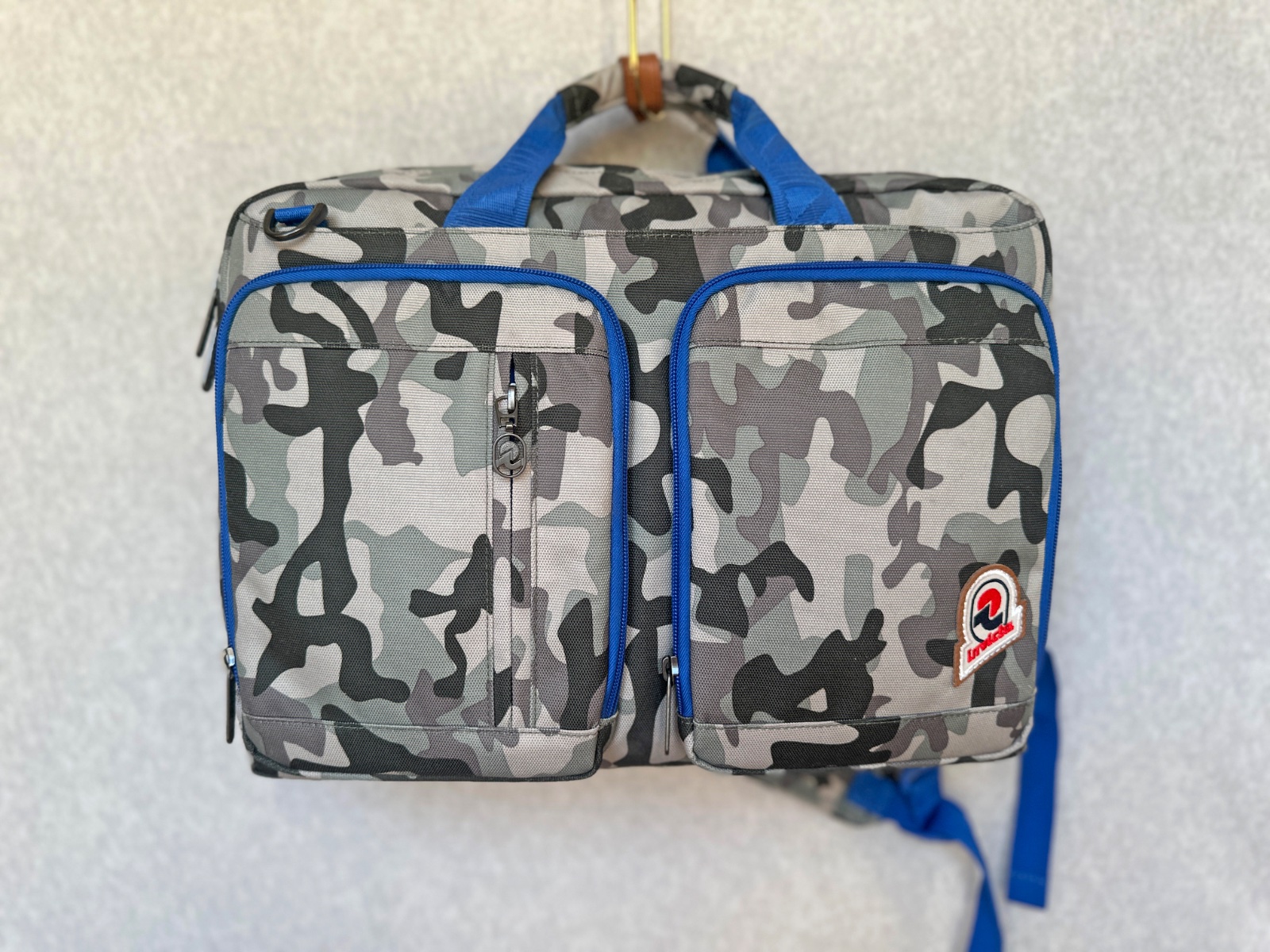 Štýlový ruksak a laptop taška, prípadne cestovná príručná taška. Mnohostranné využitie s možnosťou nosiť na ramenách ako ruksak, v ruke, alebo na dlhý nastaviteľný popruh cez rameno. Dlhý popruh, okrem toho, že sa dá nastaviť jeho dĺžka je odnímateľný. Popruhy na chrbát sa pri nevyužívaní dajú schovať do zadného vrecka. Taška má množstvo vreciek, priehradiek, priečinkov. Priehradky sú vystužené pre ochranu v prípade prenášania elektroniky. Kvalitný materiál a celkové prevedenie, zapínací popruh na krátkych rúčkach je z pravej kože. Super štýlový dizajnérsky kúsok v nadčasovej military khaki v kontraste so žiarivou modrou - oživí každý outfit. V super stave, bez poškodení, bez známok použitia.