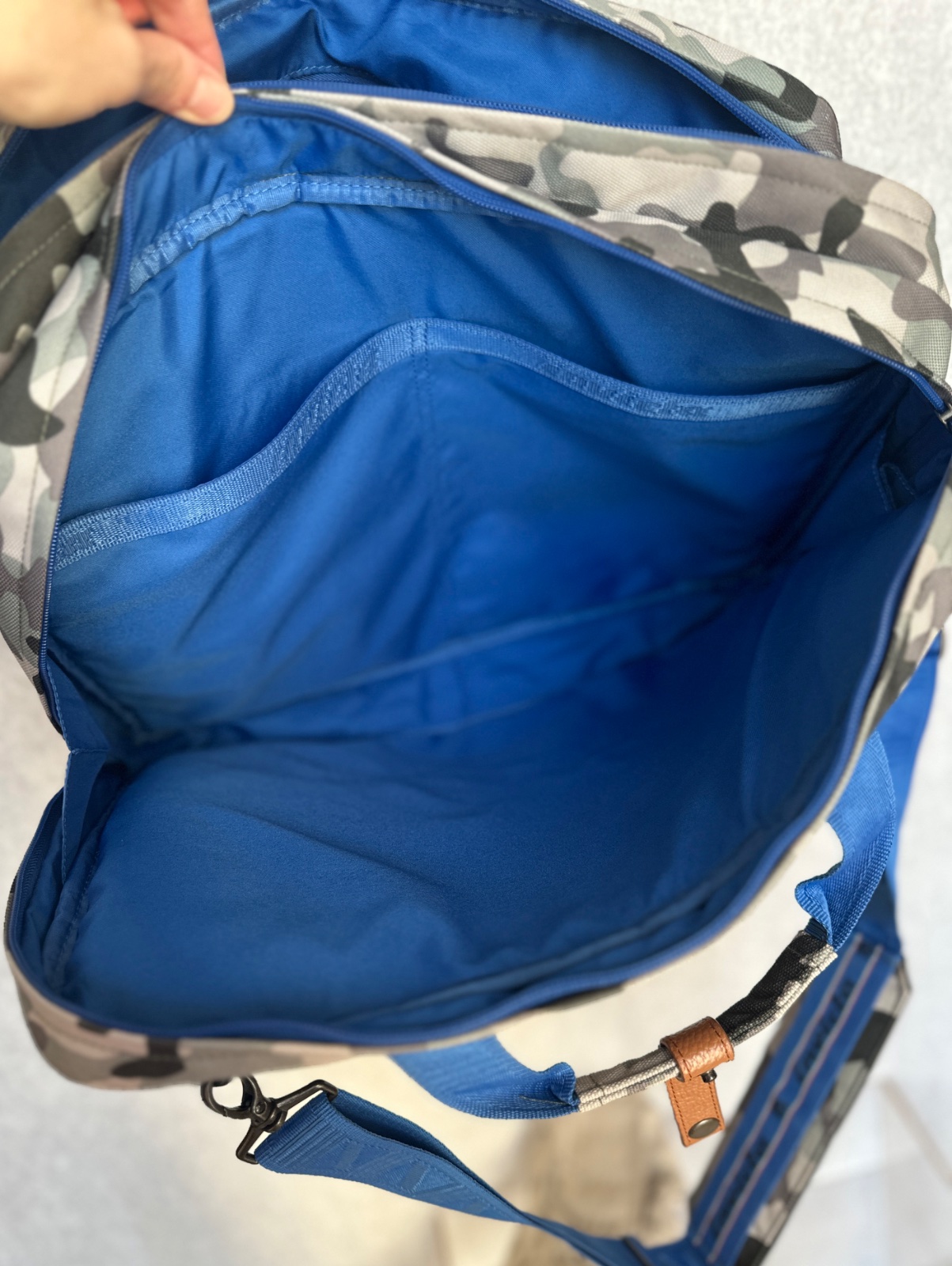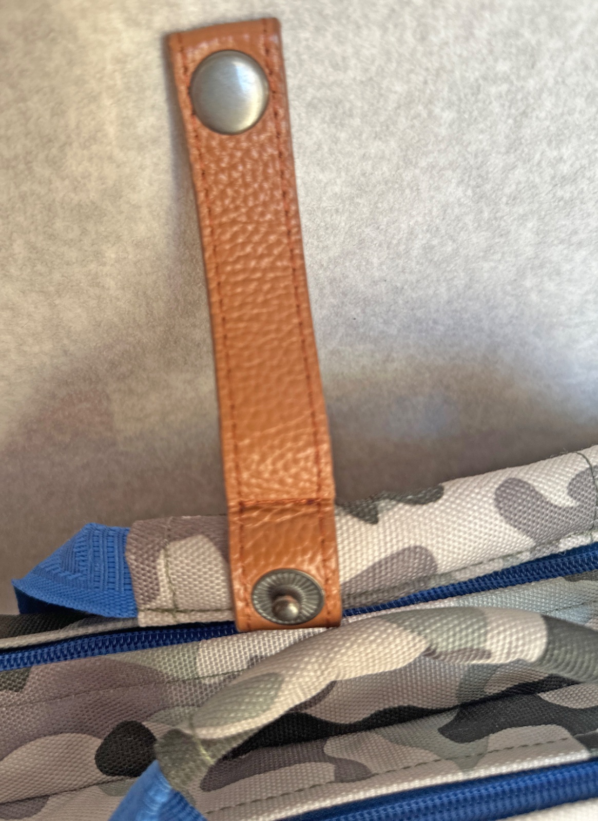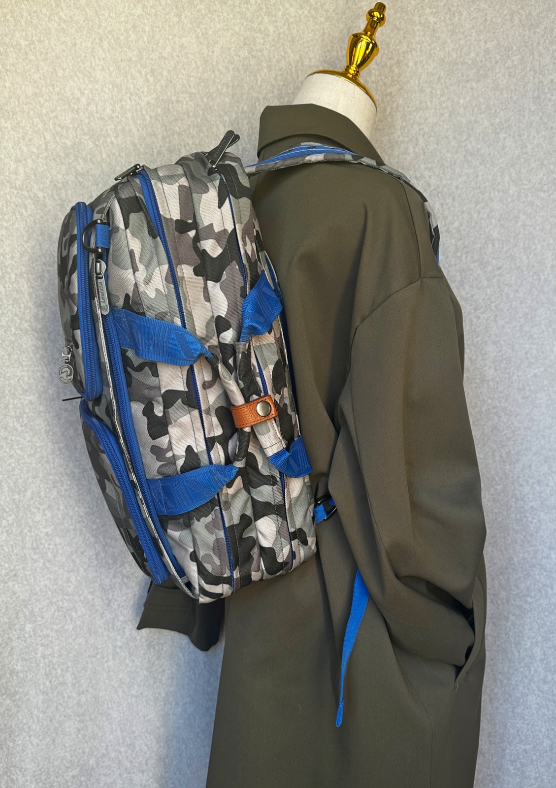Štýlový ruksak a laptop taška, prípadne cestovná príručná taška. Mnohostranné využitie s možnosťou nosiť na ramenách ako ruksak, v ruke, alebo na dlhý nastaviteľný popruh cez rameno. Dlhý popruh, okrem toho, že sa dá nastaviť jeho dĺžka je odnímateľný. Popruhy na chrbát sa pri nevyužívaní dajú schovať do zadného vrecka. Taška má množstvo vreciek, priehradiek, priečinkov. Priehradky sú vystužené pre ochranu v prípade prenášania elektroniky. Kvalitný materiál a celkové prevedenie, zapínací popruh na krátkych rúčkach je z pravej kože. Super štýlový dizajnérsky kúsok v nadčasovej military khaki v kontraste so žiarivou modrou - oživí každý outfit. V super stave, bez poškodení, bez známok použitia.