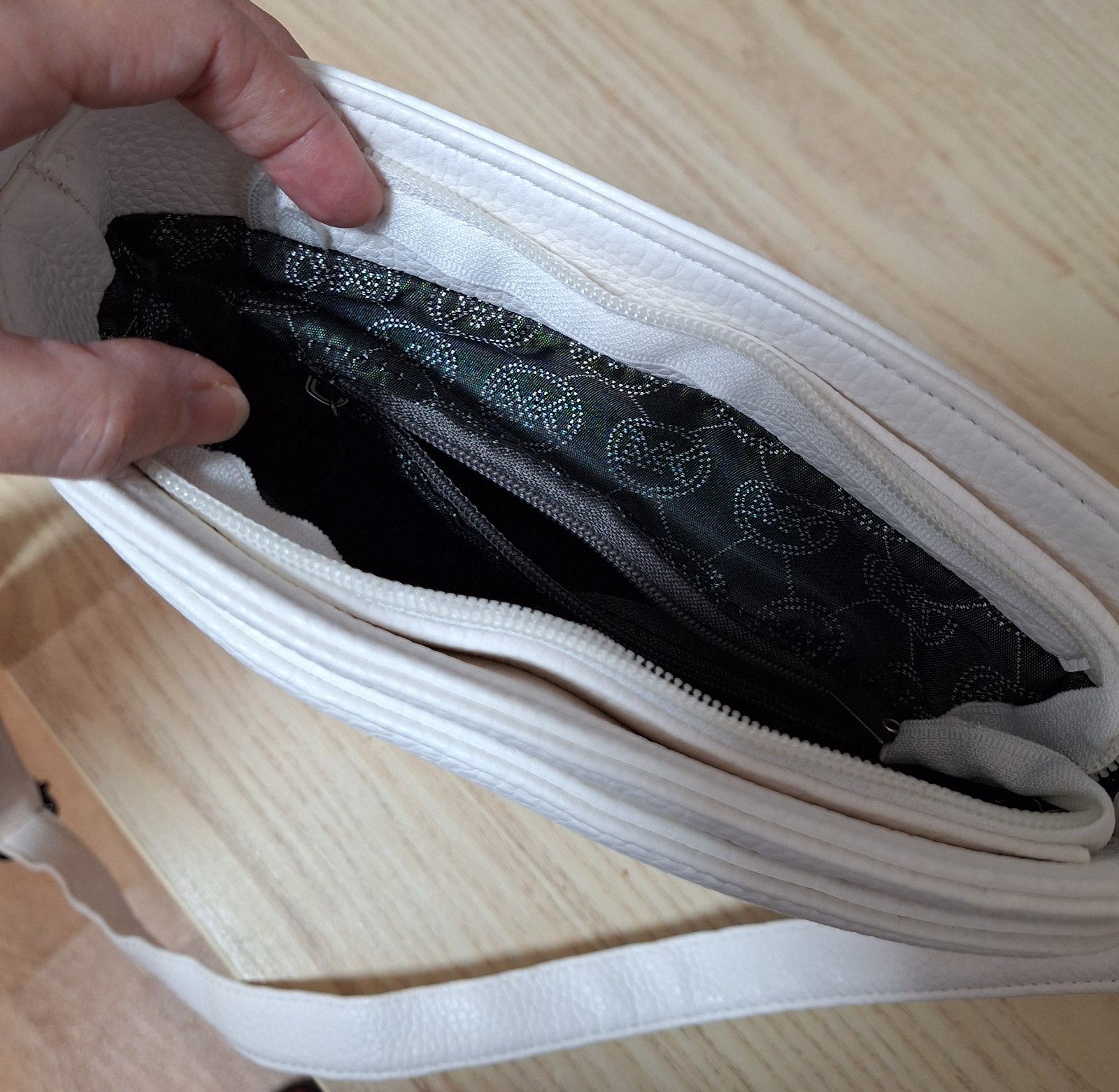 Má hlavnú priehradku na zips, vnútri je malé vrecko na zips, v prednej a zadnej časti kabelky sú dve priehradky na magnet.