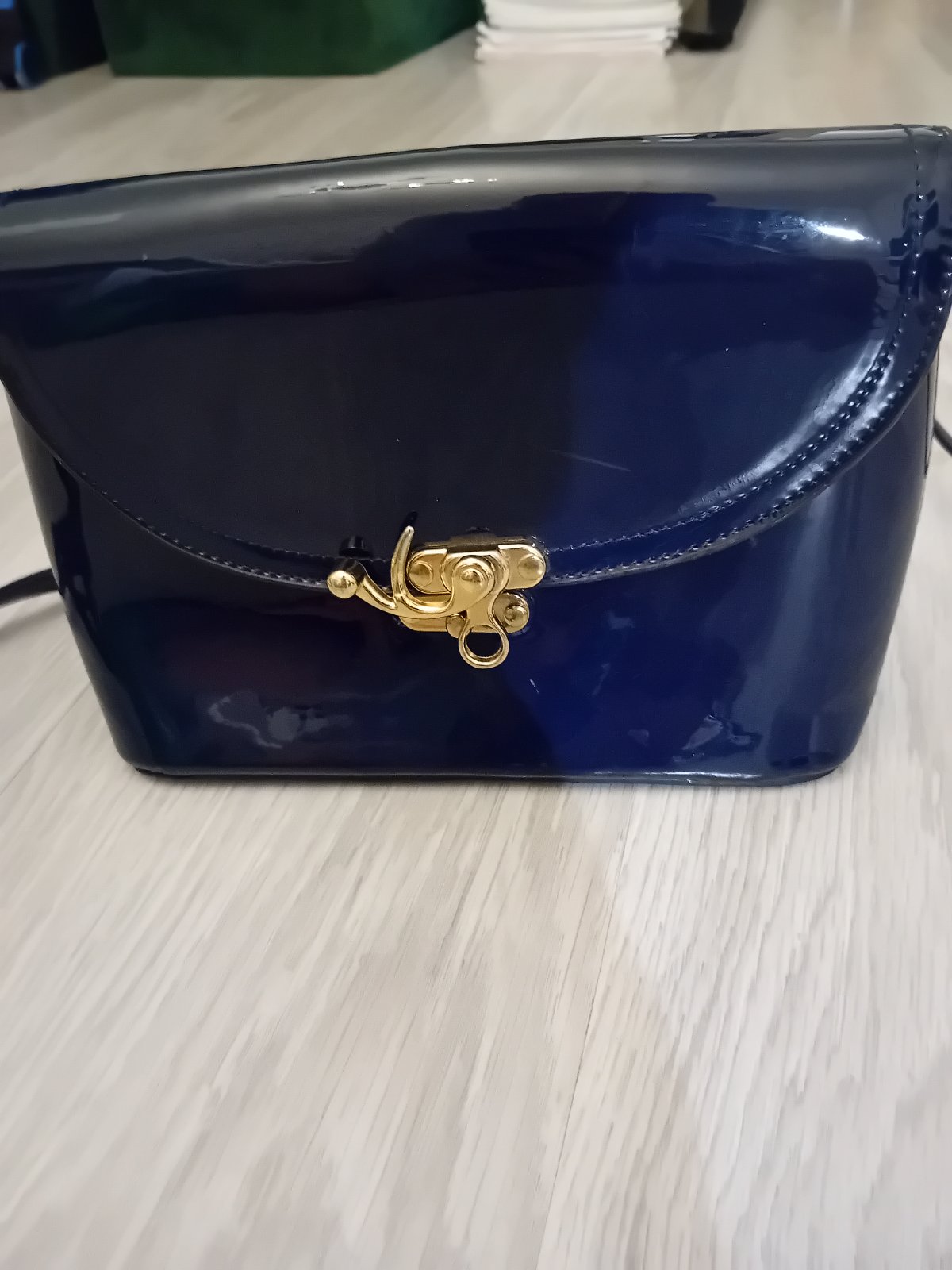 Nadherna velka kozena kabela tmavomodrej farby v kombinacii s ciernou, vo vnutri cervene prevedenie. Ma aj ramienko cez plece len treba dat opravit kovanie, prikladam v taske, prisposobena cena, in...