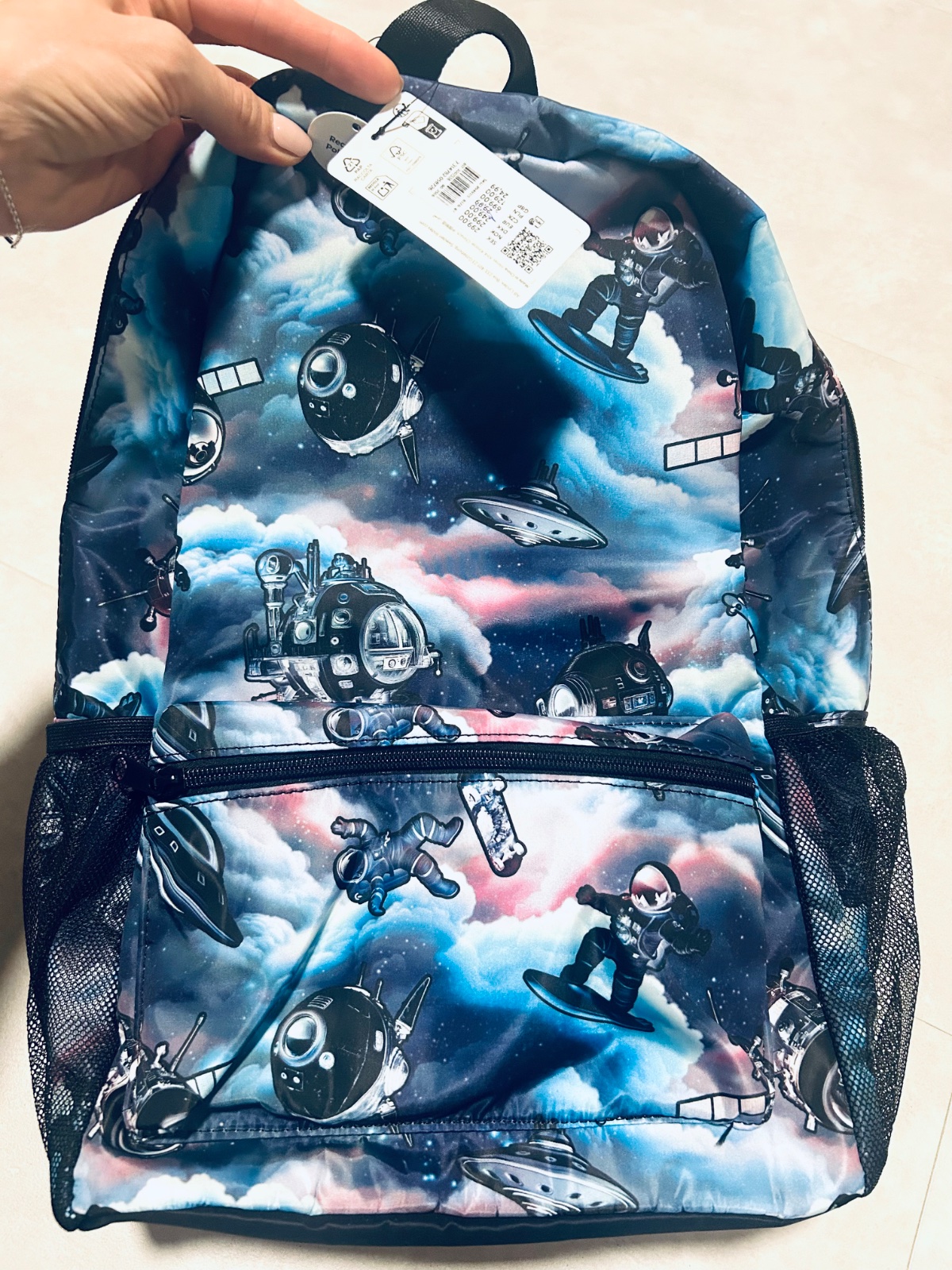 Nový veľký ruksak zn. Lindex Space ❣️- nenosený - krásne farby a top kvalita, akoby lesklý umývateľný povrch, hrubé steny, vnútorné vrecko, bočné na fľaše, krásny motív (kozmonaut, vesmír, satelity)❣️