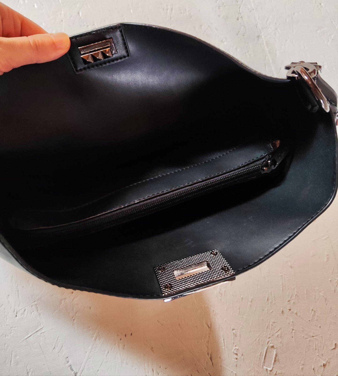 Malá čierna crossbody kabelka s retiazkovým ramienkom. Rozmery: výška 17cm, šírka 26cm, dĺžka ramienka 112cm. Vnútri malé vrecko na zips. Nosená, v dobrom stave.