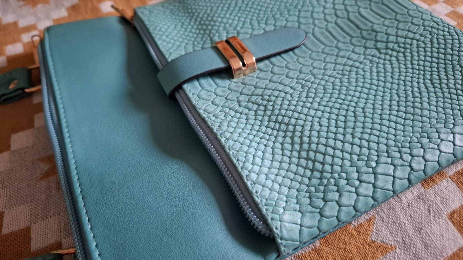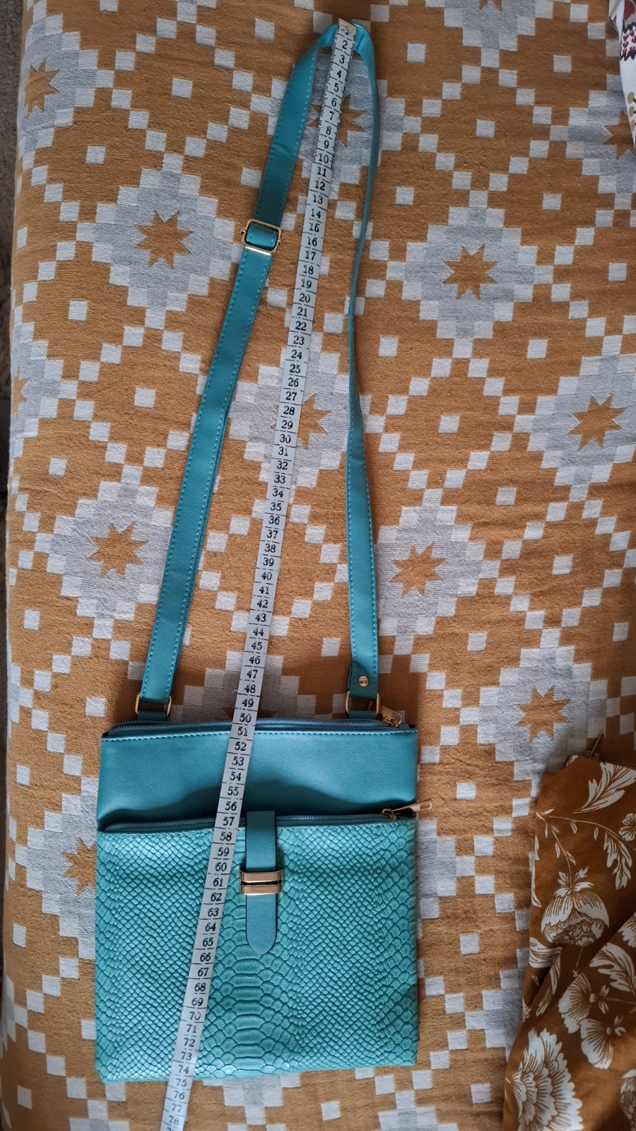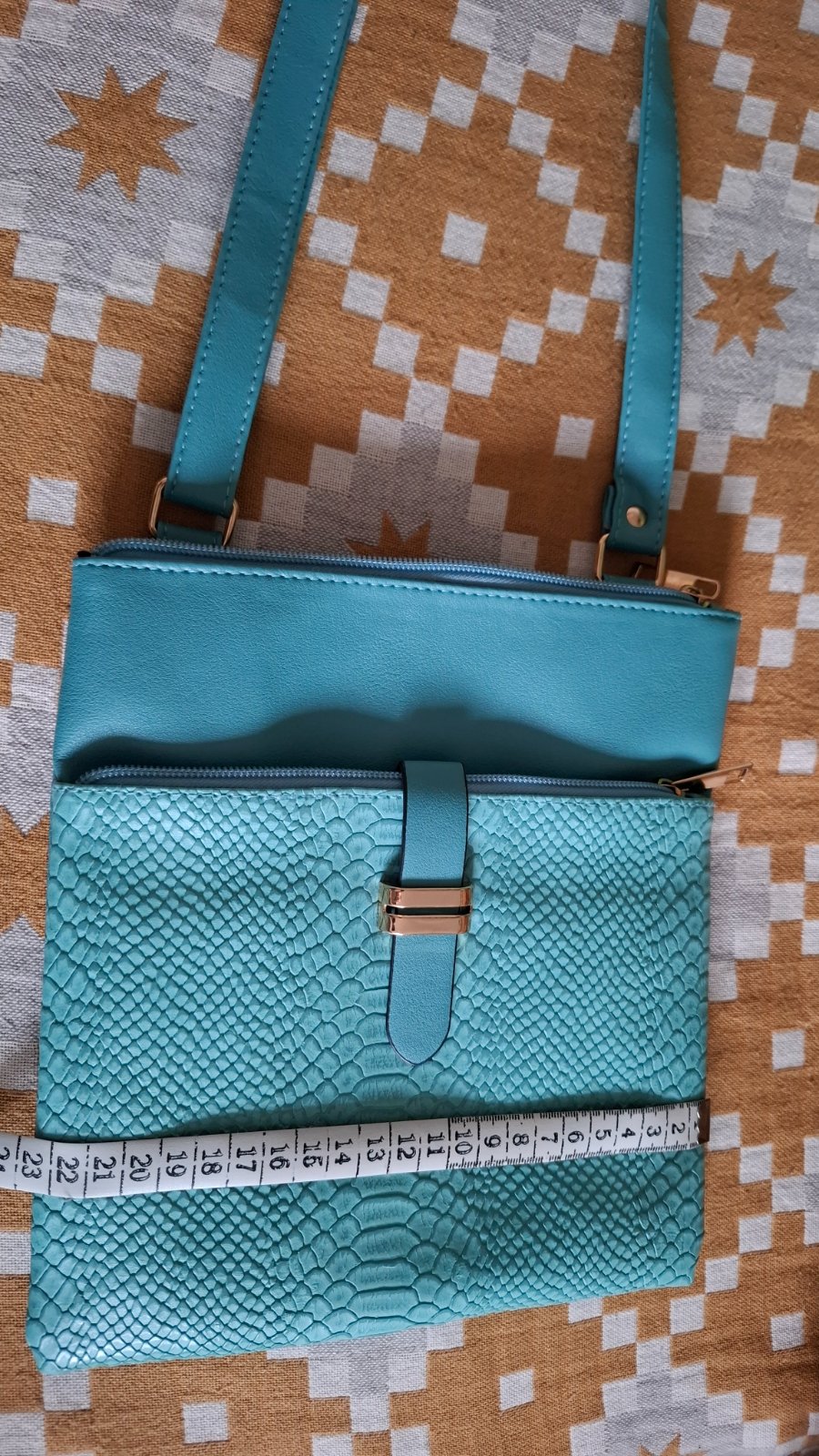Farba - svetlá tyrkysová so zlatými kovovými časťami. Nastaviteľný popruh, 2 vrecká na zips.