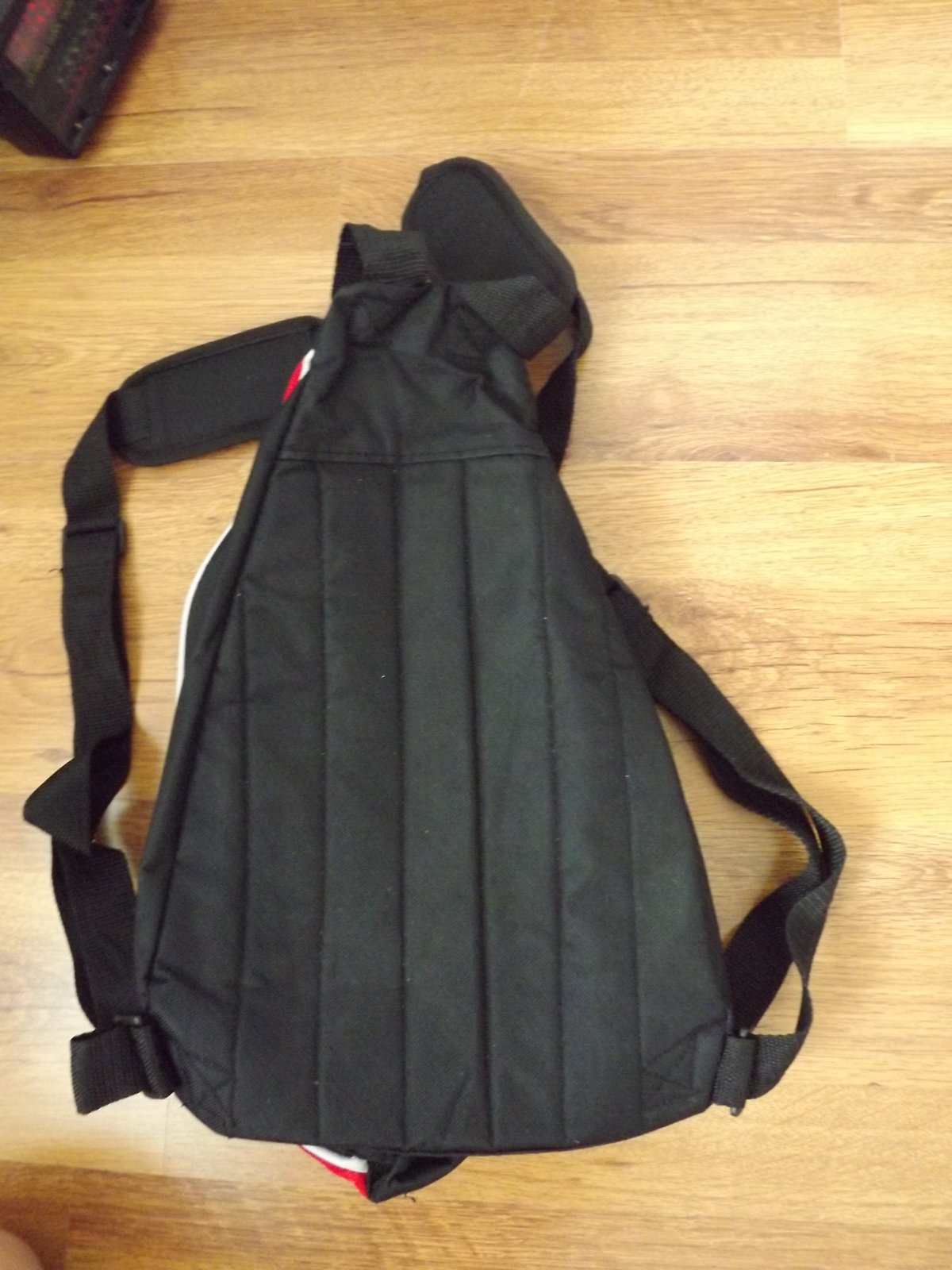 Šikovný detsky ruksak, vnútri vložka na chrbát, da sa vybrať a sedieť na nej, vo vnútri kapsa na fľašku. Minimálne noseny, jediný nedostatok vid foto - zalomené pásiky na predné kapse.