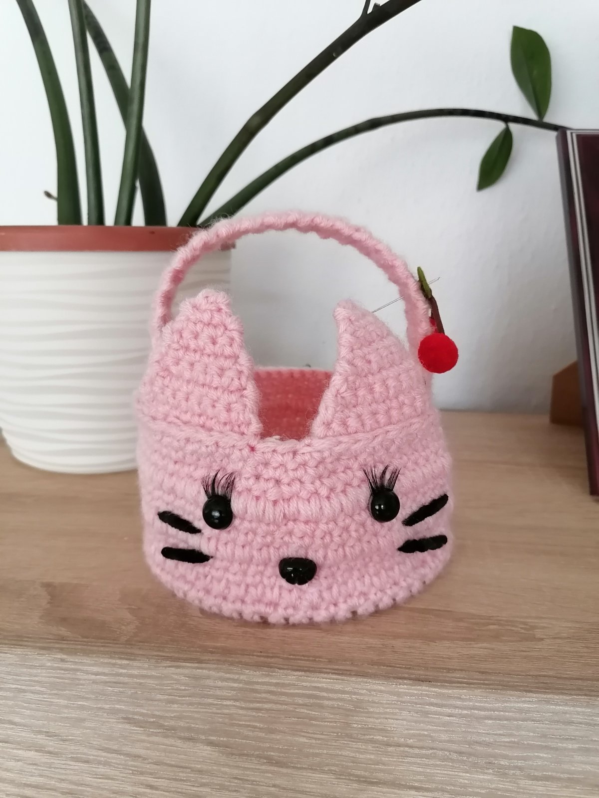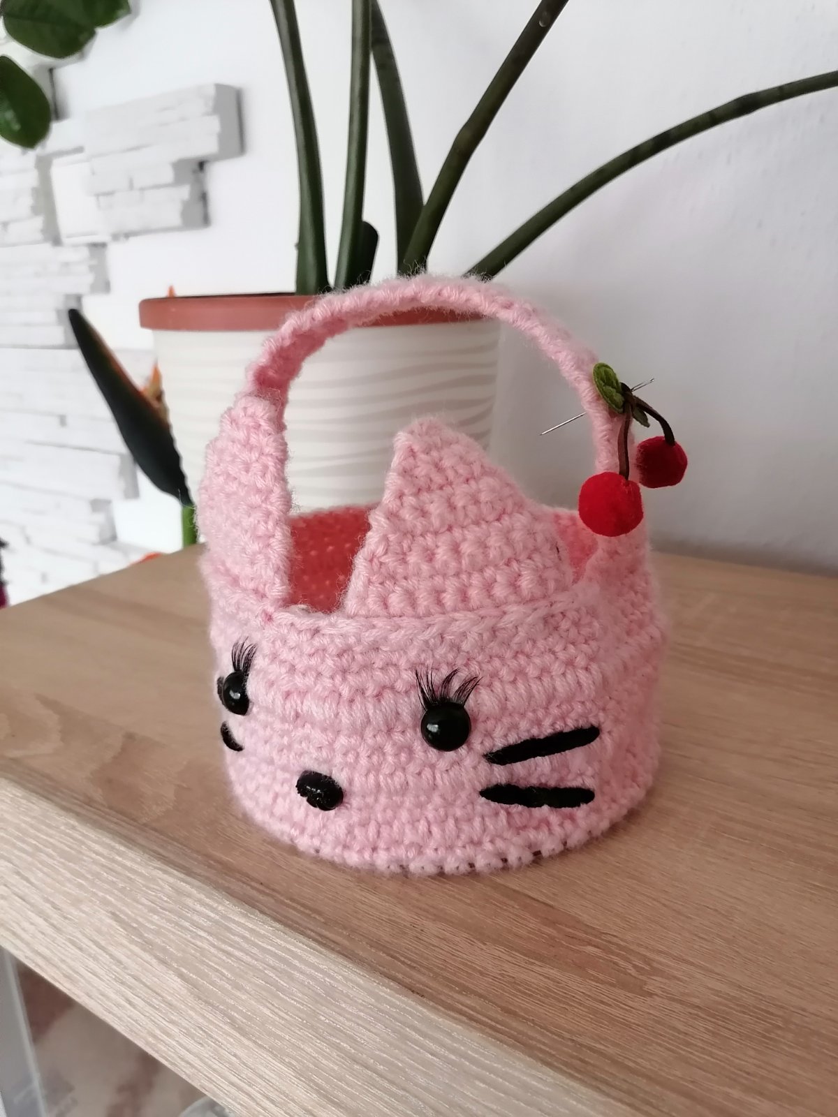 Ručné háčkovany košík s pevným dreveným dňom o veľkosti priemer 15 cm v tváre mačičky.