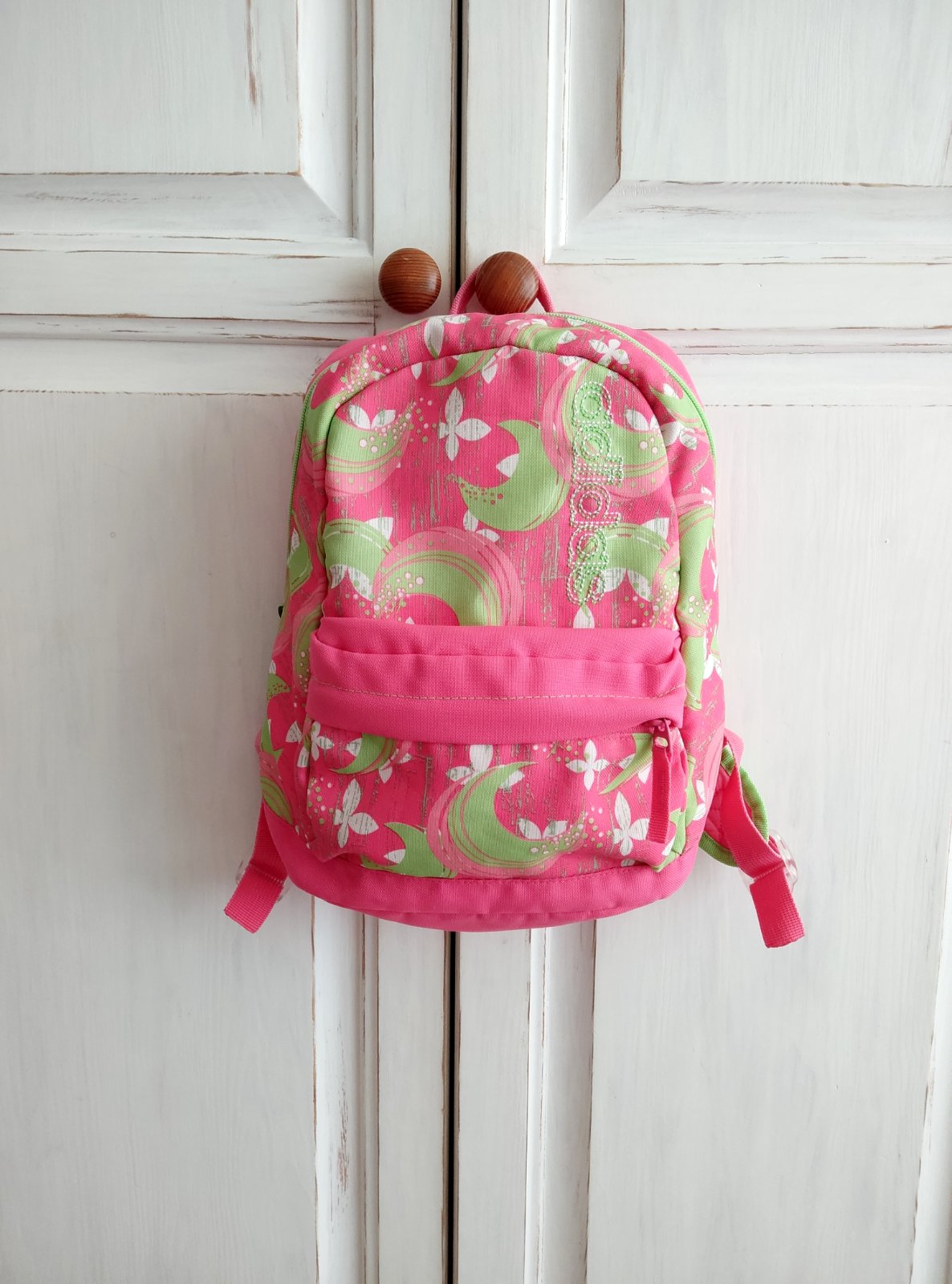 Ruksak vzorovany, ruzovo červeny pre dievčatka, sirka je 23 cm, hlbka, 10 cm a vyška je 30 cm,
