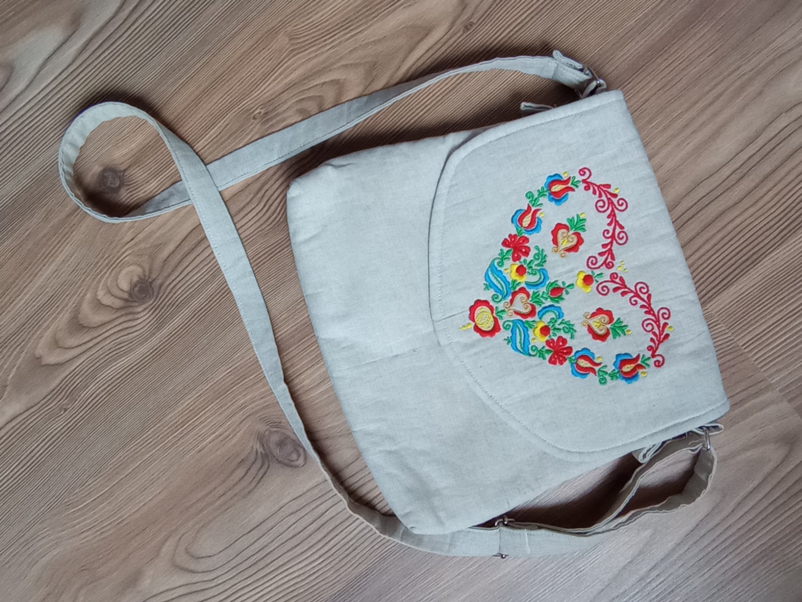 Krásna ľanová kabelka s bavlnenou podšívkou s bočným vreckom vo vnútri. Zapínanie na magnetický cvok. Popruh je nastaviteľný.