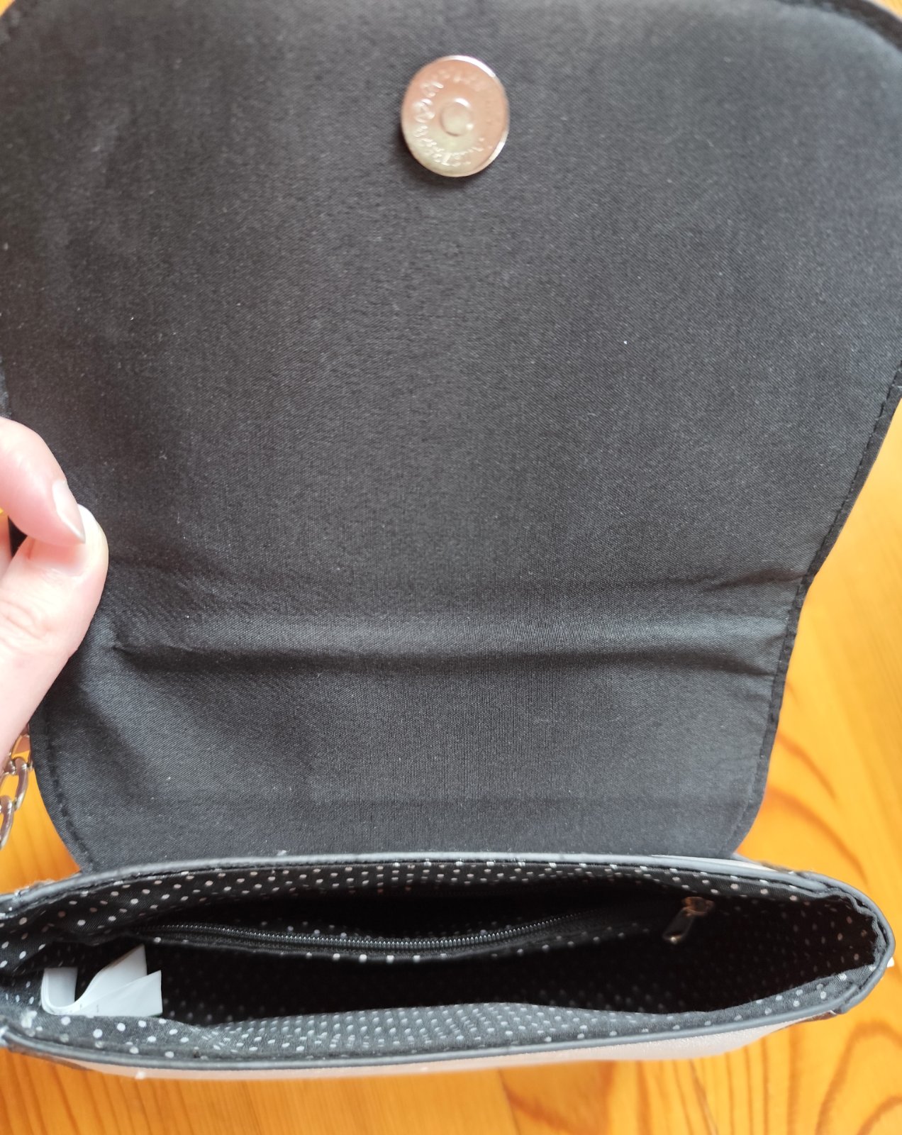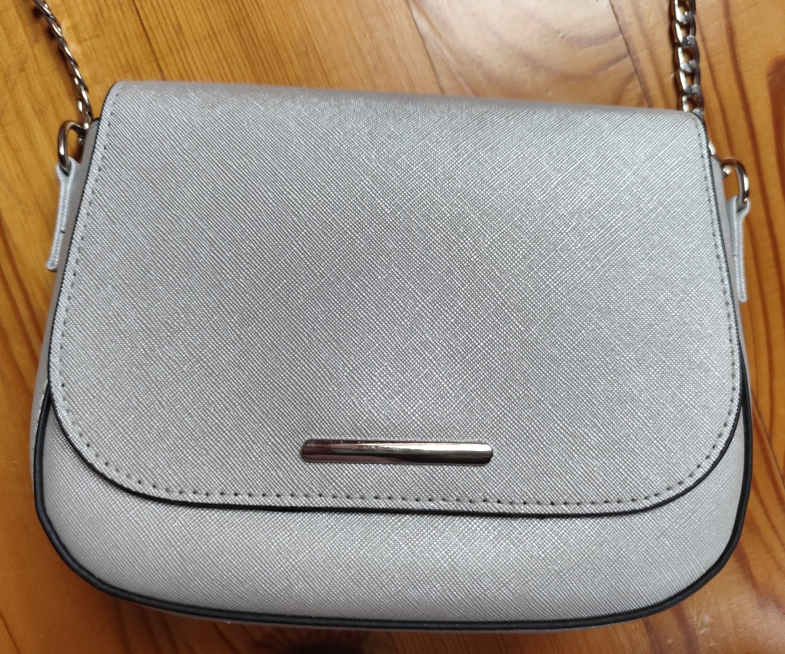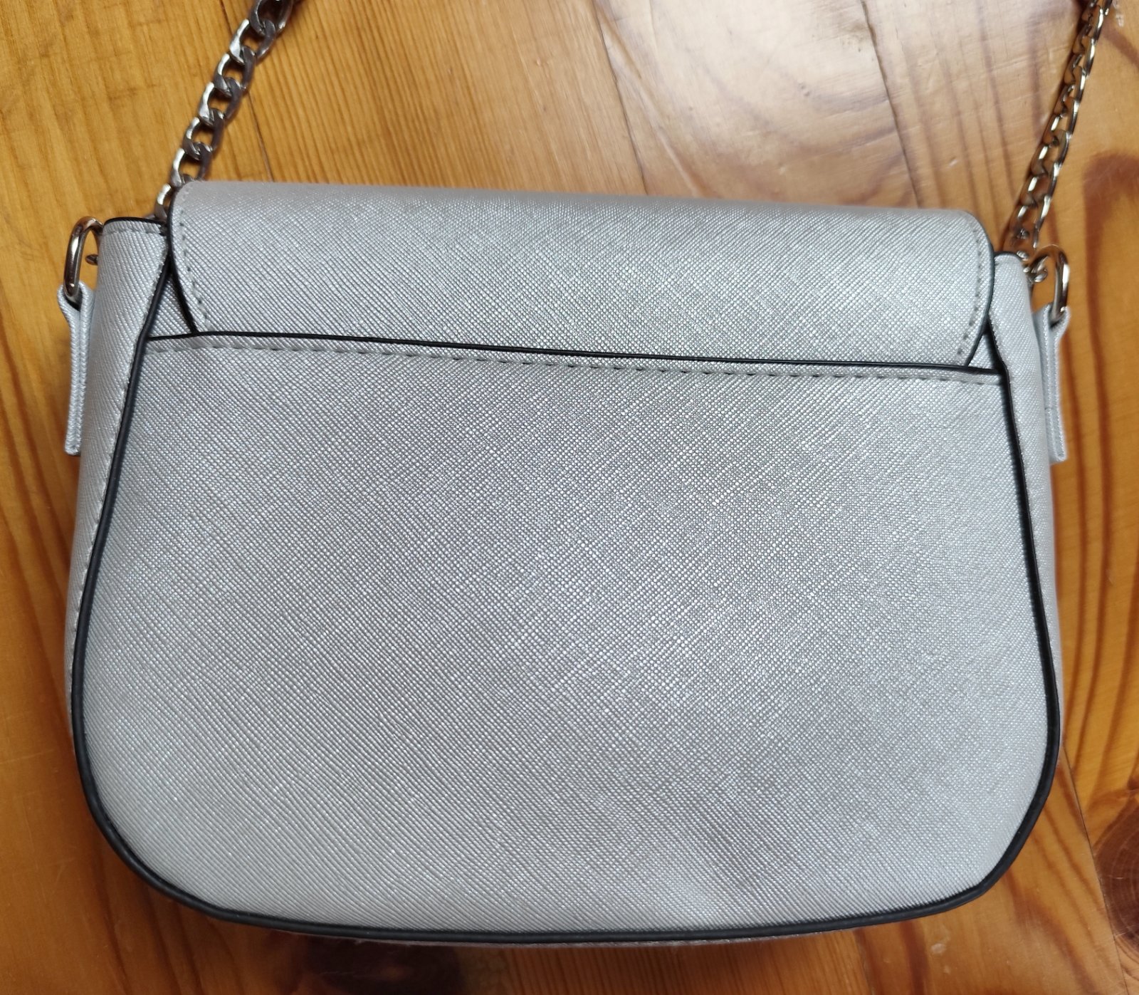 Strieborná kabelka/taška typu 'crossbody' (cez telo) s nastaviteľným popruhom. Vo vnútri sa okrem hlavného ukladacieho priestoru nachádza aj jedno malé vrecko na zips.