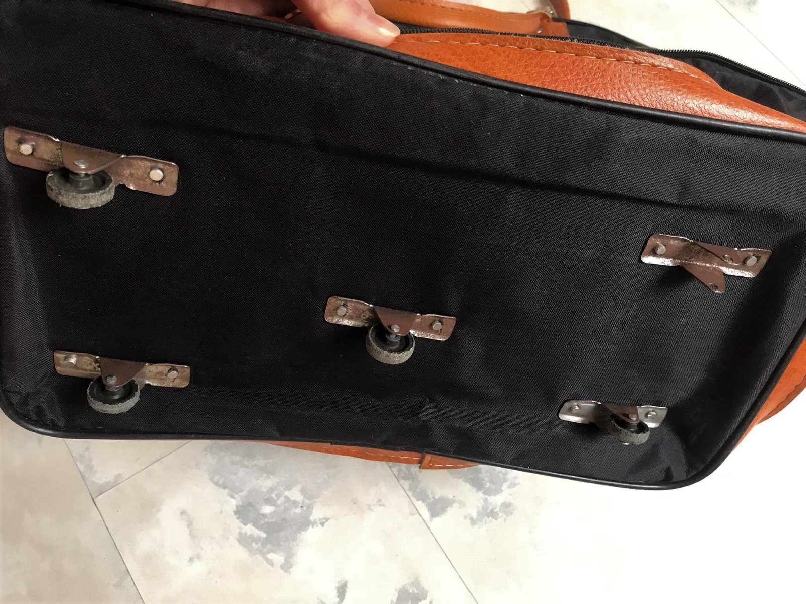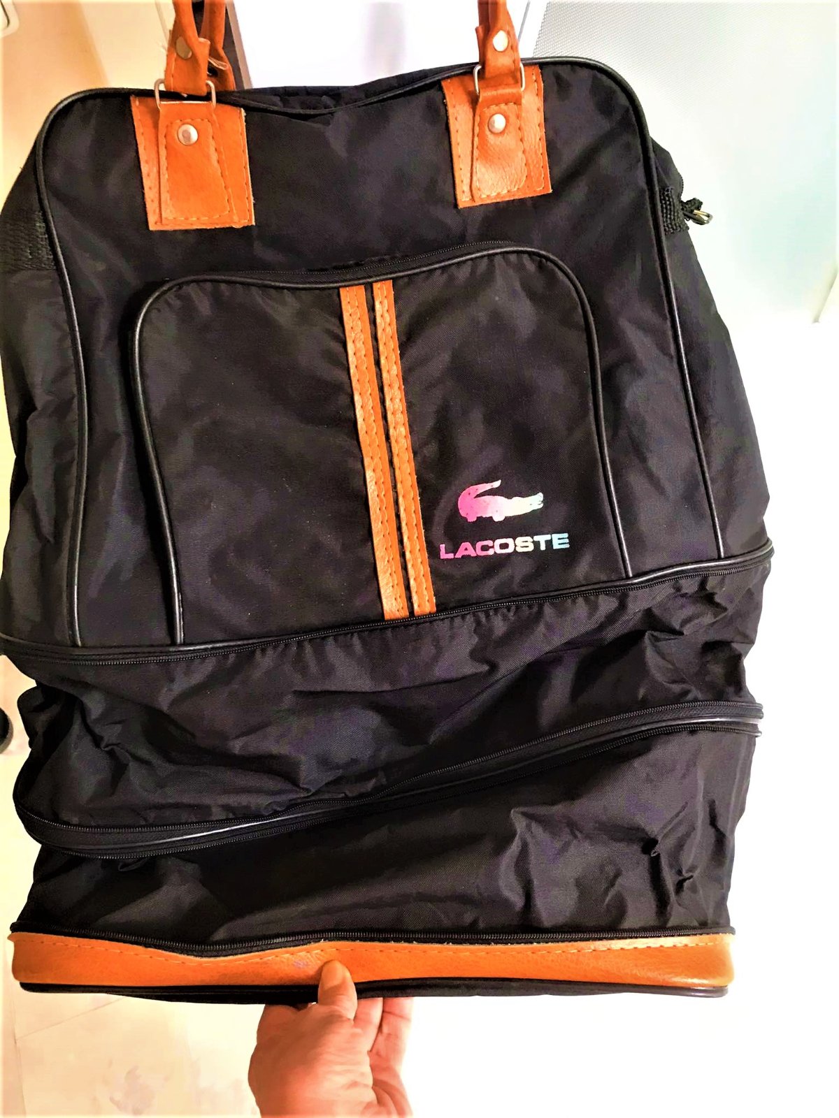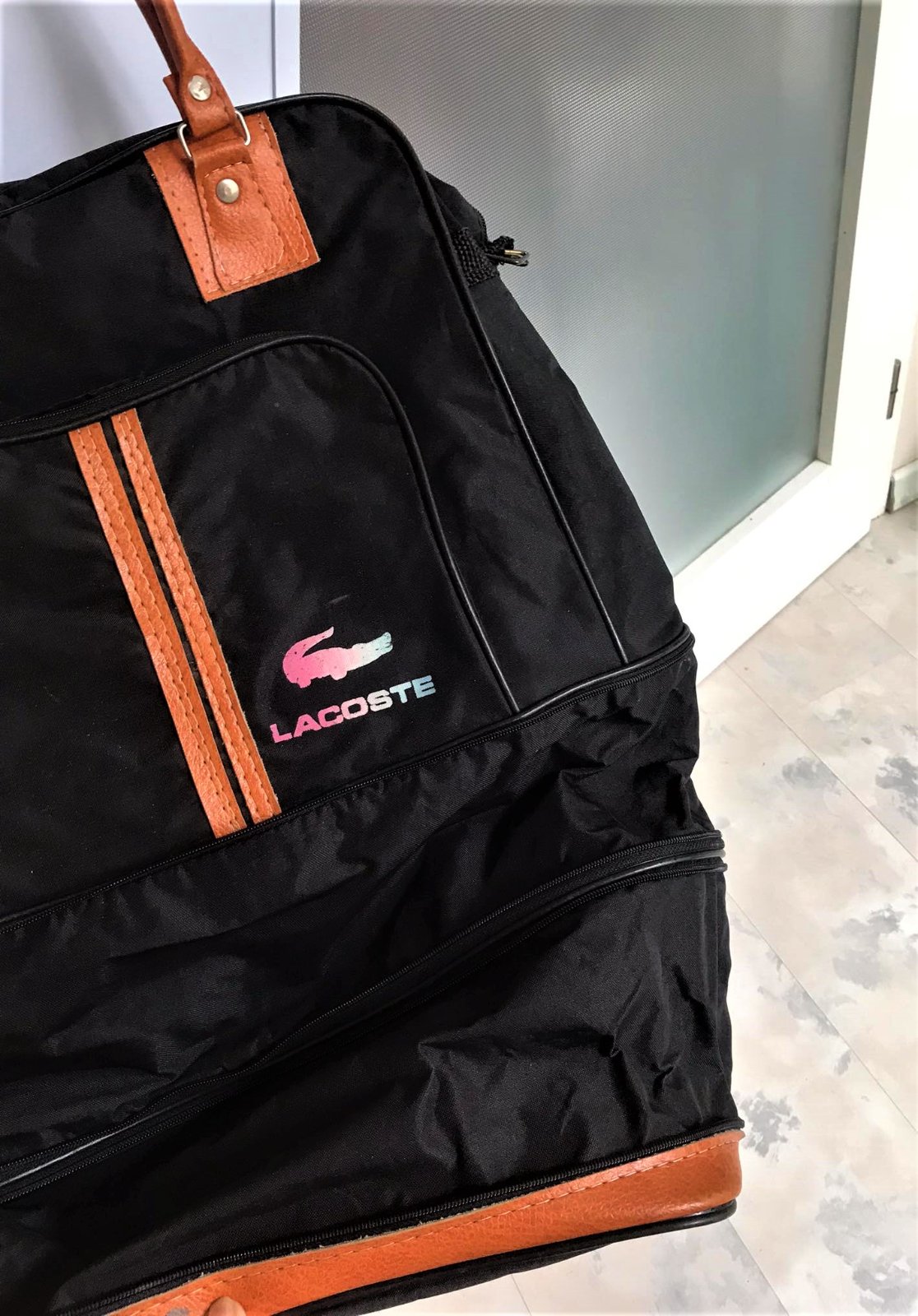 min.používaná,ľahká a skladná cestovná taška,veľkosť vhodná aj na palubu lietadla - ako príručná batožina a vojde do nej veľa vecí,na kolieskach,avšak 1 koliesko chýba,čo sa dá opraviť ( nafotené ), veľmi dobre sa čisťí,pevná impregnovaná látka a kvalitné švy,3 varianty veľkosti,viď 2 zipsy - na úpravu výšky tašky= podľa potreby, na boku priestranna kapsička so zipsom,či je to originál to neviem,nakoľko sme ju dostali a neviem to potvrdiť,či sa jedná o originál alebo nie....