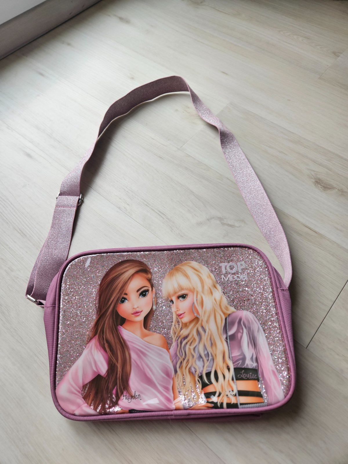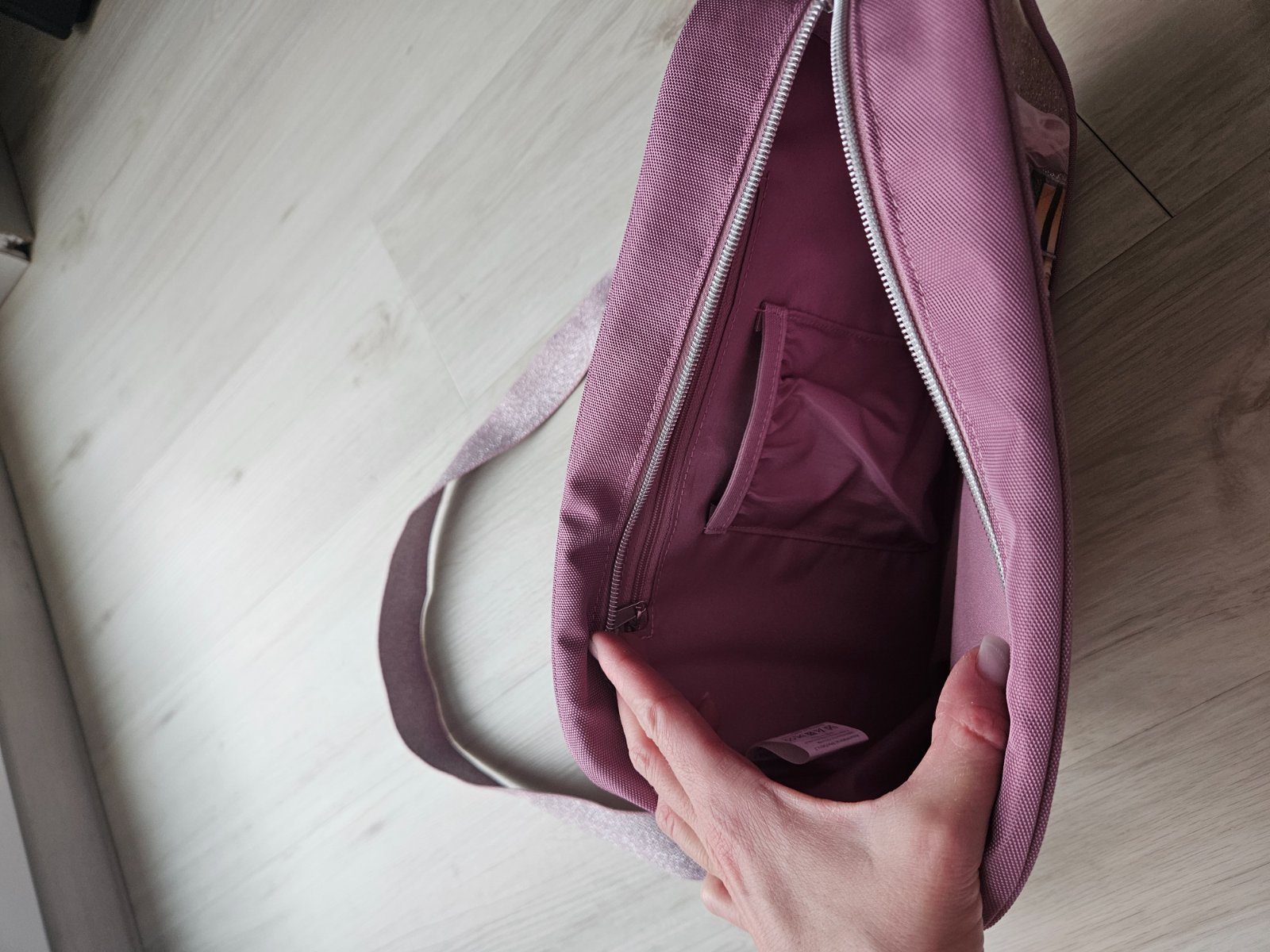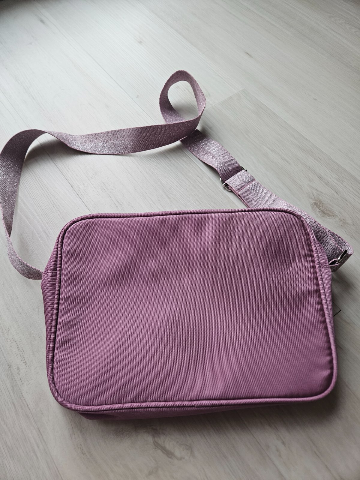 Fialová taška na plece, používaná, obrázok ošúchaný, čo je zohľadnené v cene.