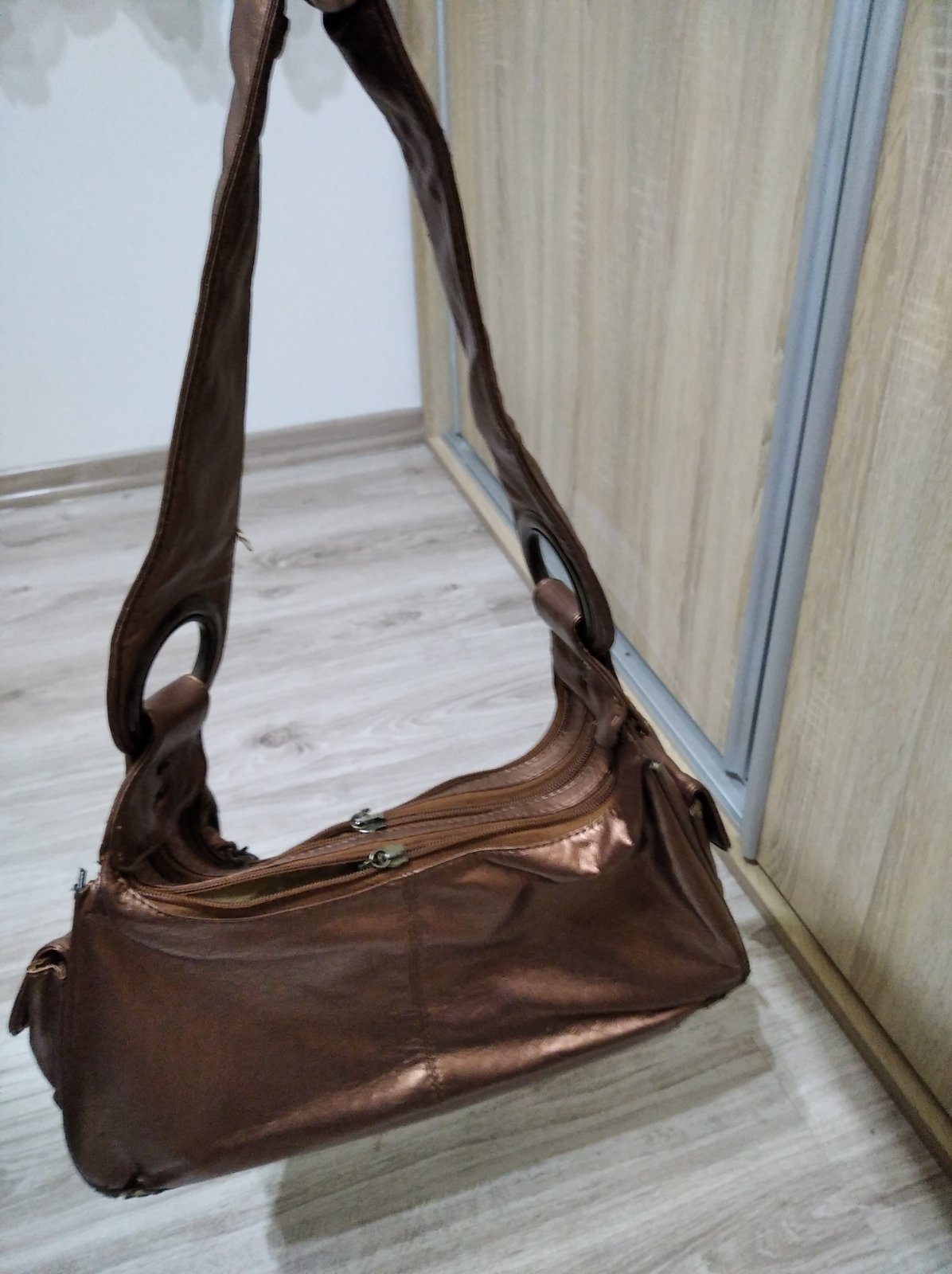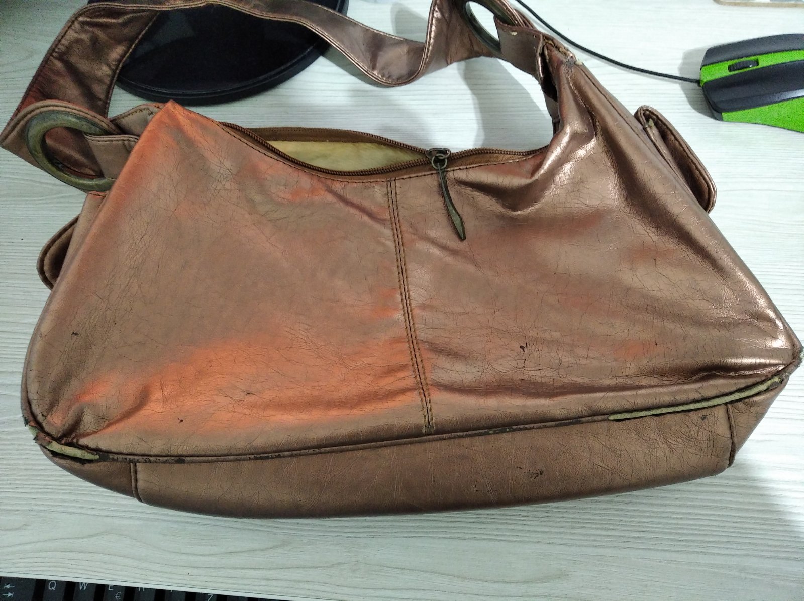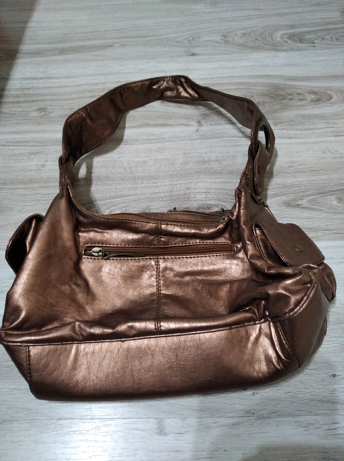 Kabelka metalická. Veľkosť: šírka 33cm, výška 47cm s rúčkou. V strede sú tri zipsy, jeden je nefunkčný, na rúčke zo spodnej časti sa začína olupovať a na niektorých miestach spodnej časti je ošúpaná koža.