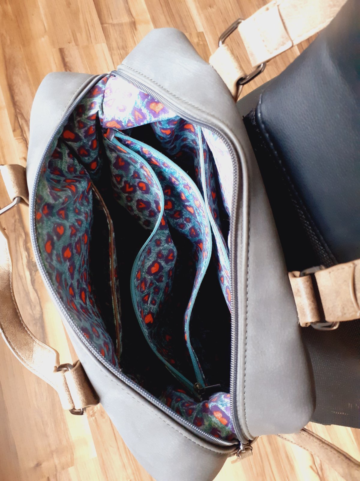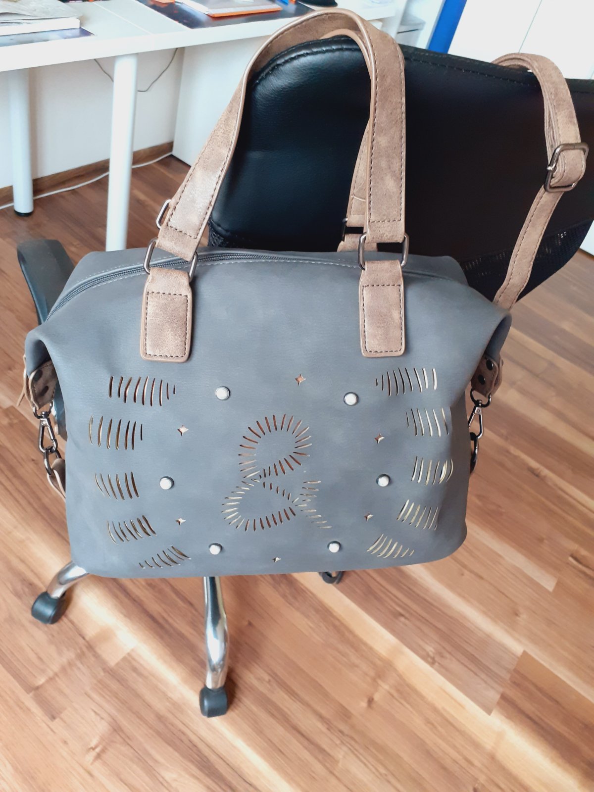 Krásna, stredne veľká sivo-hnedá kabelka, nevyužitá, nepoškodená, zapínanie na zips, vnútri veľké stredné vrecko a 2 x vrecko na bokoch, šírka 35 cm, výška 28 cm, hĺbka 18 cm, nosenie v ruke alebo na ramene - nastaviteľná dĺžka ramienka.
