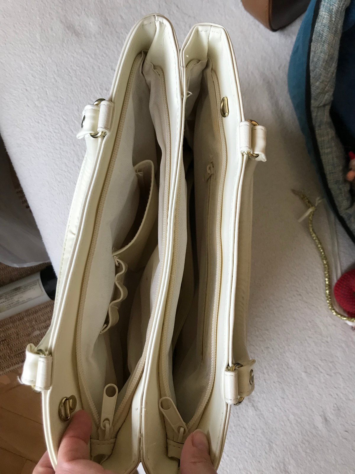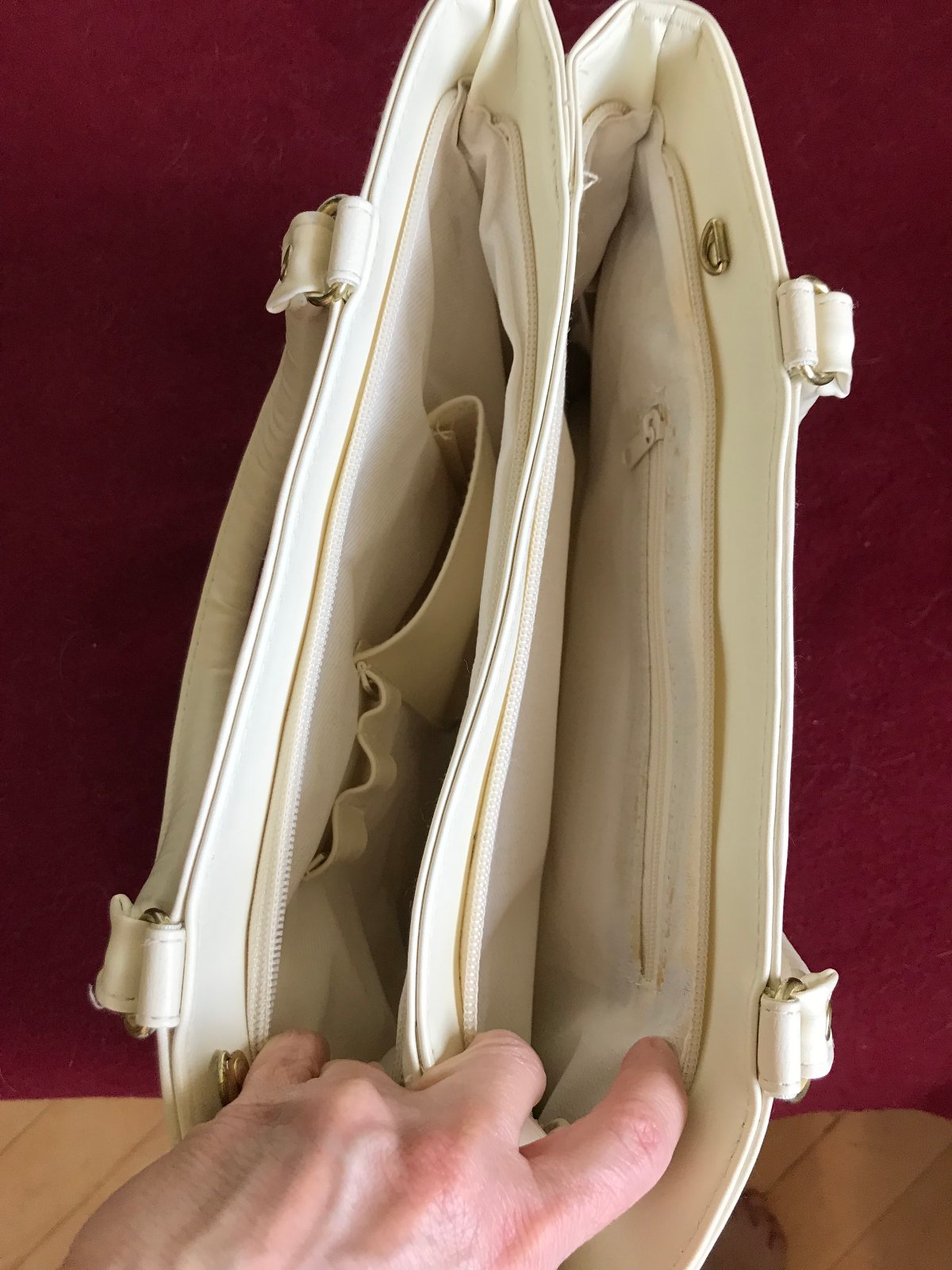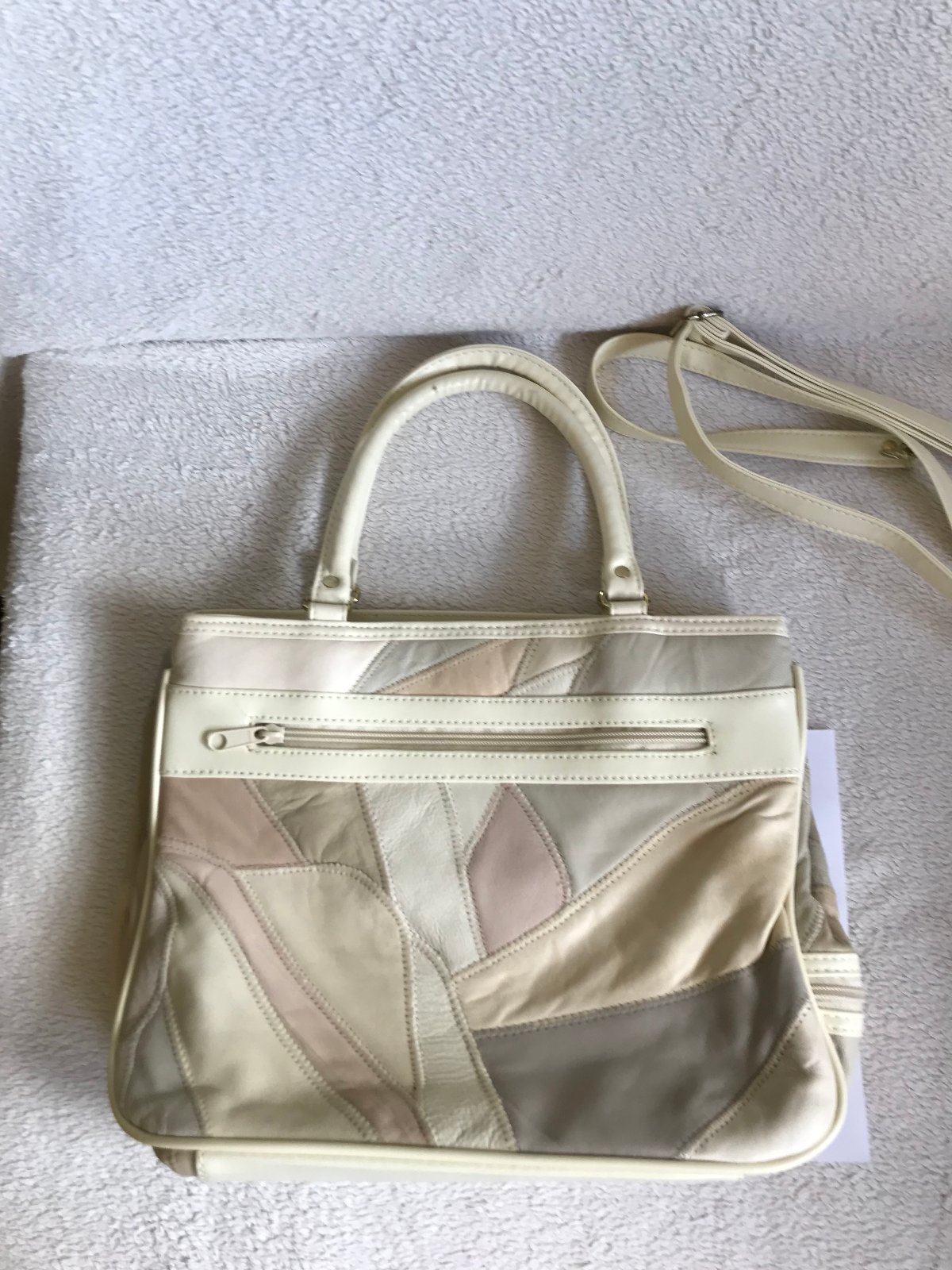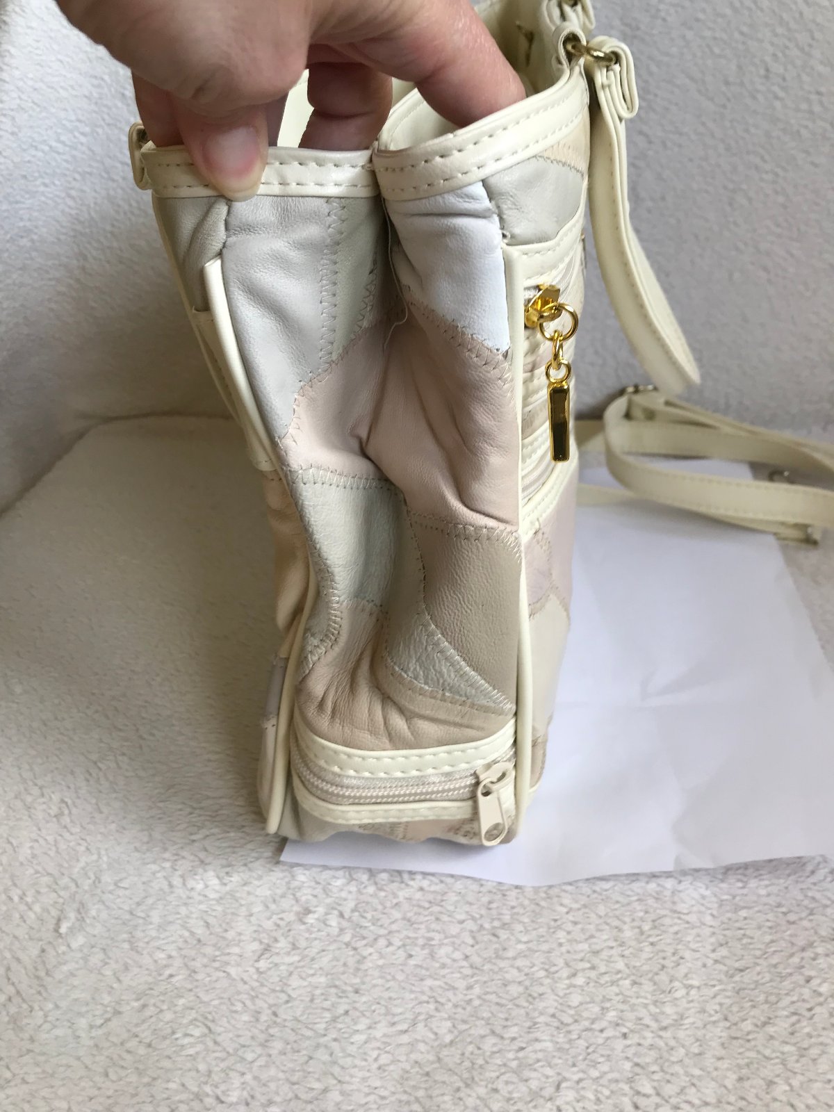 Predám béžovú koženkovú "patchwork" kabelku, do ruky/na plece. Skoro nová, málo nosená. 2 hlavné vnútorné priehradky na zips (1 - s vnútornou priehradkou na zips; 2 - s priehradkou na mobil a perá). Vonkajšie priehradky: 2 veľké, 2 stredné na prednej strane, 1 malá/hlboká na boku. Vada: žlté fliačky okolo zipsu vnútornej priehradky - viď foto.