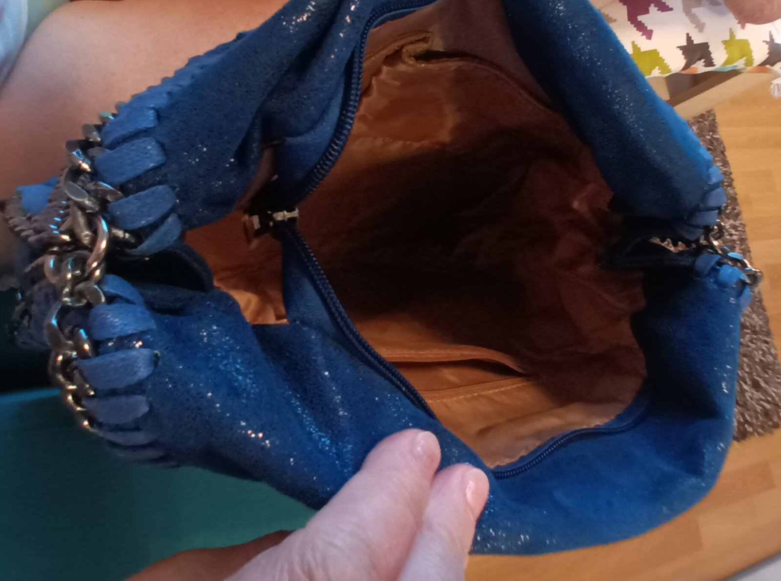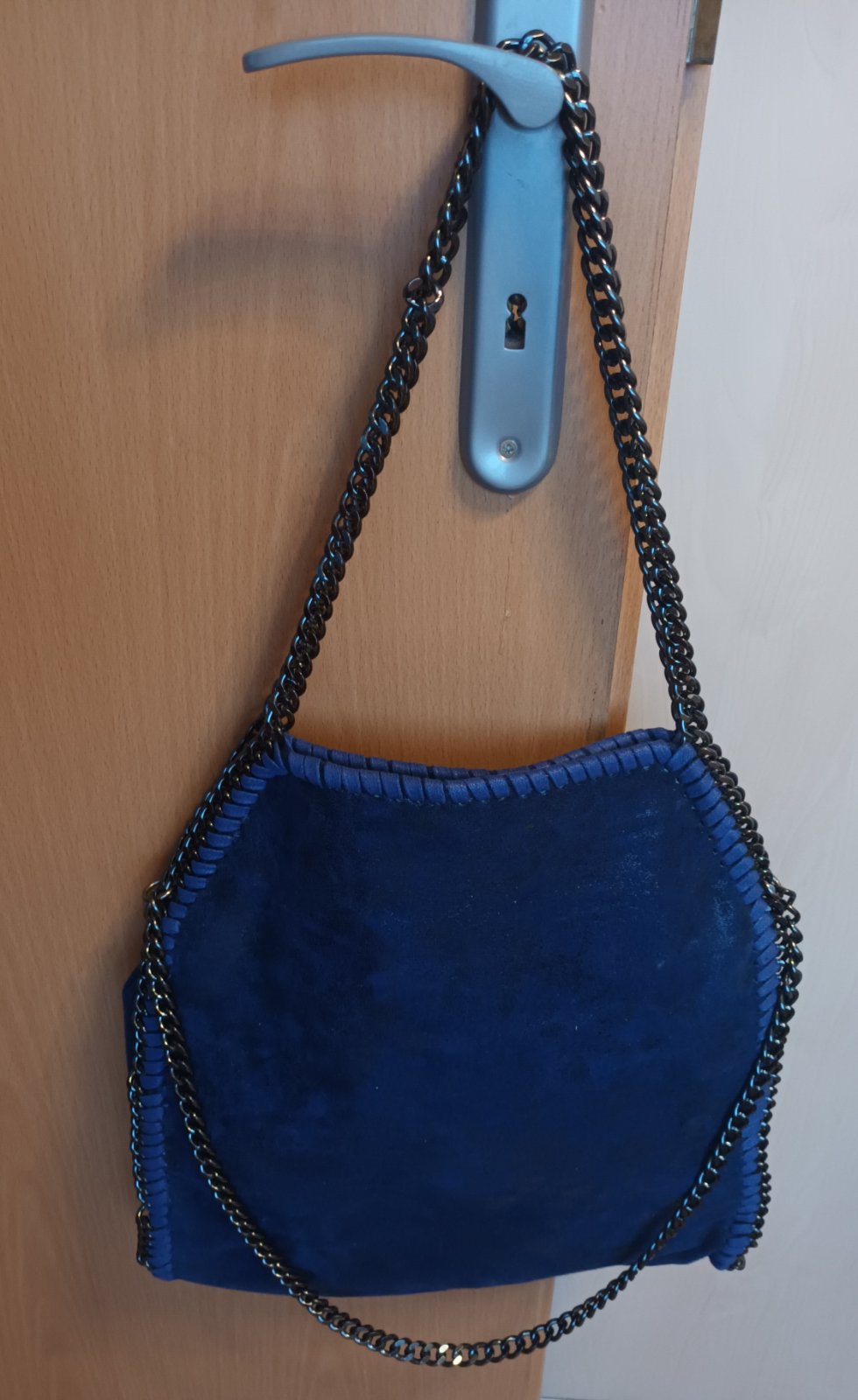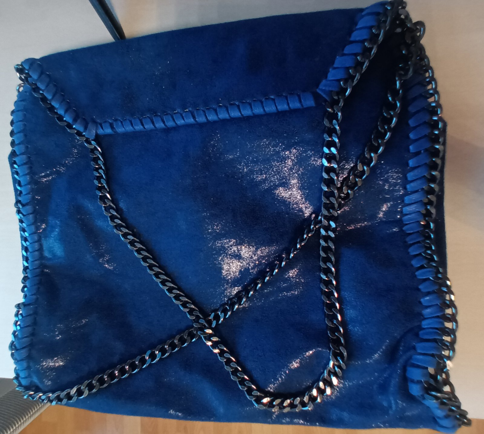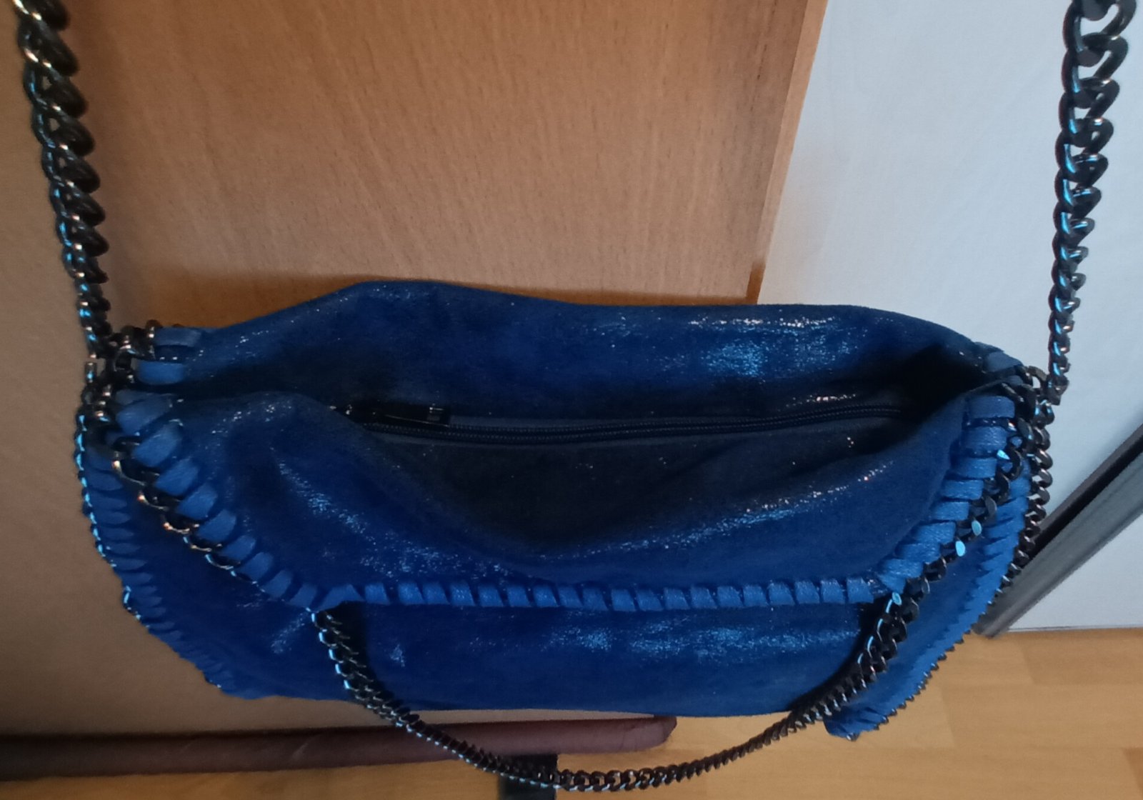 Predam peknu, funkcnu, neposkodenu vacsiu kabelku kralovskej modrej farby s trblietkami. Rozmery pri pouziti dlsieho kovoveho ramienka 37 x 37 cm, po zlozeni na dve kovove ramienka 37 x 31 cm.
