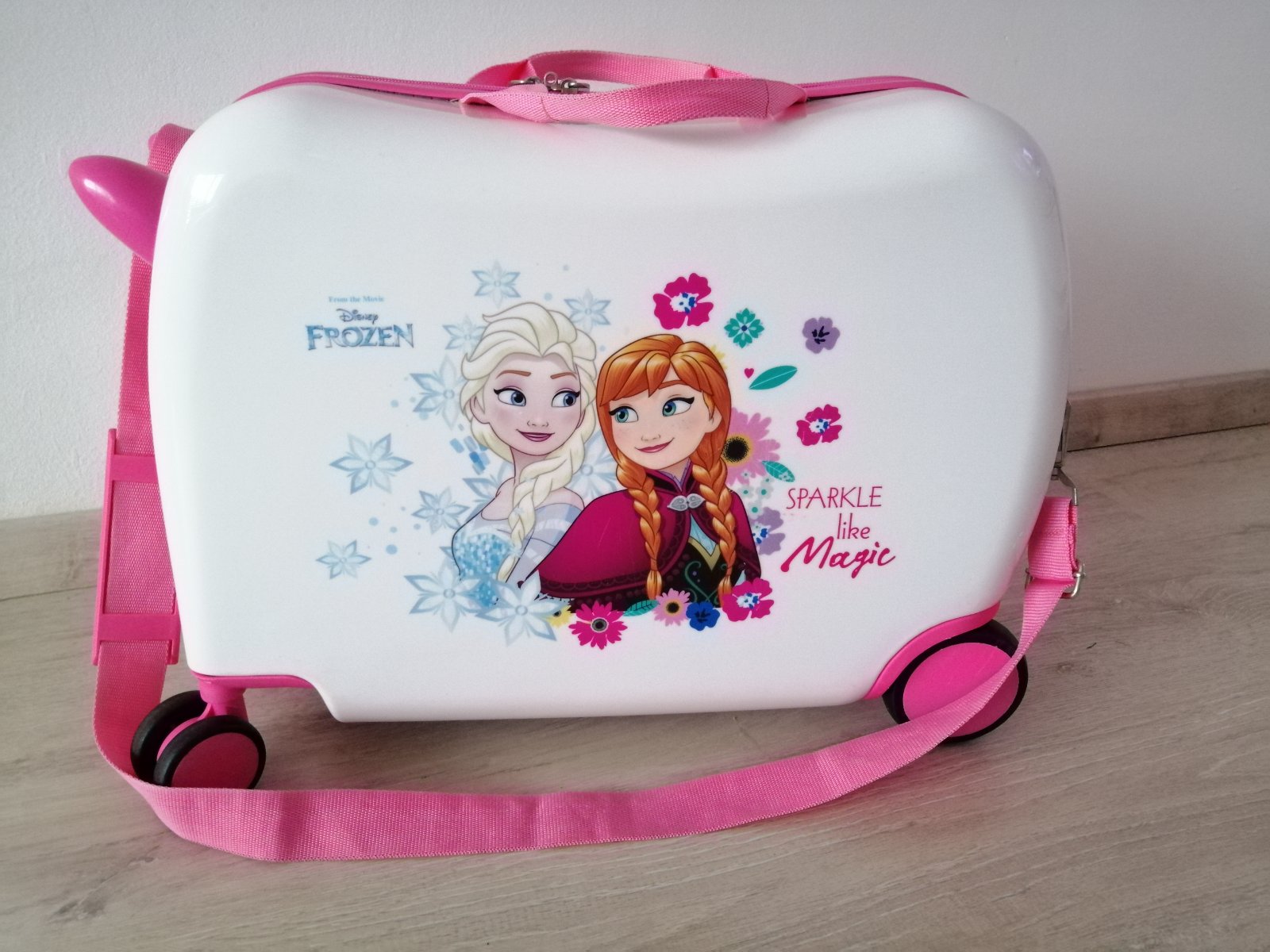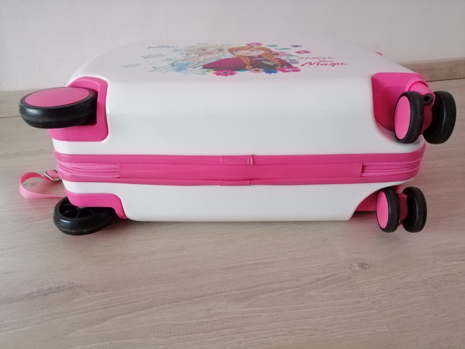 Detský kufrík na kolieskach Disney - Frozen Elsa a Anna. Kufor má veľmi kvalitný a pevný obal odolný voči nárazu a poškodeniu. Maximálna doporučená nosnosť je 30 kg, čo odpovedá veku dieťaťa 3 - 7 rokov.