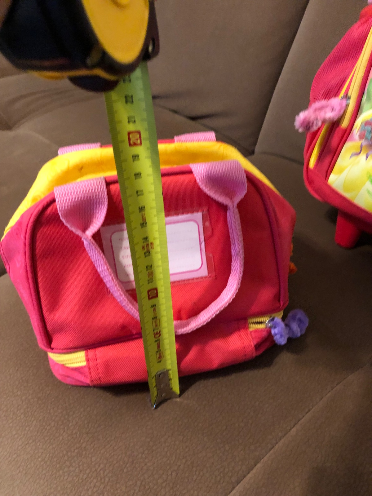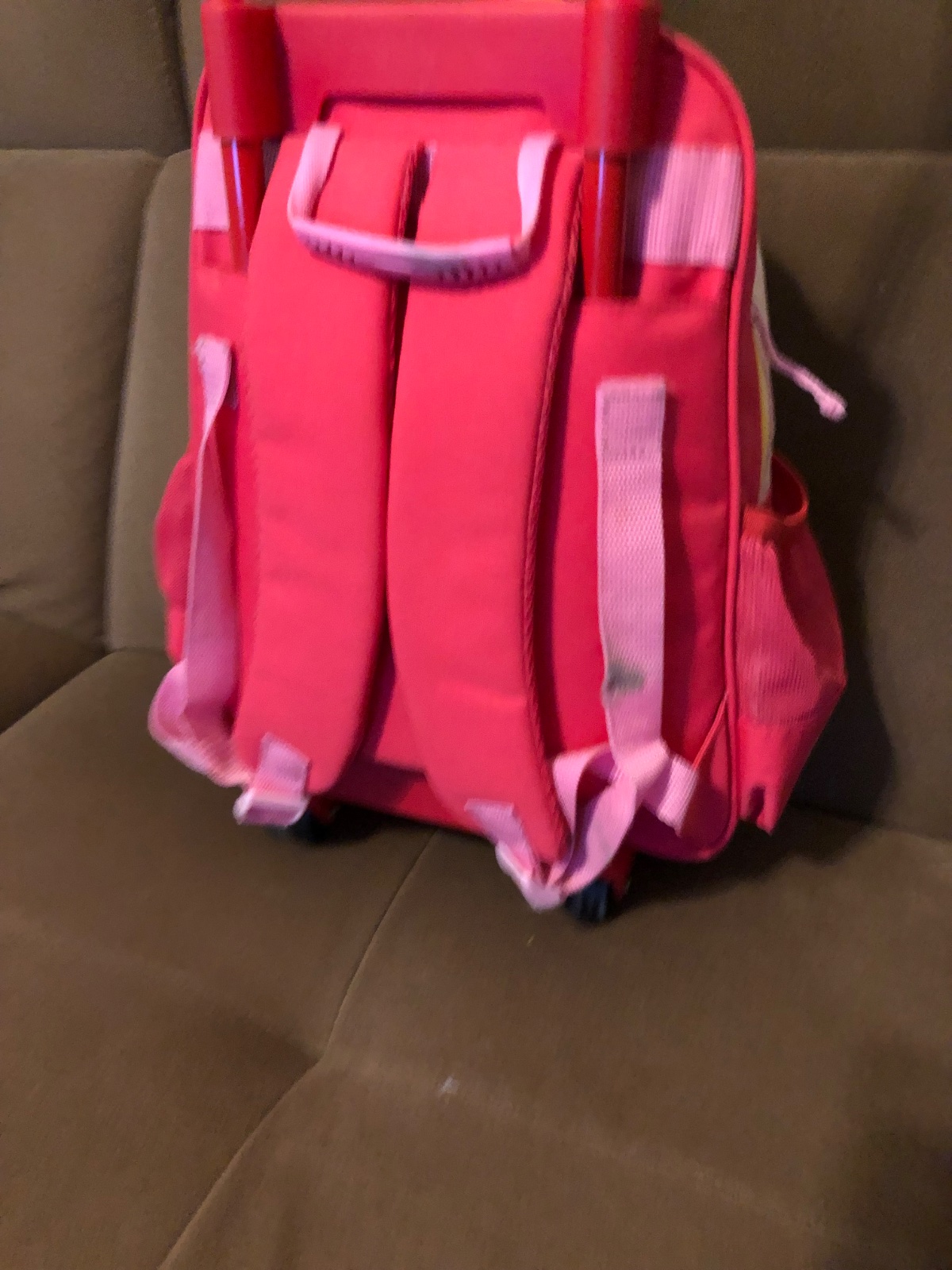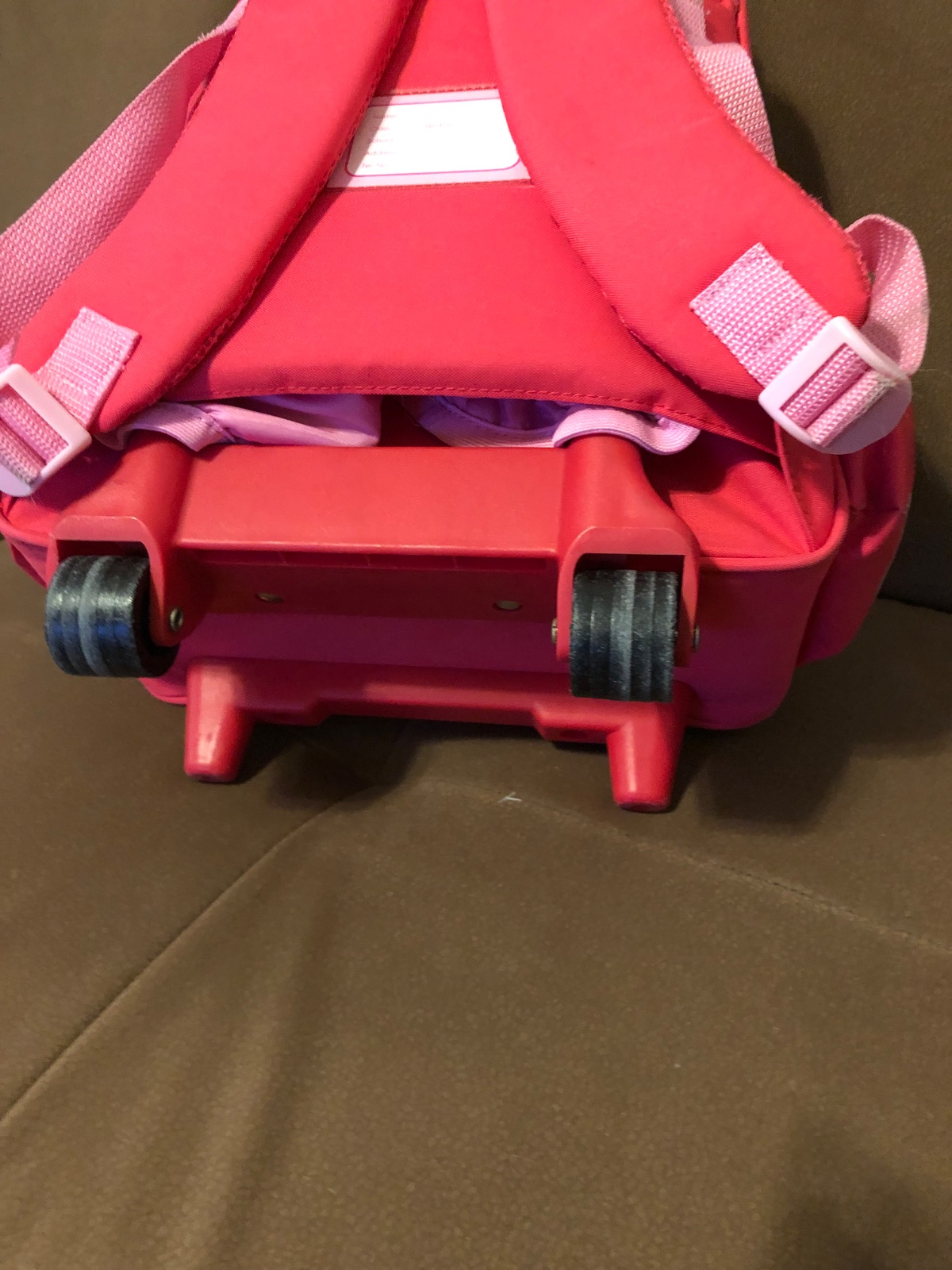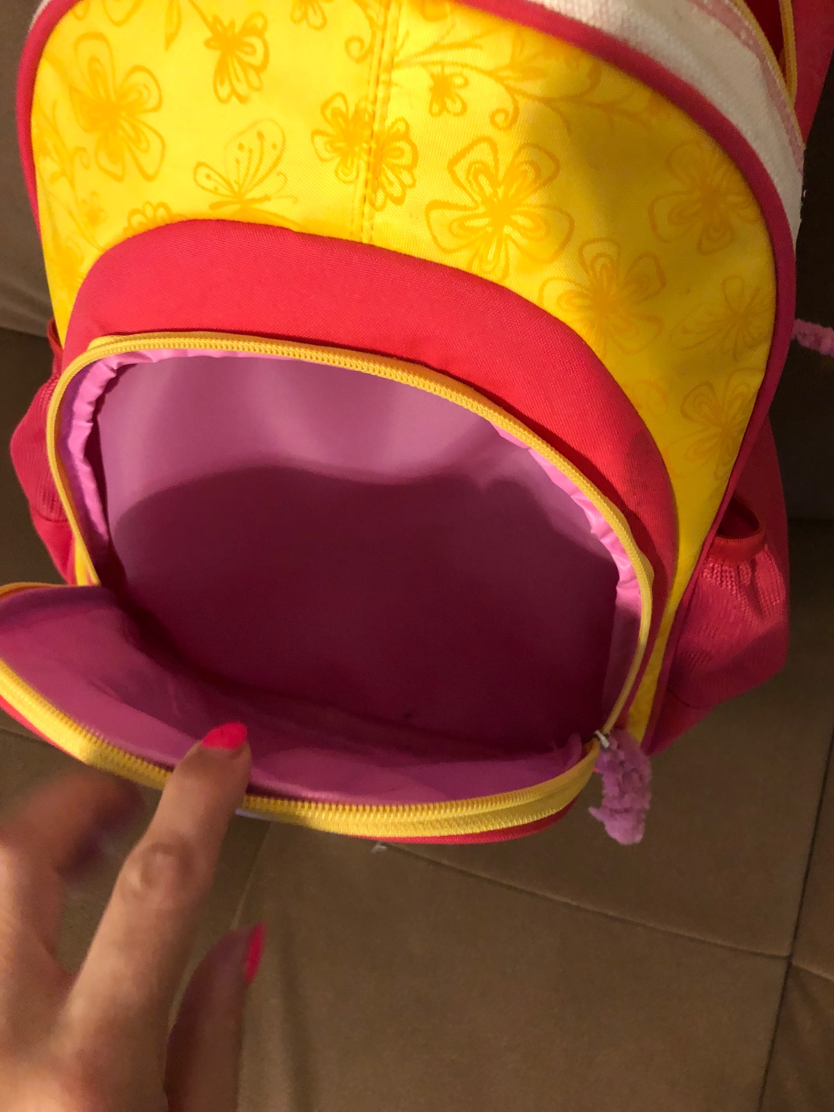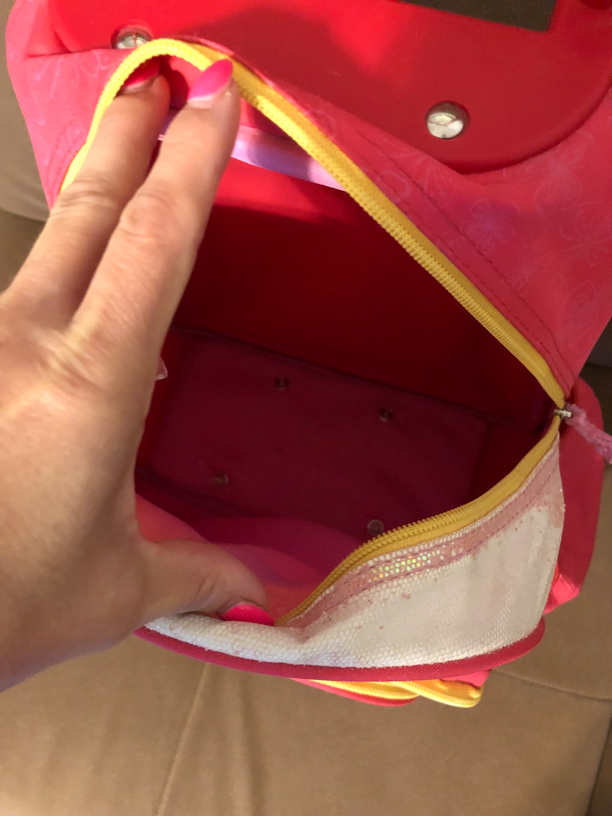 Zipsy sú funkčné, len háčiky sú nahradené plstenými drôtikmi. Okolo prvého zipsu kufríka opadané trblietky.