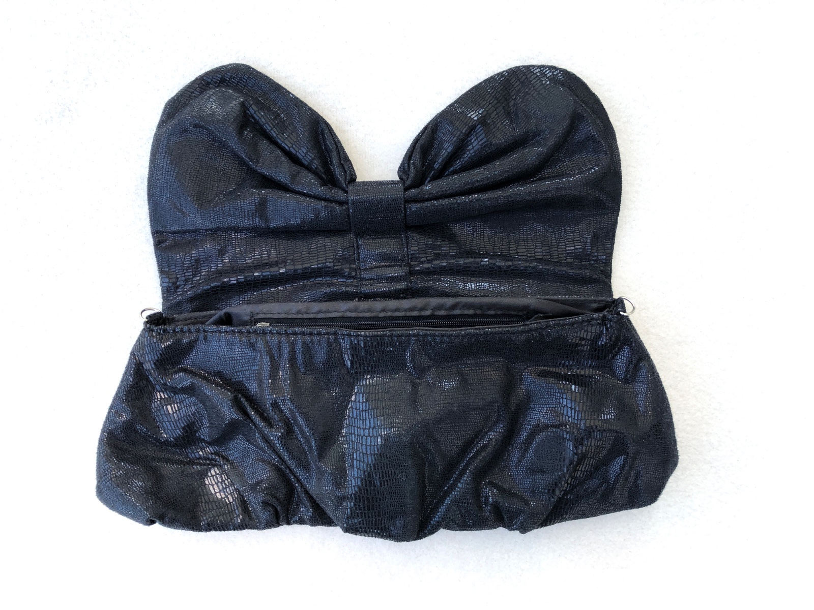 Vnútro je saténové, má jedno zipsové vrecko a jednu plochú otvorenú priehradku.