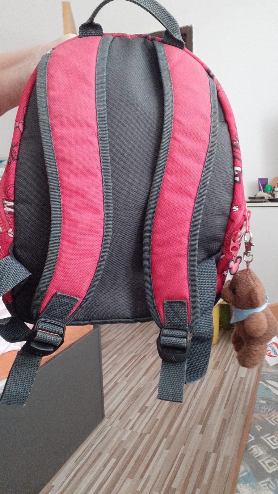 Zachovalý ruksak, je skôr ružovo červenej farby, s 2- bočnými vreckami. V. - 35cm, Š. - 25cm
