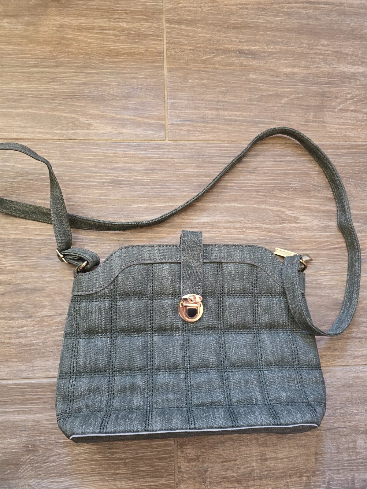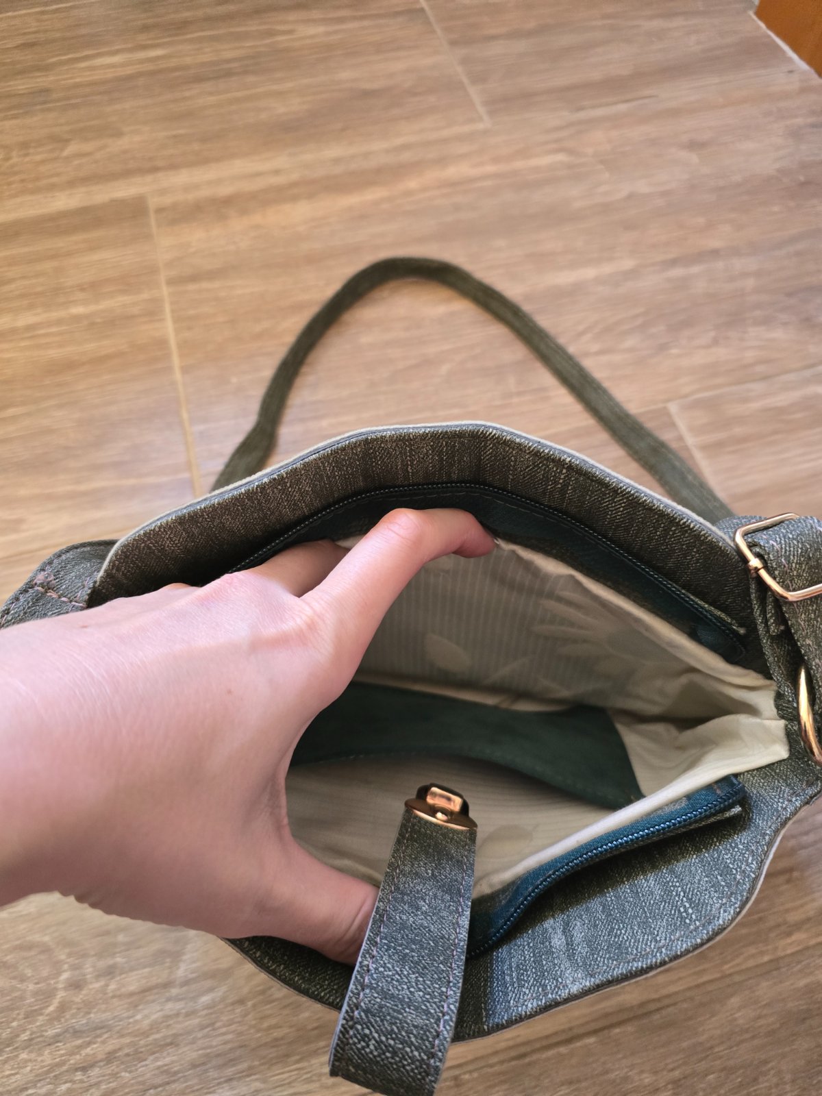 Šikovná mala vo farbe khaki, viac prehradok. Vpredu pár fliačikov. Bolo by treba vykefovať. Nosena pár krat. Rozmer 13,50 cm x 12 cm