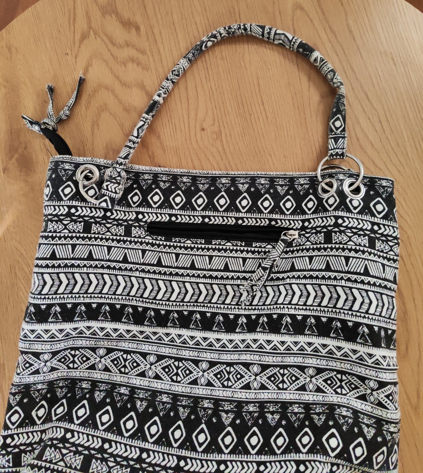 Predam krasnu kabelku cierno-bielej farby, par krat len nosenu, cize top stav. Vnutro je rozdeleny na priehradky. zapinanie je riesene kozenym klipom, po bokoch su este dve vrecka z vonkajsej stran...