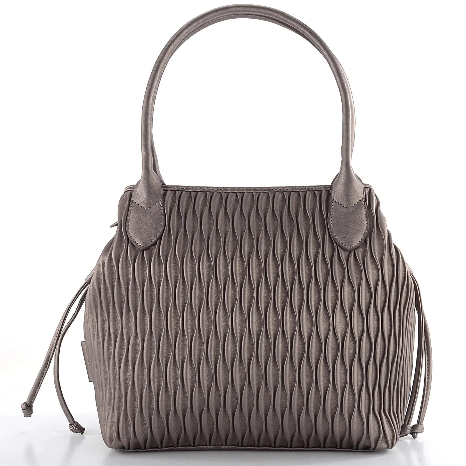 Pc 63,90 eur. Originálny model dámskej shopper kabelky od značky Gabor. Tento model vyniká svojou šedohnedou metalickou farbou (taupe/bronze) a pravidelným skladaným vzorom na prednej strane. Kabelka je vyrobená z hladkej a poddajnej syntetiky a poskytuje dostatok priestoru pre formát A4. Možno ju nosiť na dva spôsoby - ako širšiu verziu bez utiahnutia alebo užší typ s utiahnutím na bokoch. Praktická zadná strana je opatrená zipsovým vreckom. Hlavný priestor kabelky je uzatvárateľný na zips, s možnosťou sťahovania bočníc a vnútorným zapínaním na patent. Vnútorná výbava zahŕňa 1 zipsové vrecko a 2 priehradky na mobil. Držadlá kabelky sú vzdialené 26 cm od hornej hrany. Rozmery: šírka 43 cm (bez utiahnutia) alebo 28 cm (pri utiahnutí), výška 27 cm, hĺbka dna 17,5 cm. Tento originálny model od značky Gabor je perfektný doplnok na každodenné nosenie.