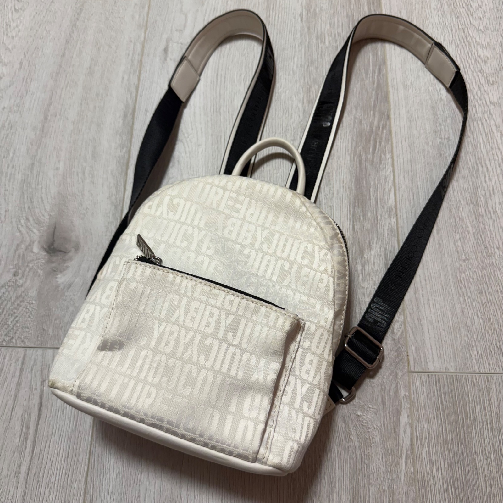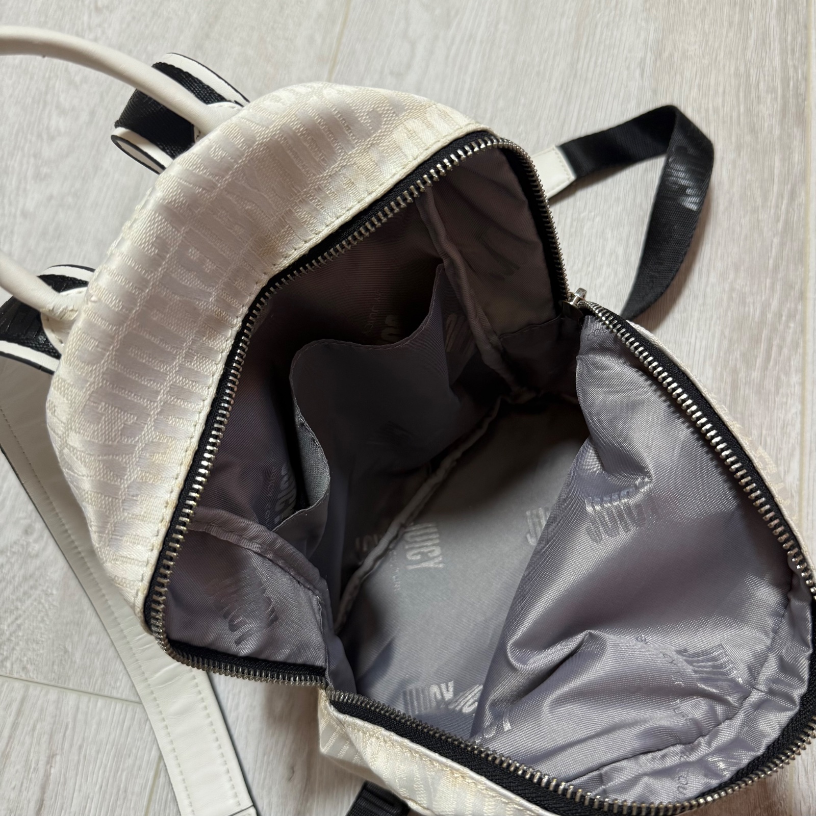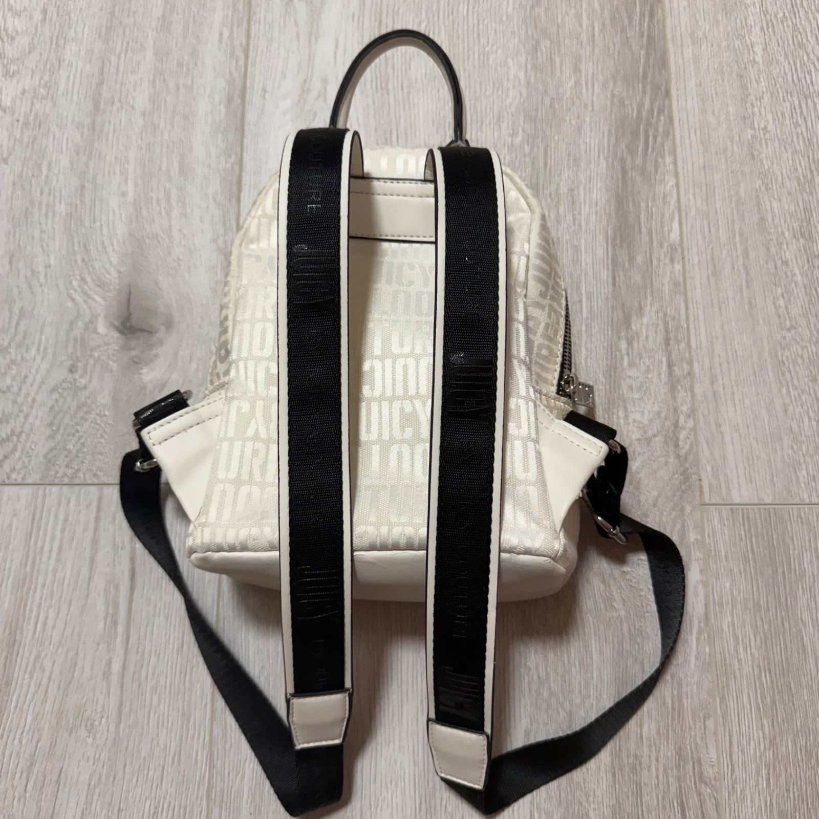 🤍🖤🤍 Predám malý ruksak ORIGINÁL zn. Juicy Couture. Hoci bol minimálne používaný a potom len skladovaný, na viacerých miestach sa začala olupovať koženka a miestami zažltla látka akoby presiaklo lepidlo použité pri výrobe (viď foto). Cena symbolická oproti pôvodnej PC 200€.