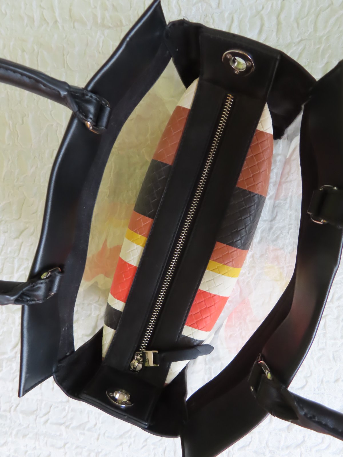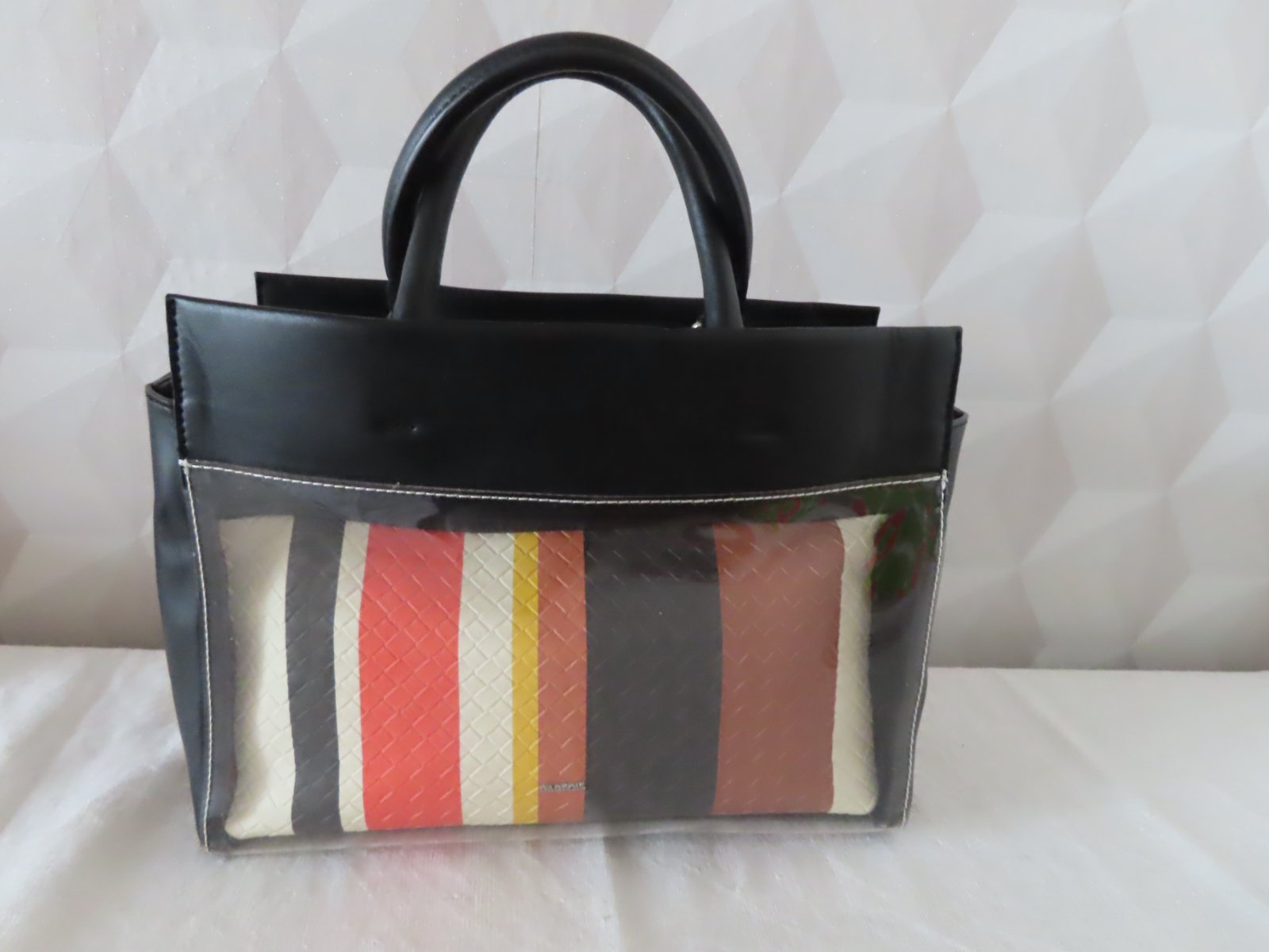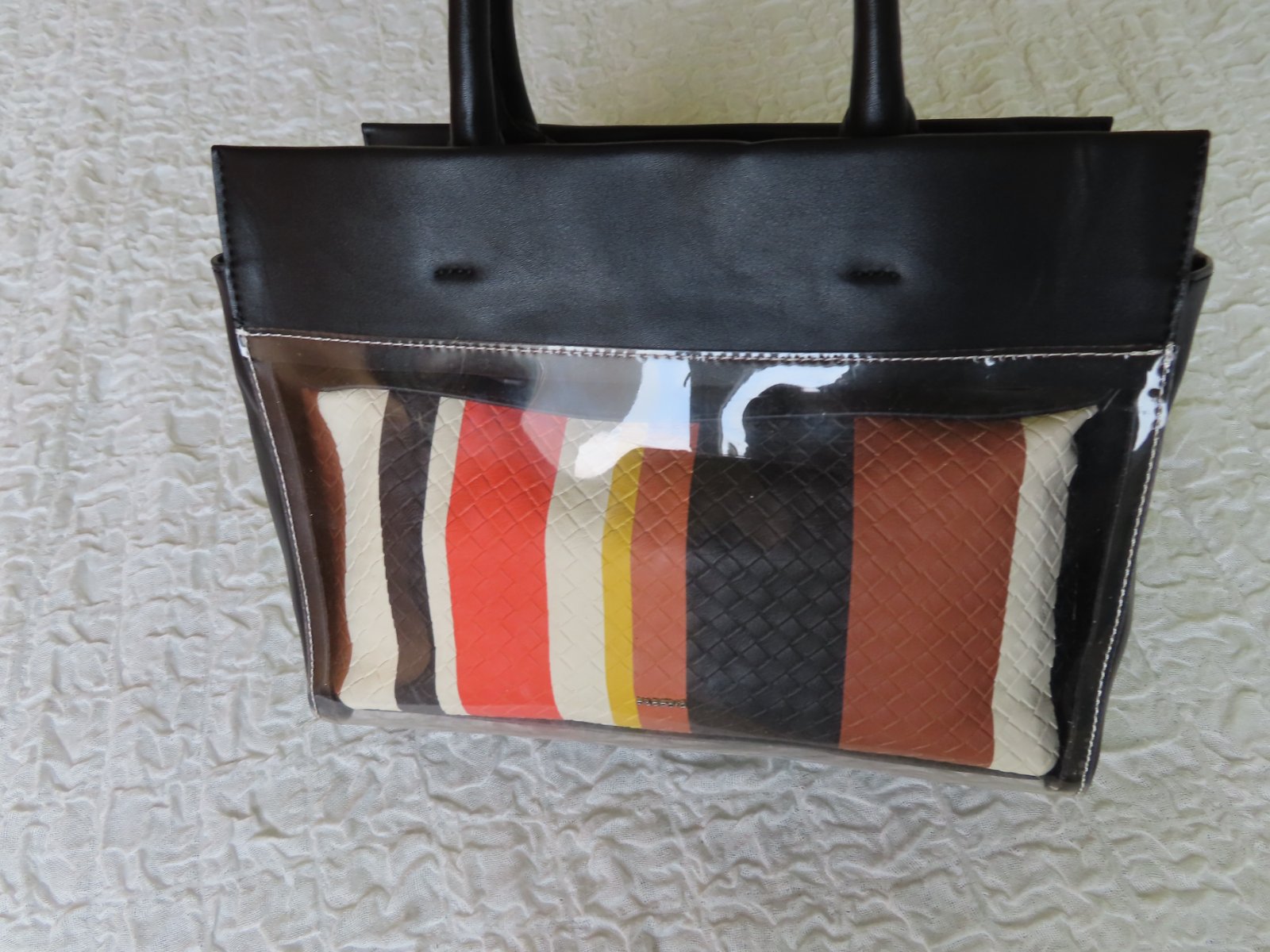 Vrchná kabelka je zčasti priesvitná, v nej je vopnutá menšia kabelka so zatváraním na zips.