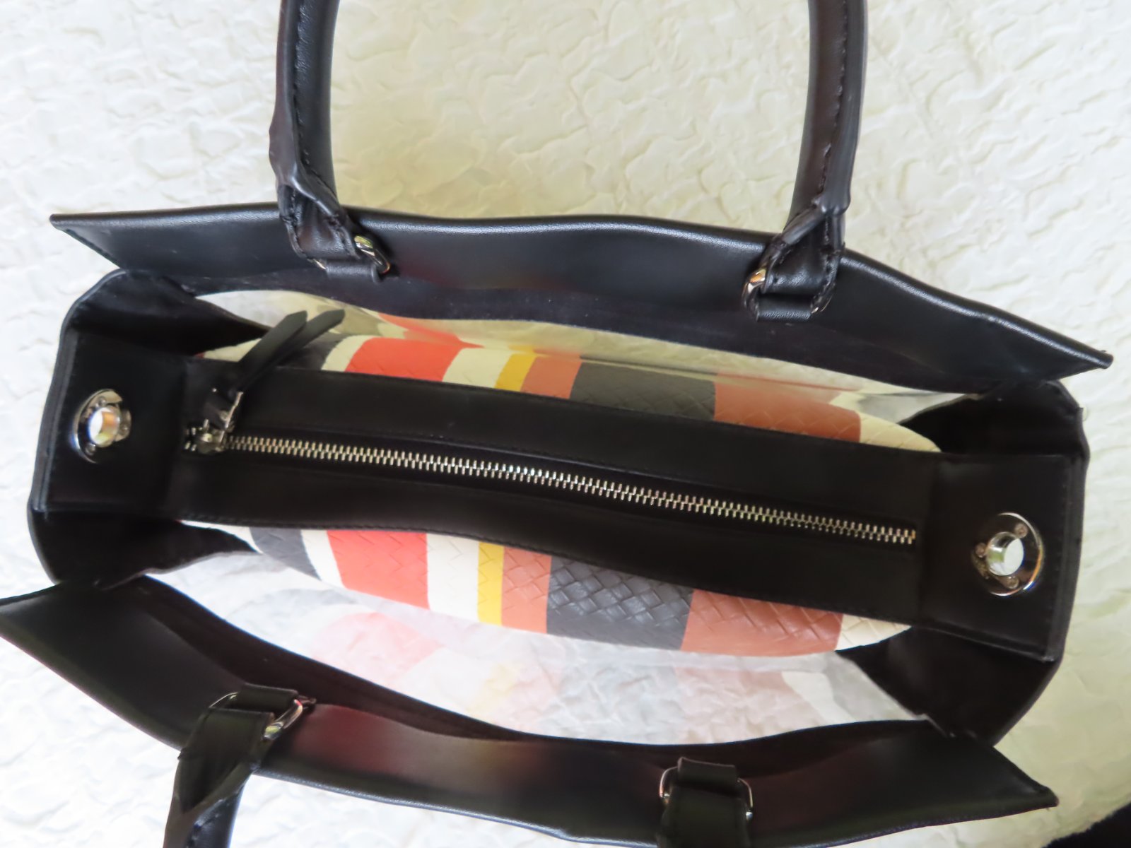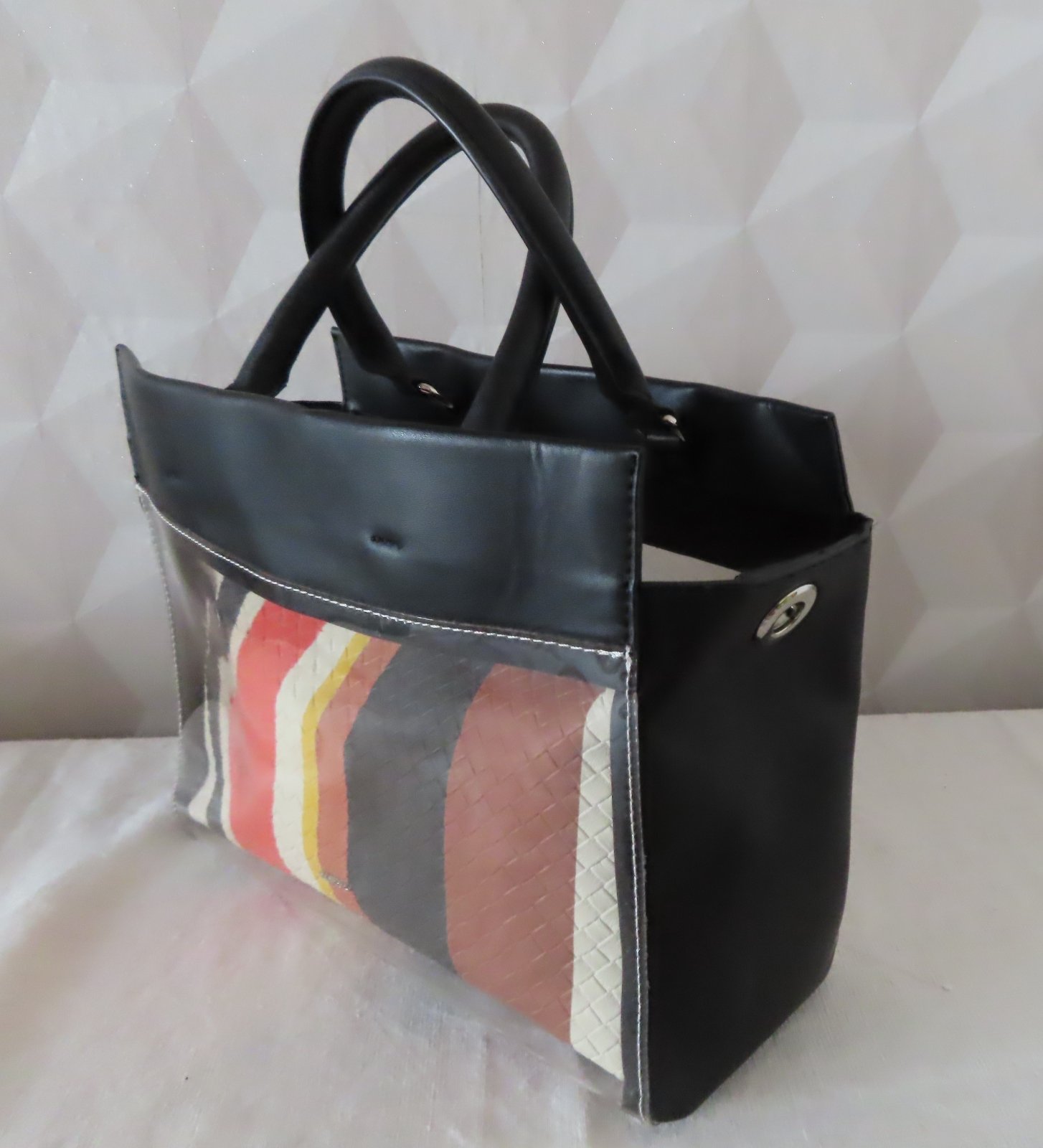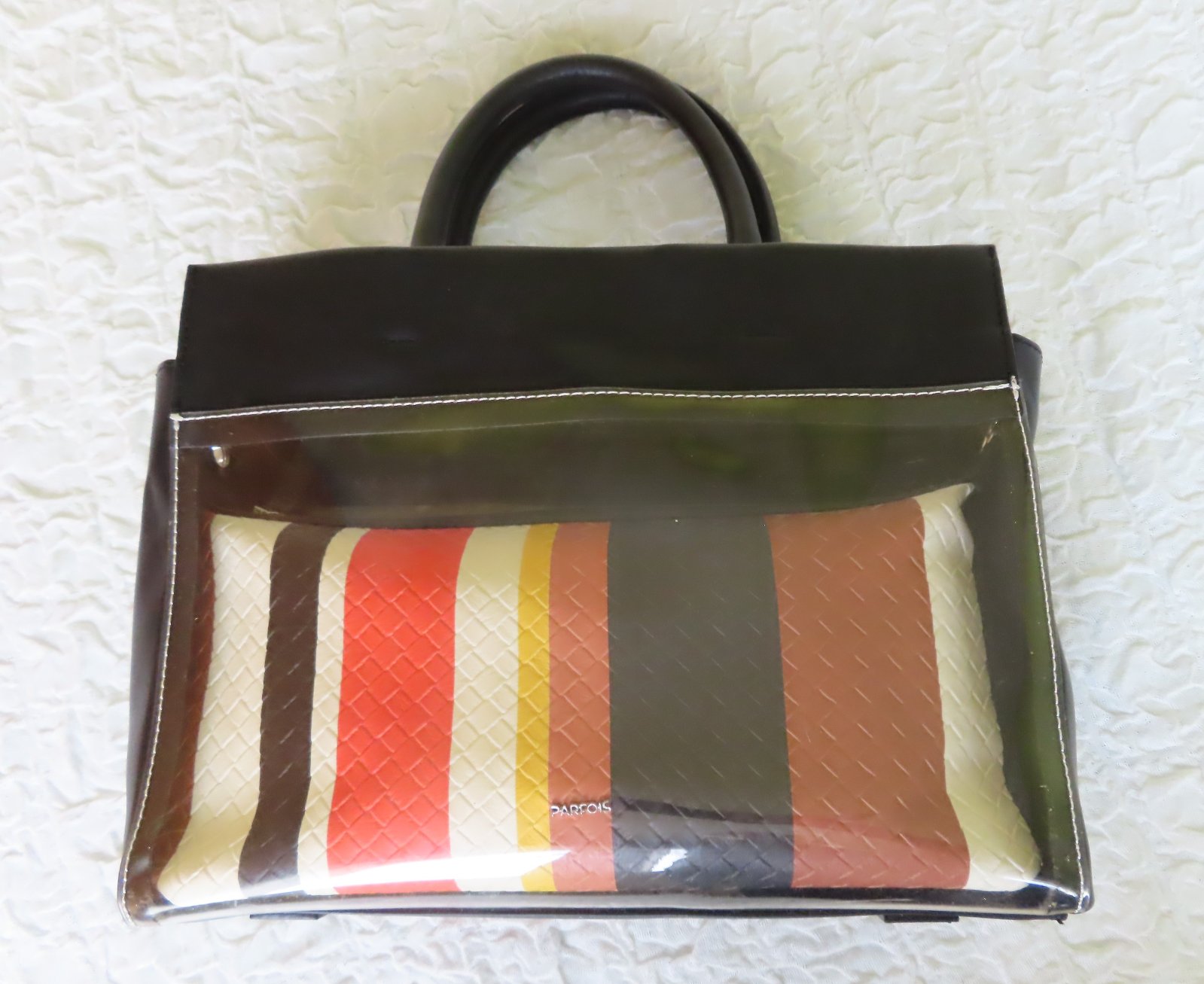 Vrchná kabelka je zčasti priesvitná, v nej je vopnutá menšia kabelka so zatváraním na zips.