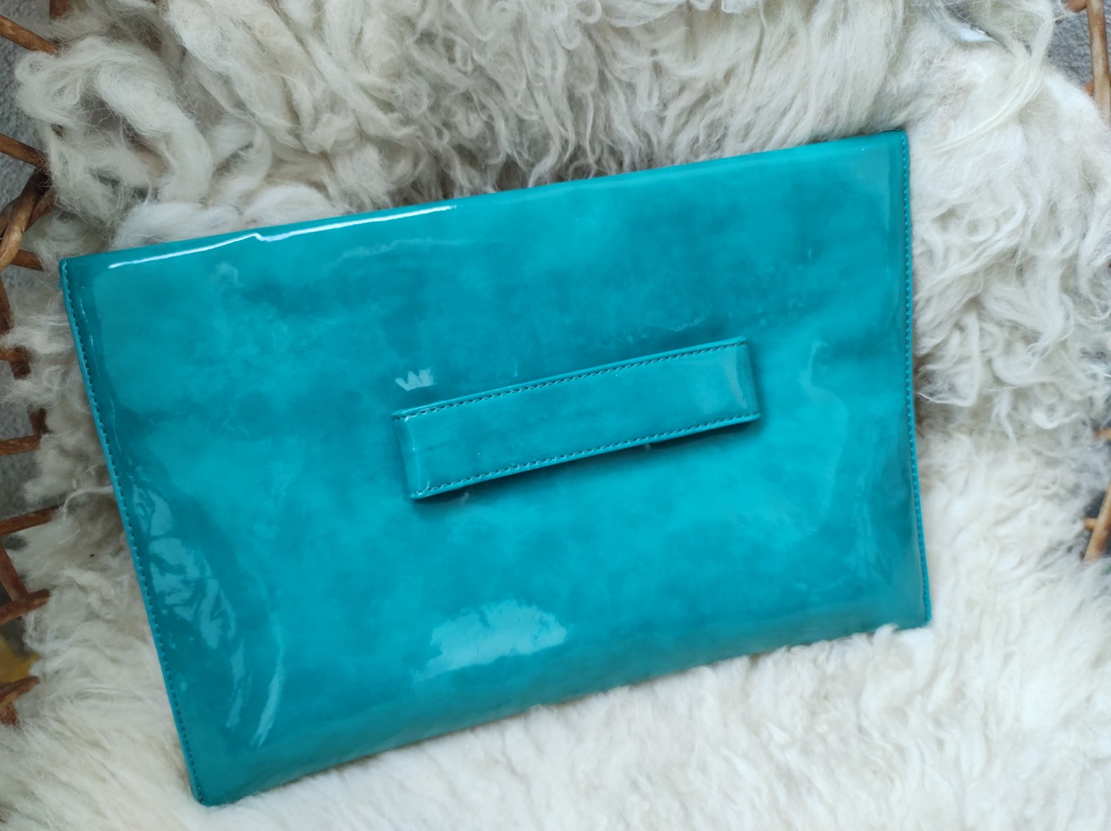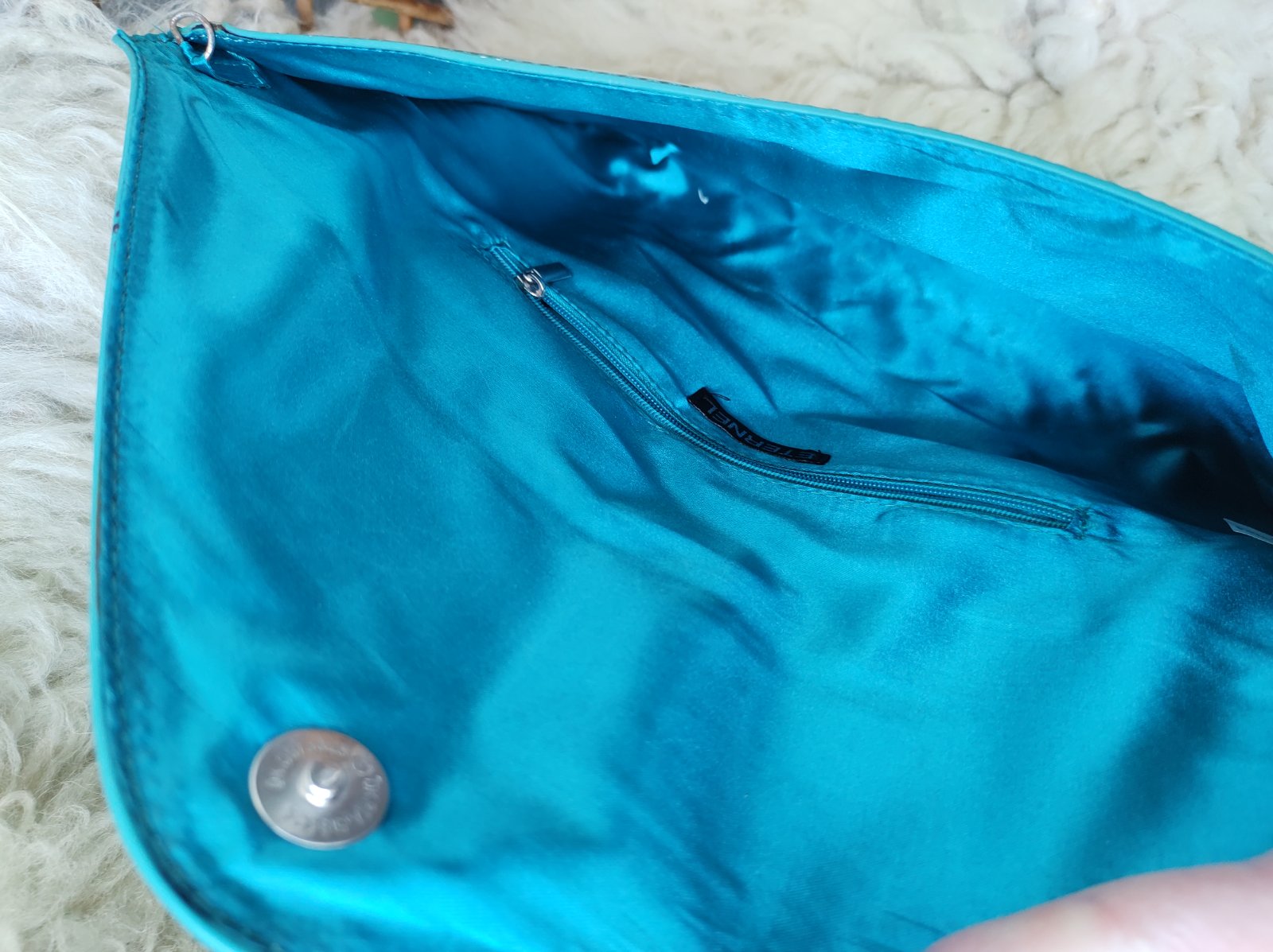 tyrkysová spoločenská kabelka s jemnými odleskami. Dá sa nosiť na rameno pomocou retiazky alebo do ruky pomocou pútka. TOP stav