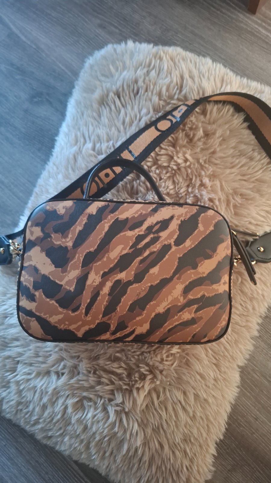 Krásna kožená kabelka so zvieracím vzorom. Raz vyvetraná, bez chybičky. Rozmer: 22x15cm Má tri samostatné priehradky, hardware zlatý. Ramienko prispôsobíte prackou a zapnutúm. V navyššom bode meria...
