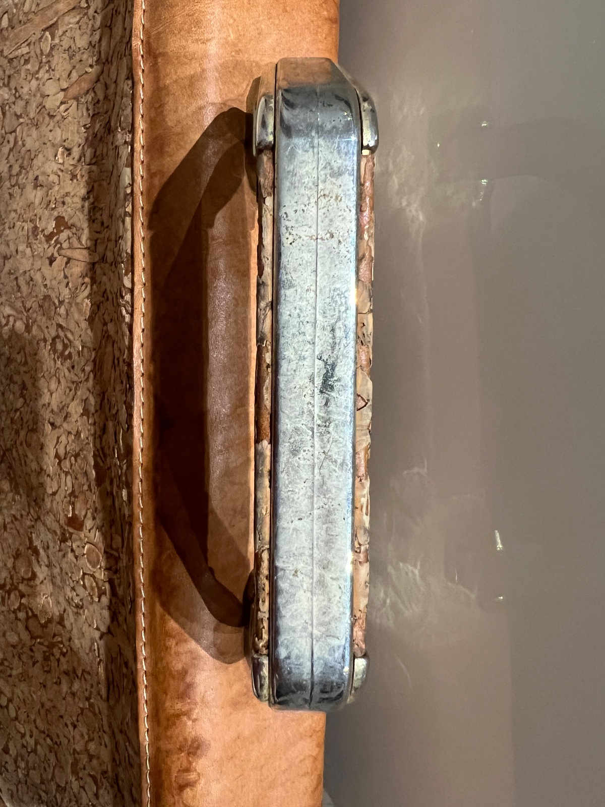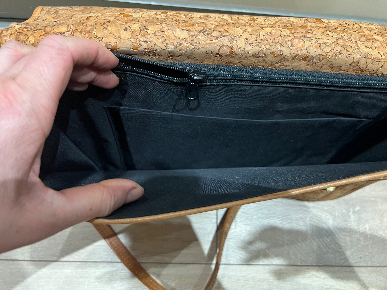 Koženková kabelka okrovej, karamelovej farby. Zvonku jeden minifliačik pod jedných uchom - možno sa dá vyčistiť, neskúšala som, inak zvonku bez poškodení; vnútri mierne ufúľaná a na dne je rozpáran...
