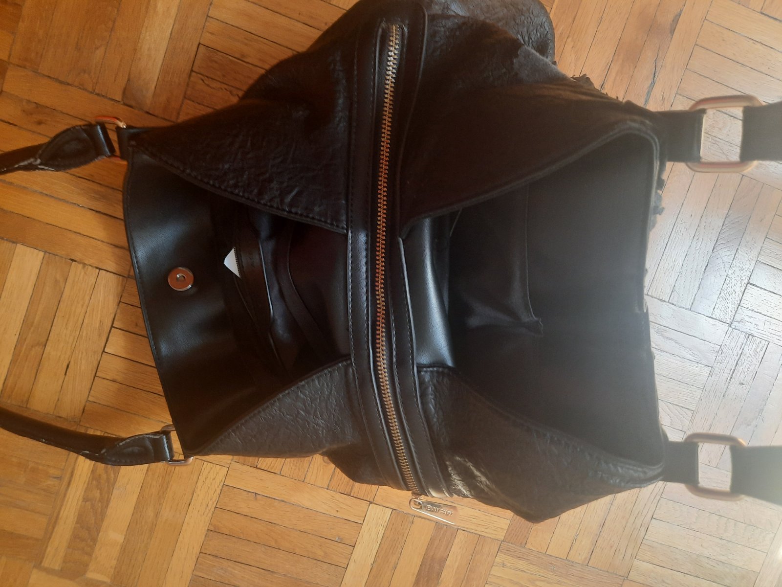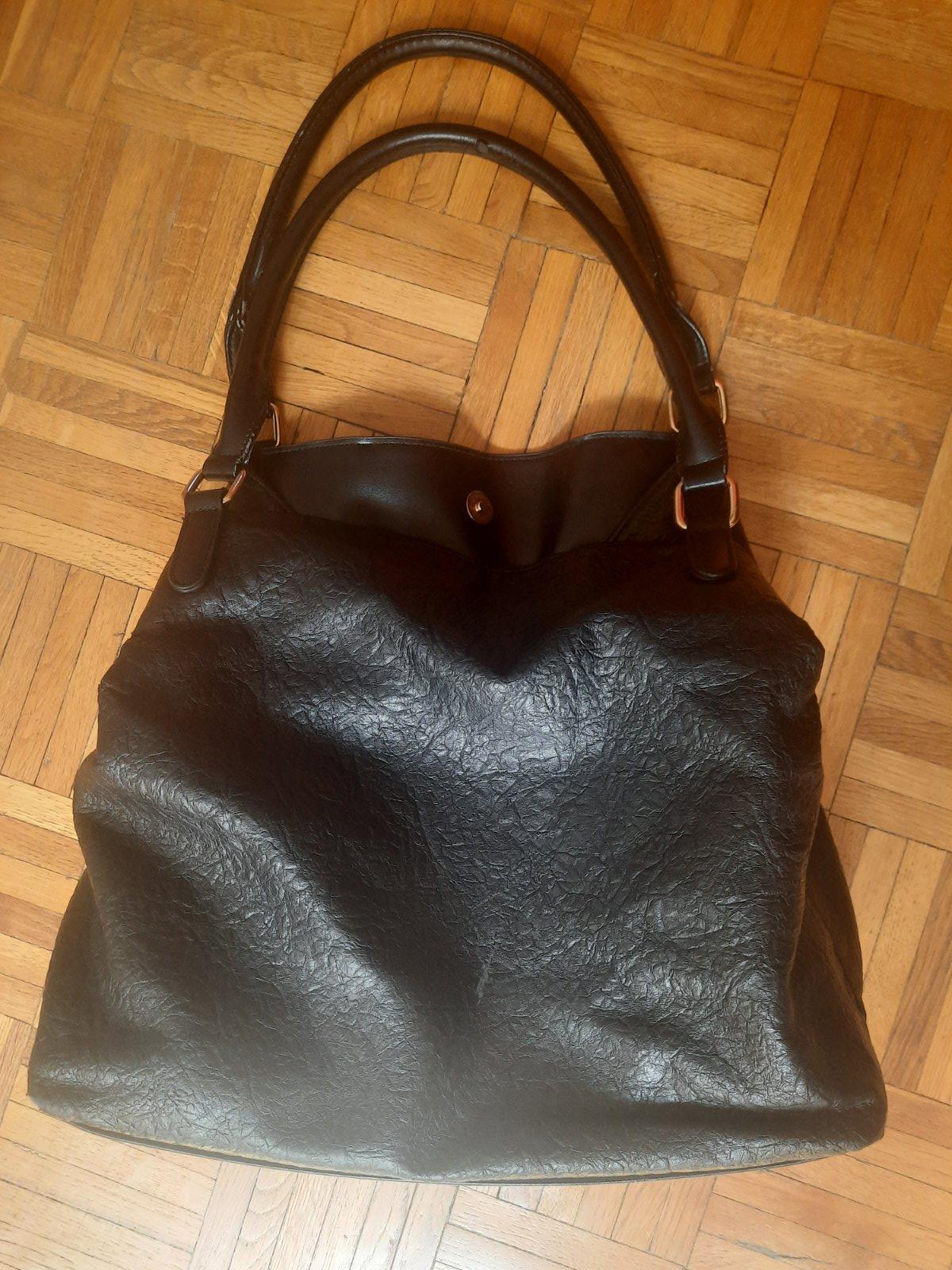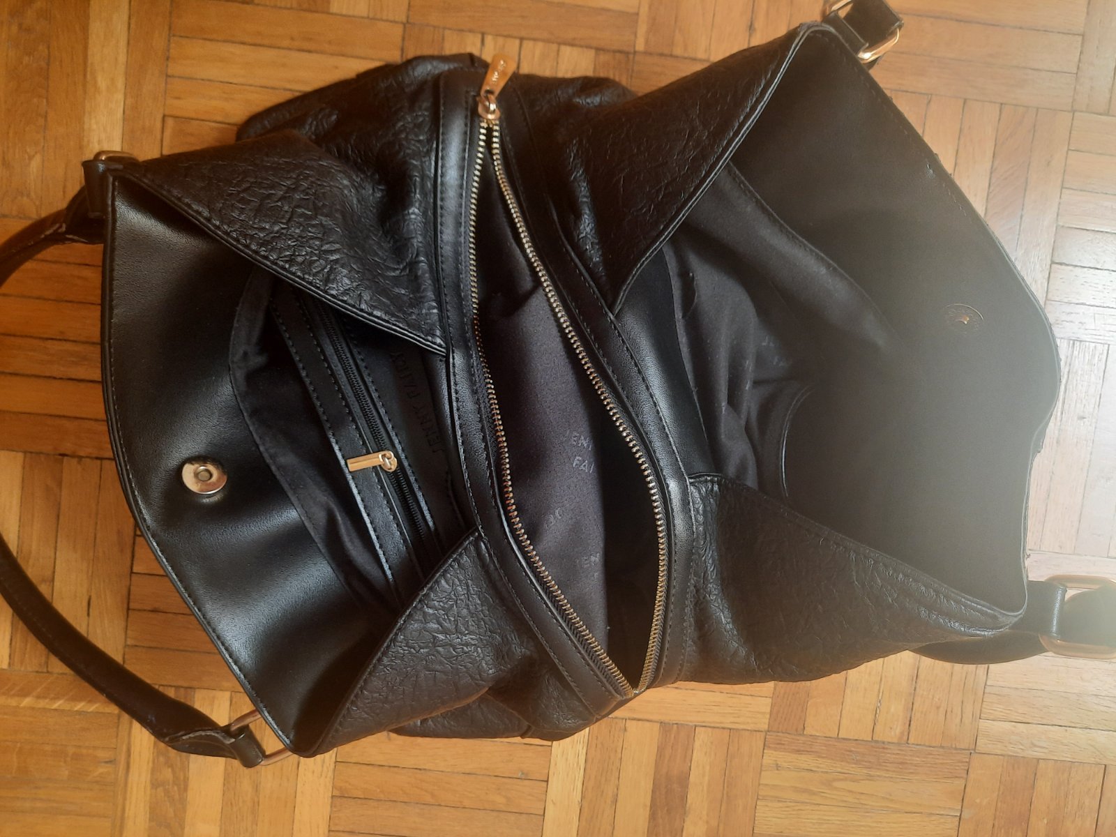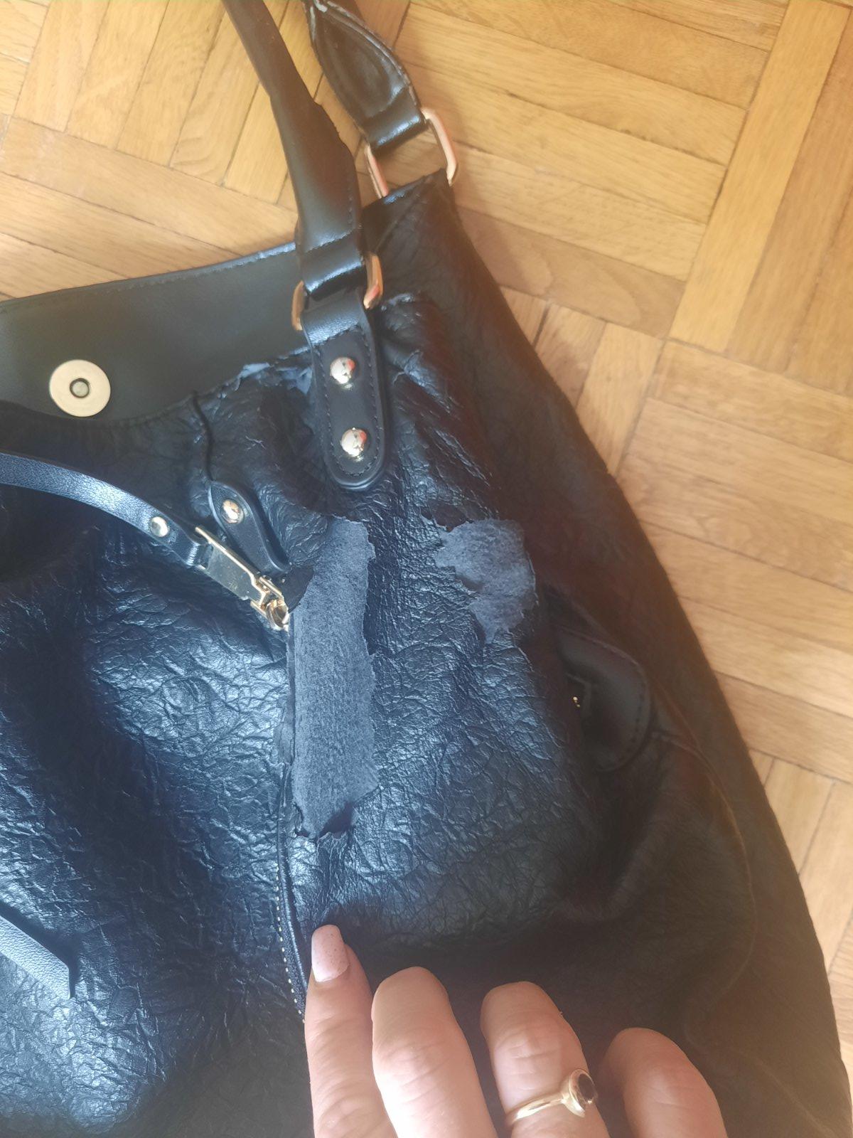 Predám čiernu dámsku kabelku s 3 väčšími úložnými priestormi. Zapína sa na nit + ten stredný priečinok na zips. Vo vnútri sú ešte 2 menšie vačkt na kľúče a mobil, z druhej strany na doklady. Zvonka sú ďalšie 2 menšie na zips. Má olúpanie na 2 miestach, iné poškodenie nemá. Kúpené bolo v CCC obchode.