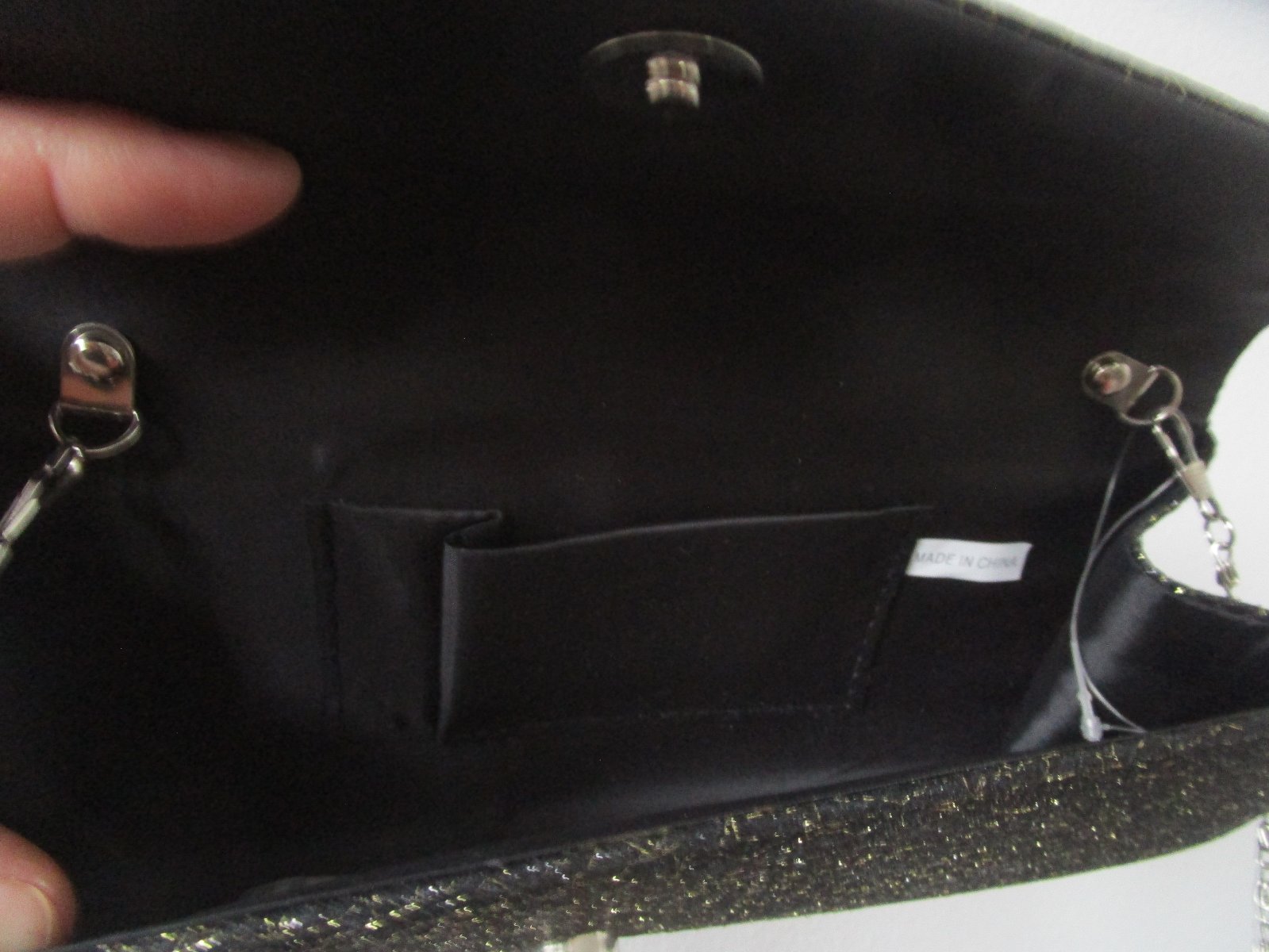 farba: jedna strana biela, druhá čierna so strieborným kovaním odopínateľný dĺžkovo nastaviteľný dlhý popruh + uško do ruky veľmi štýlový kúsok priemer kruhu 20 cm, hrúbka 9 cm materiál: neprav...