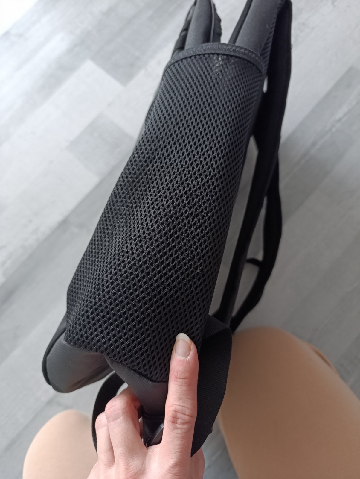 Šikovný detsky ruksak, vnútri vložka na chrbát, da sa vybrať a sedieť na nej, vo vnútri kapsa na fľašku. Minimálne noseny, jediný nedostatok vid foto - zalomené pásiky na predné kapse.
