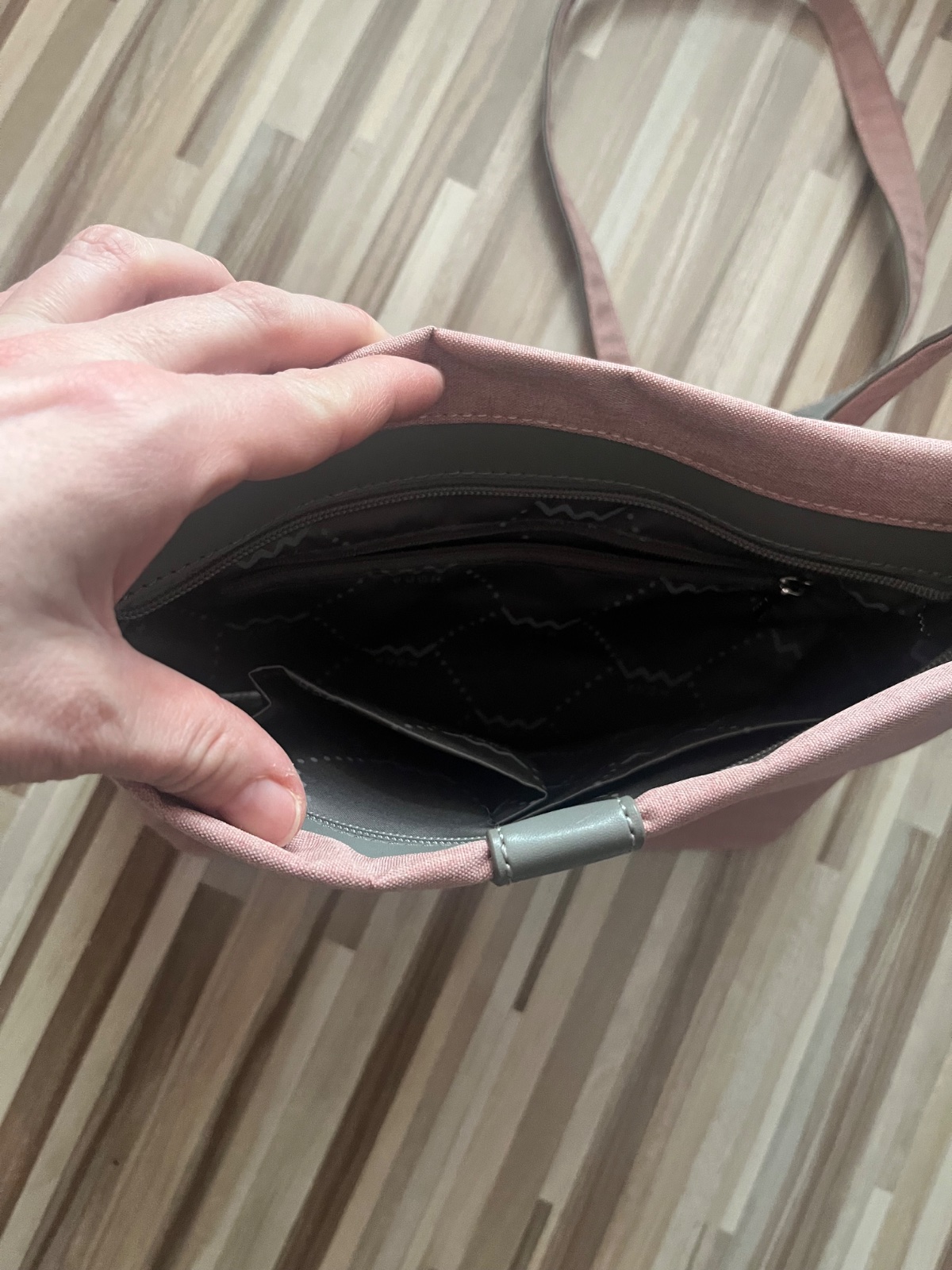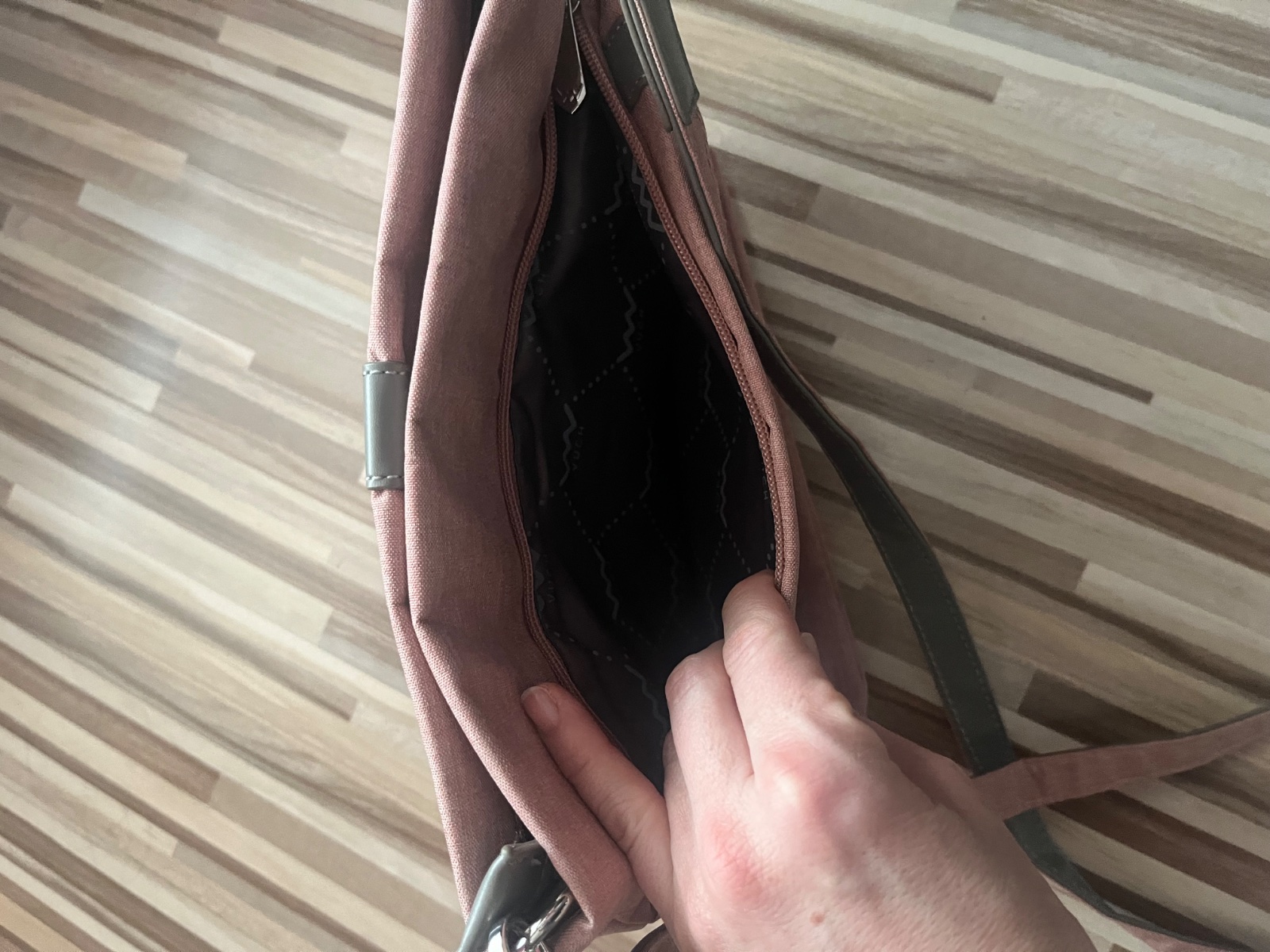 Krásna asi len raz použitá kabelka. Z odolného textilu s množstvom priehradiek.