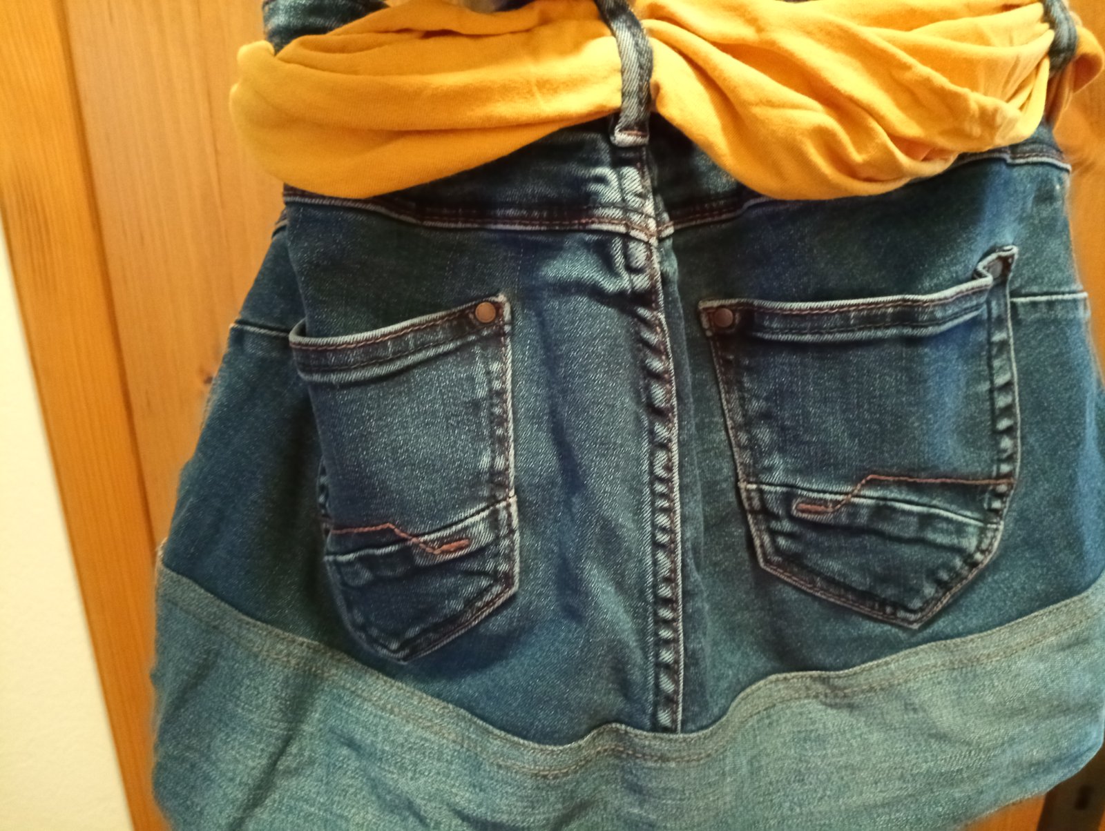 Riflová crossbody kabelka, vhodná na dovolenky, ale aj na každodenné použitie. Dá sa zdobiť šálom. Vnútri sú bočné vrecká na telefón a na malú minerálku. Rozmery: 43x33cm.