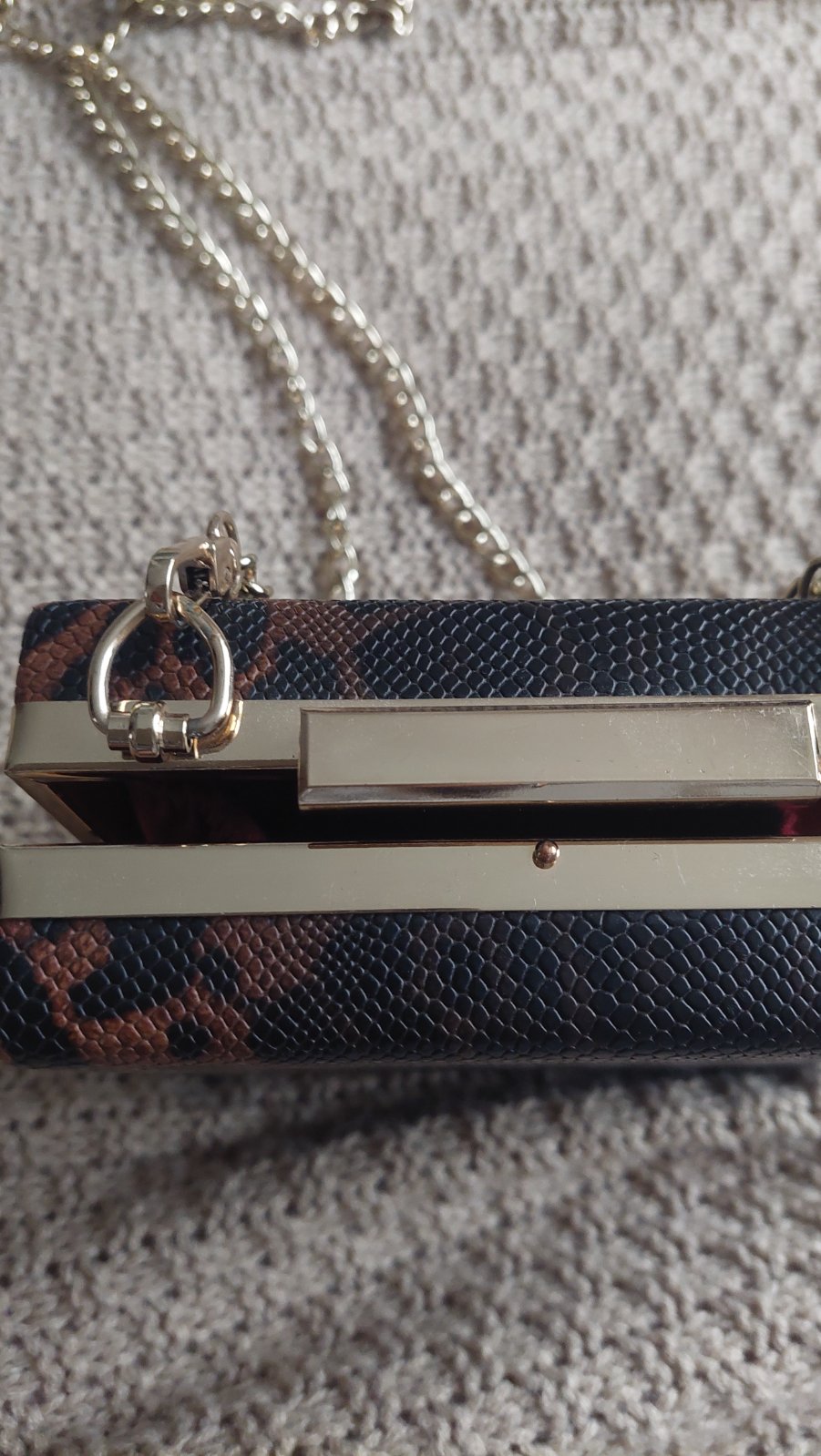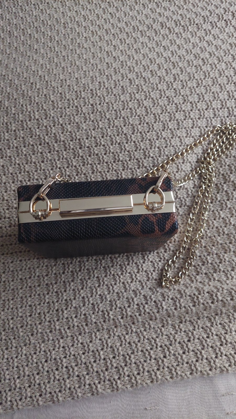 Veľmi vkusná hnedá kabelka - imitácia hadej kože s odopínateľným remienkom cez plece s dvoma priehradkami uzatvárateľnými na zips. Zatváranie na magnetický cvok. Na to aká je malá je pomerne priest...