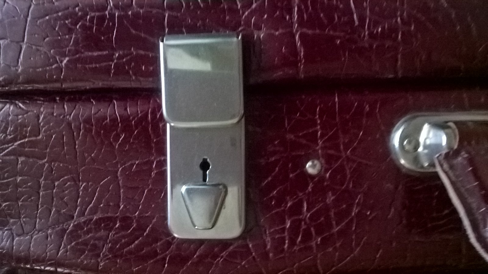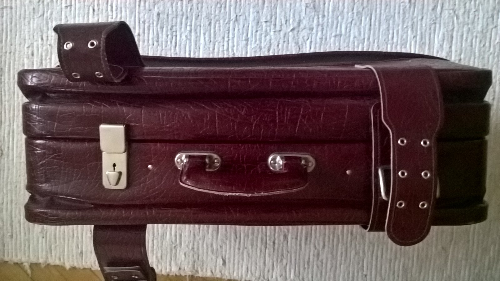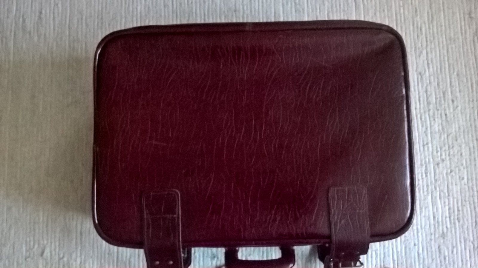 Starsi kufor bez koliesok, material=kozenka/latka,velky ulozny priestor,zvonka na boku este vacok na zips. Vsetko funguje.