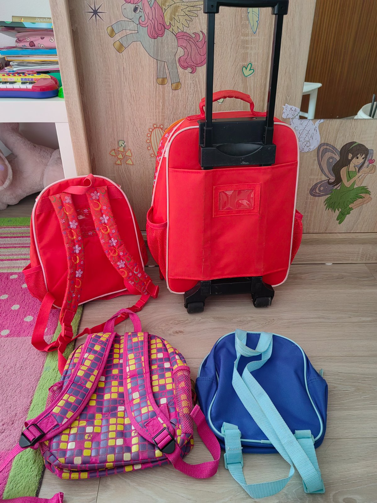 Zachovalý pekný dievčenský cestovný kufor nemeckej značky, kvalitná pevná látka, praktický. Ostatné pribalím grátis, na tých dvoch malých ruksakov vidno používanie.