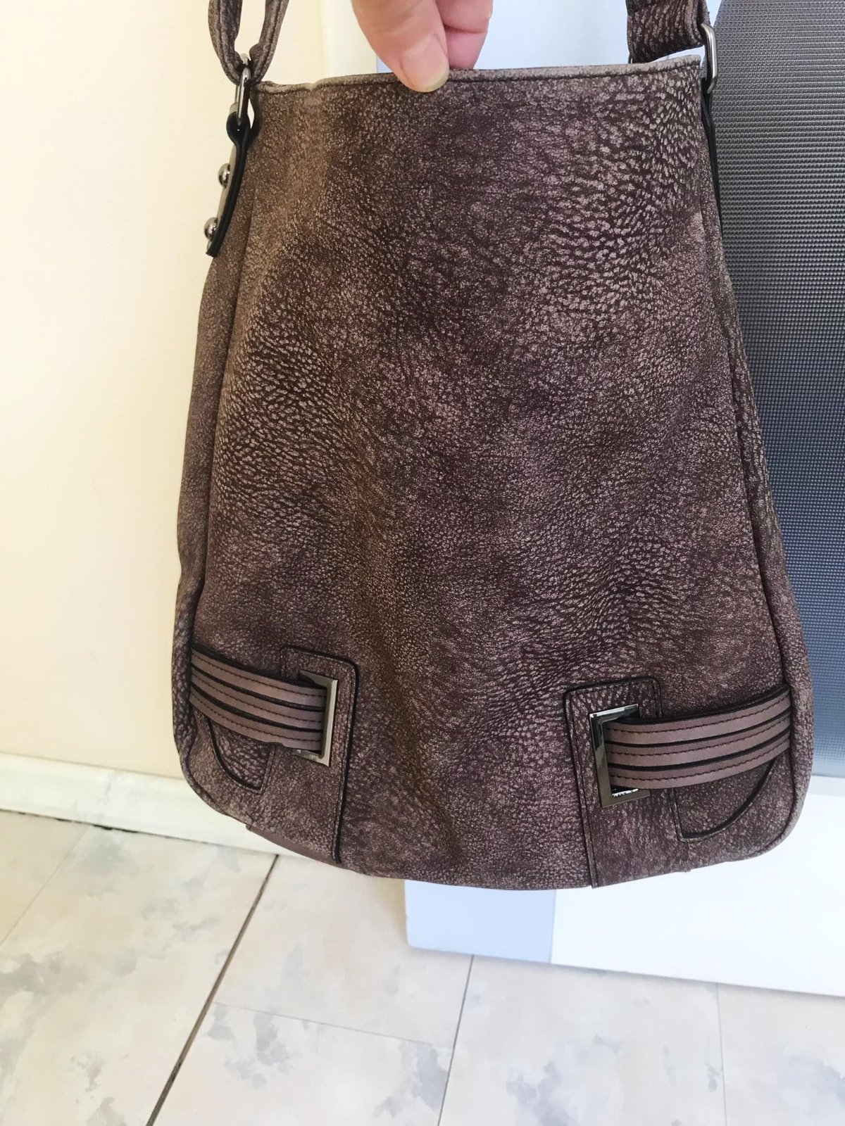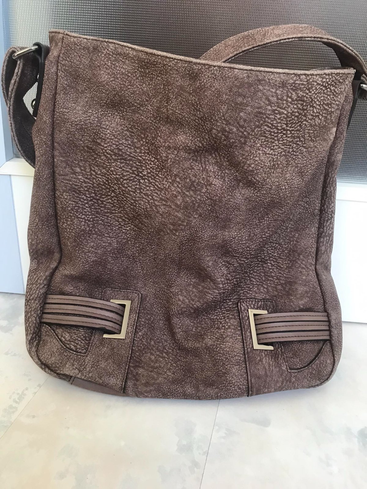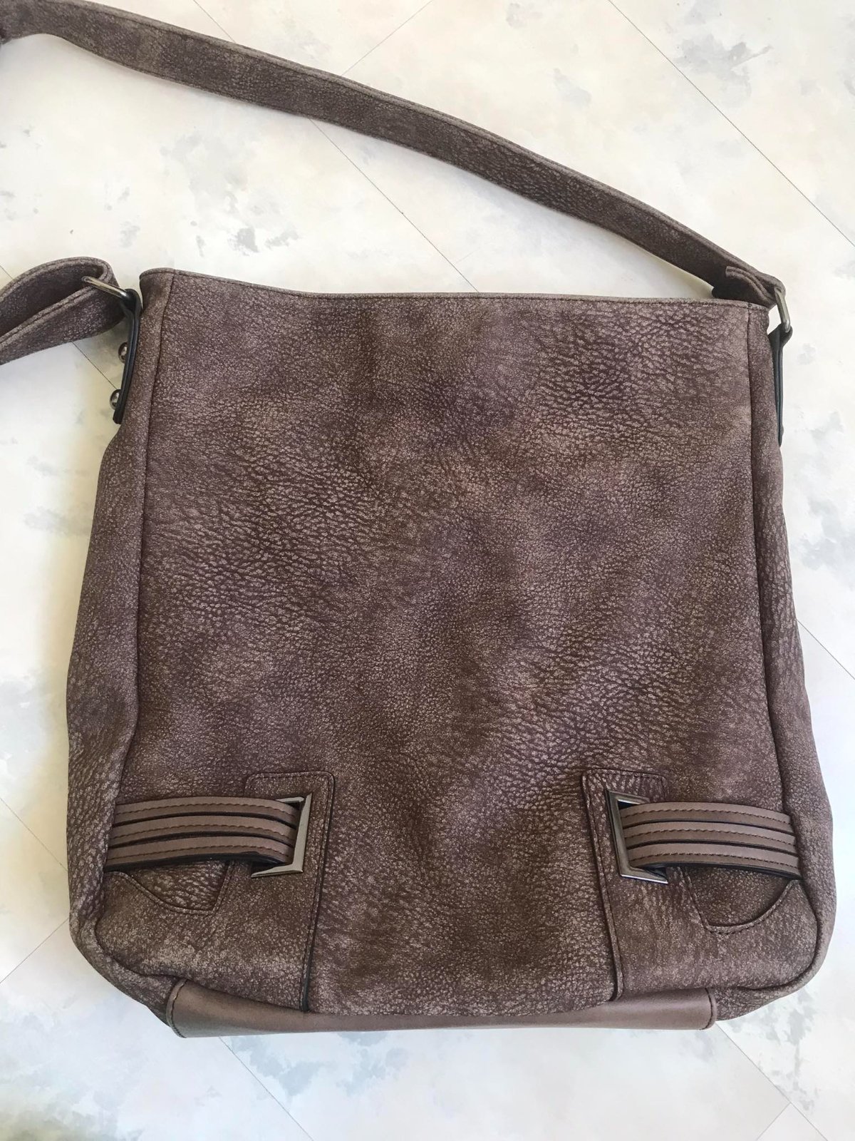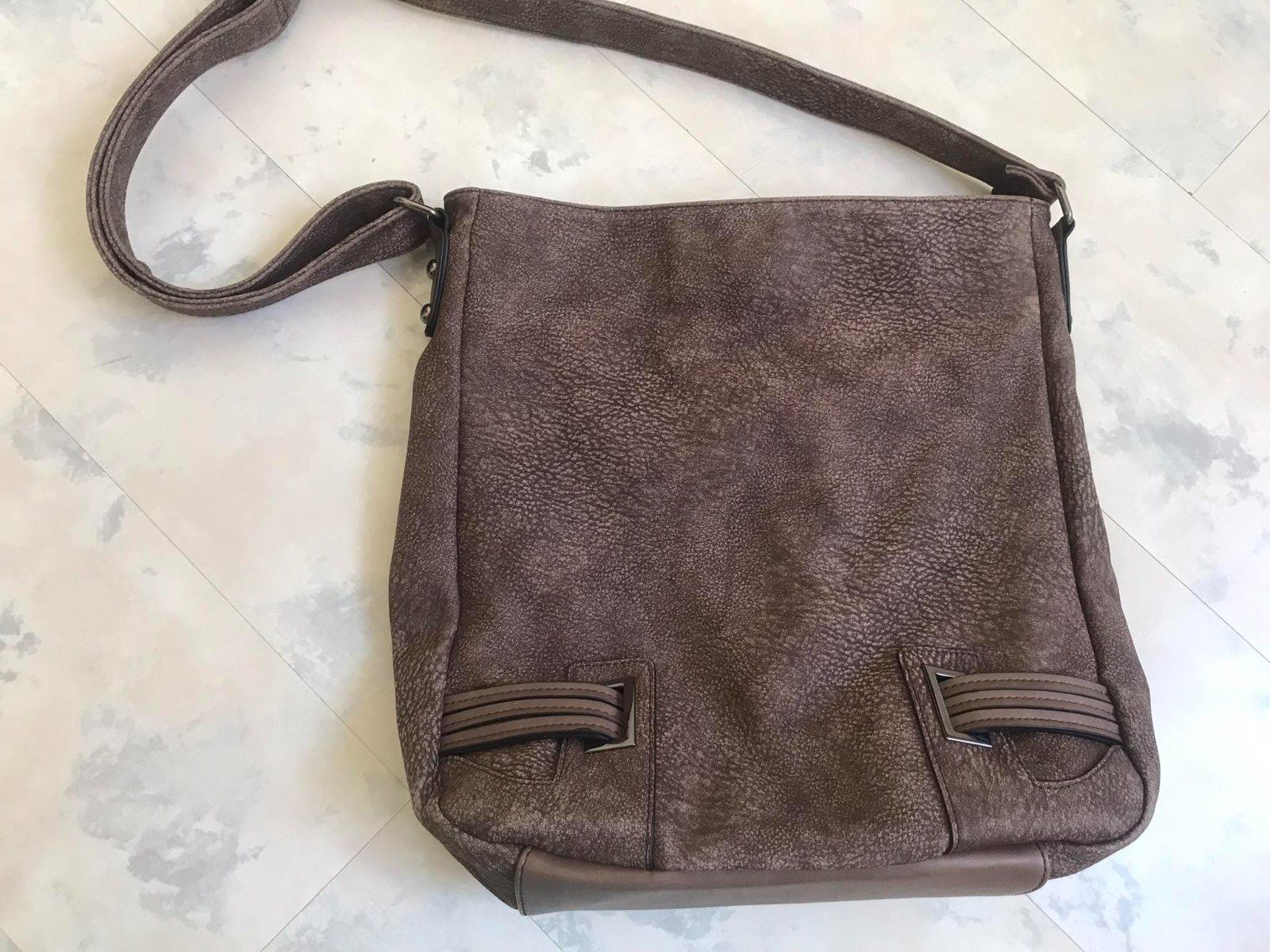 neznosená - raz použitá veľká kabela na plece v krásnej studenej hedej farbe,veľmi trendová a zaujímavá, krásna štruktúra - jemne plastická kresba,verná imitácia kože, zaujímavé detaily,dnuka 2 prepážky, v strede kapsa na zips,zdnu po bokoch kapsičky,jedna na zips,na opačnej strane na mobil a kľúče,variabilná dlžka rúčky.......