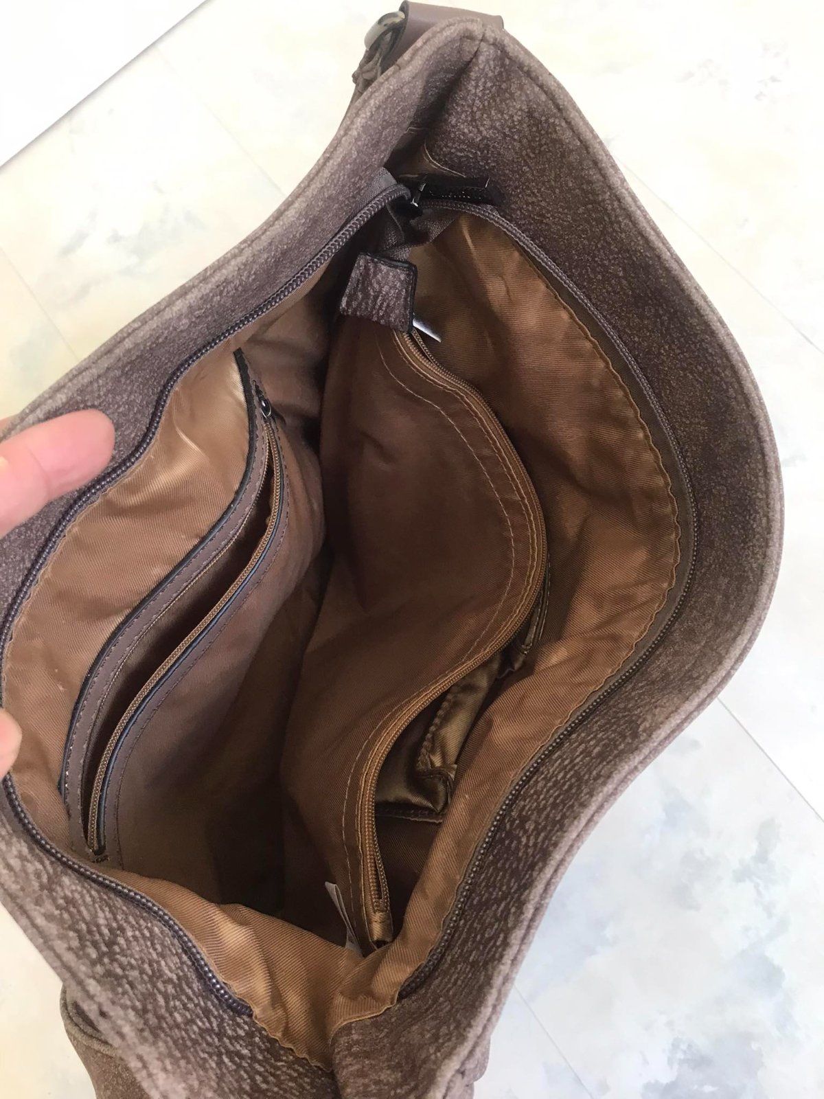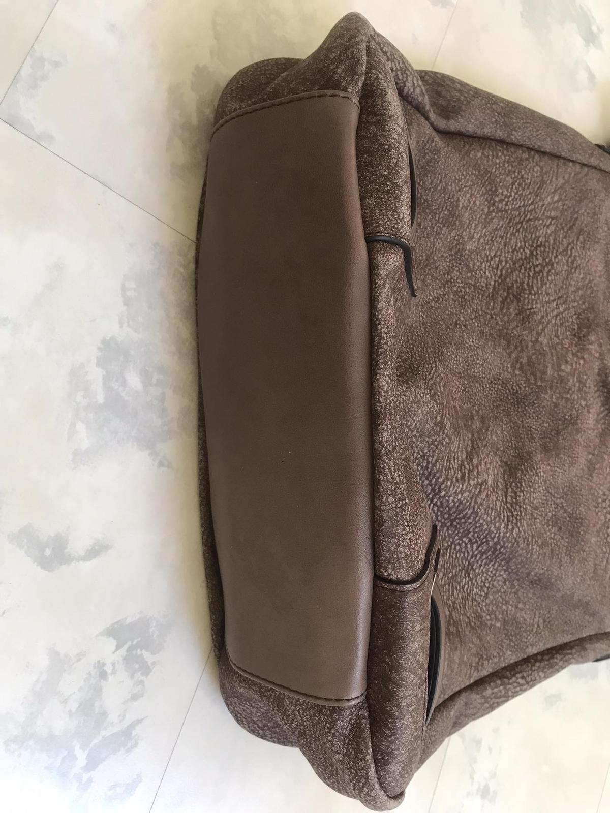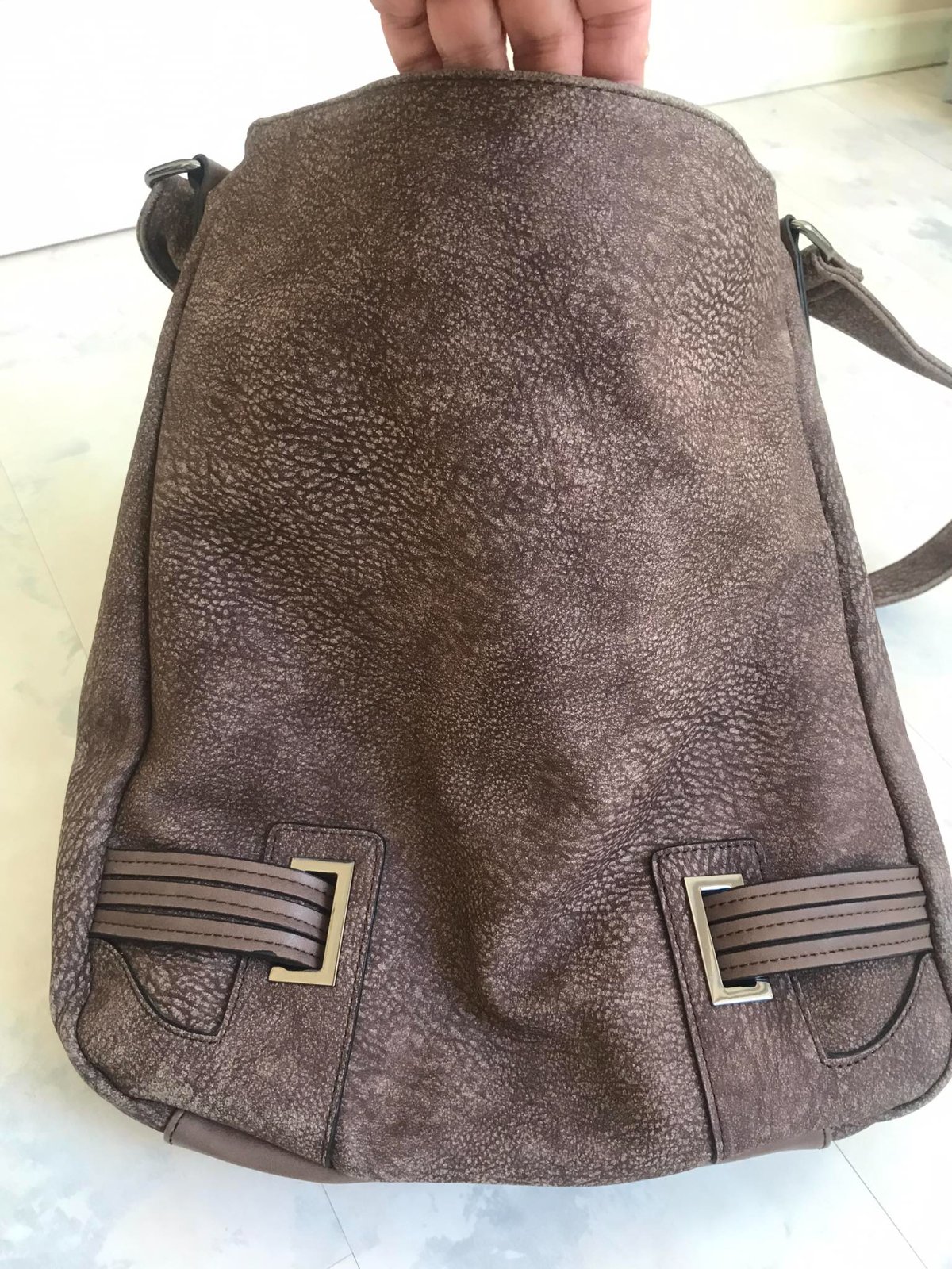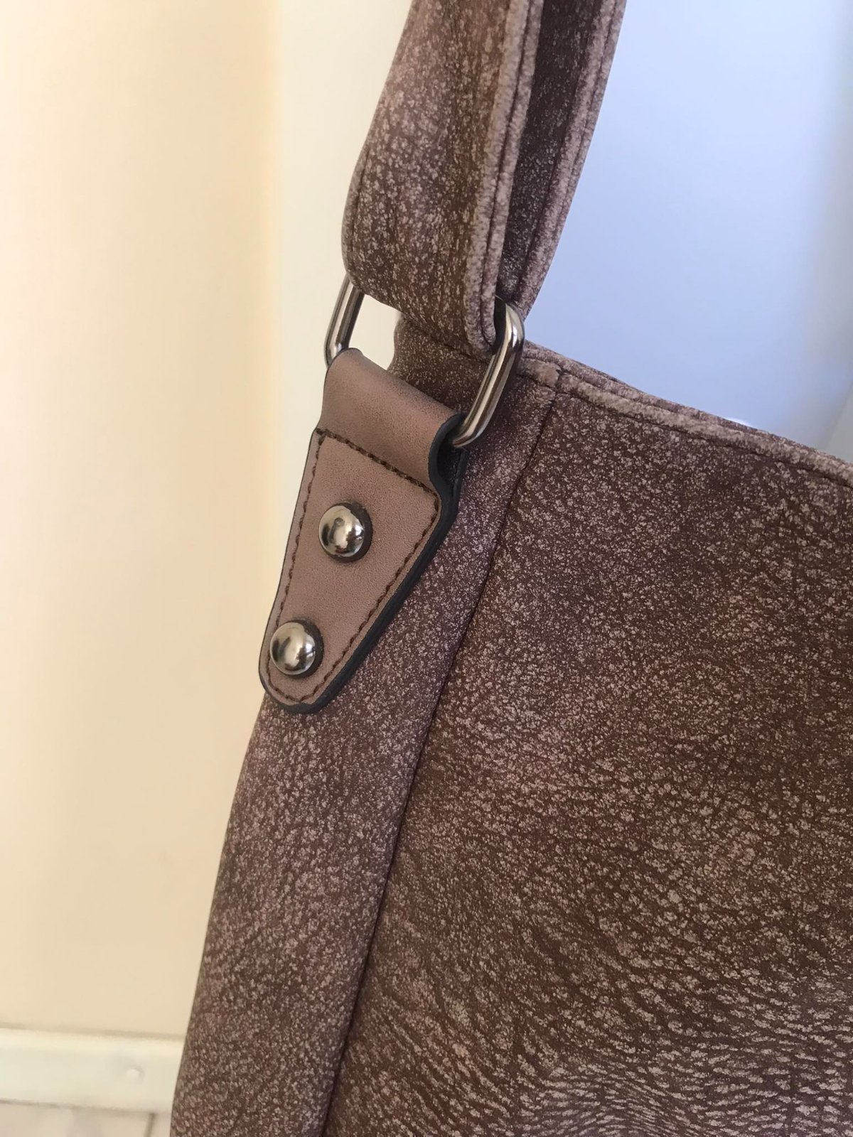 neznosená - raz použitá veľká kabela na plece v krásnej studenej hedej farbe,veľmi trendová a zaujímavá, krásna štruktúra - jemne plastická kresba,verná imitácia kože, zaujímavé detaily,dnuka 2 prepážky, v strede kapsa na zips,zdnu po bokoch kapsičky,jedna na zips,na opačnej strane na mobil a kľúče,variabilná dlžka rúčky.......