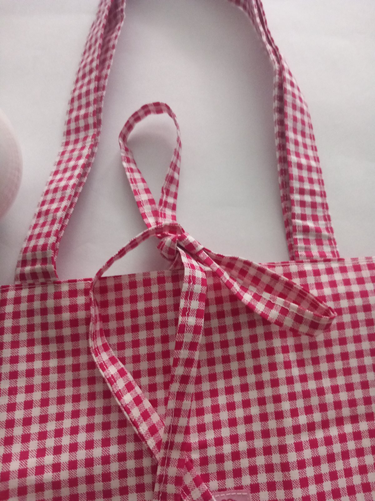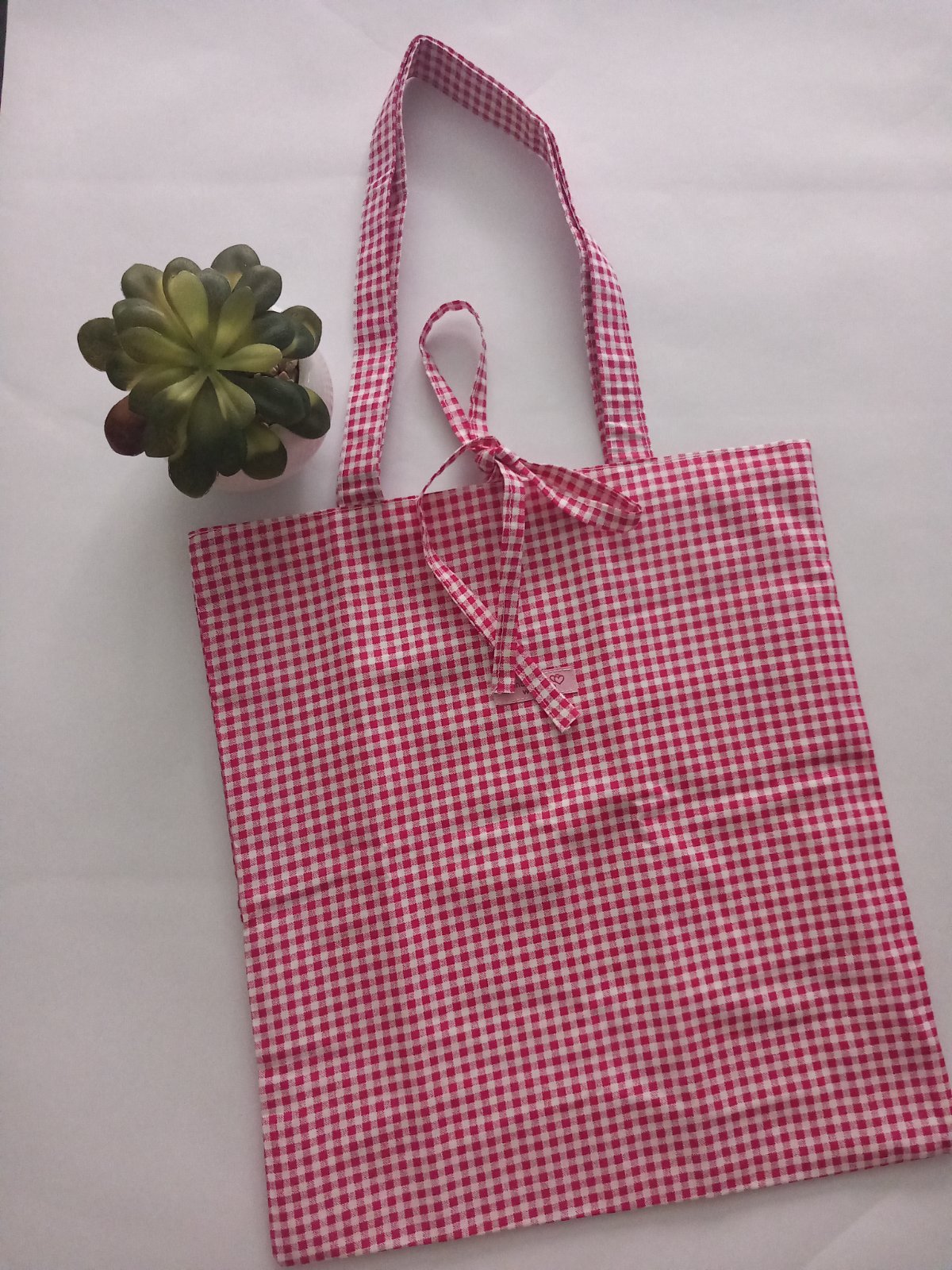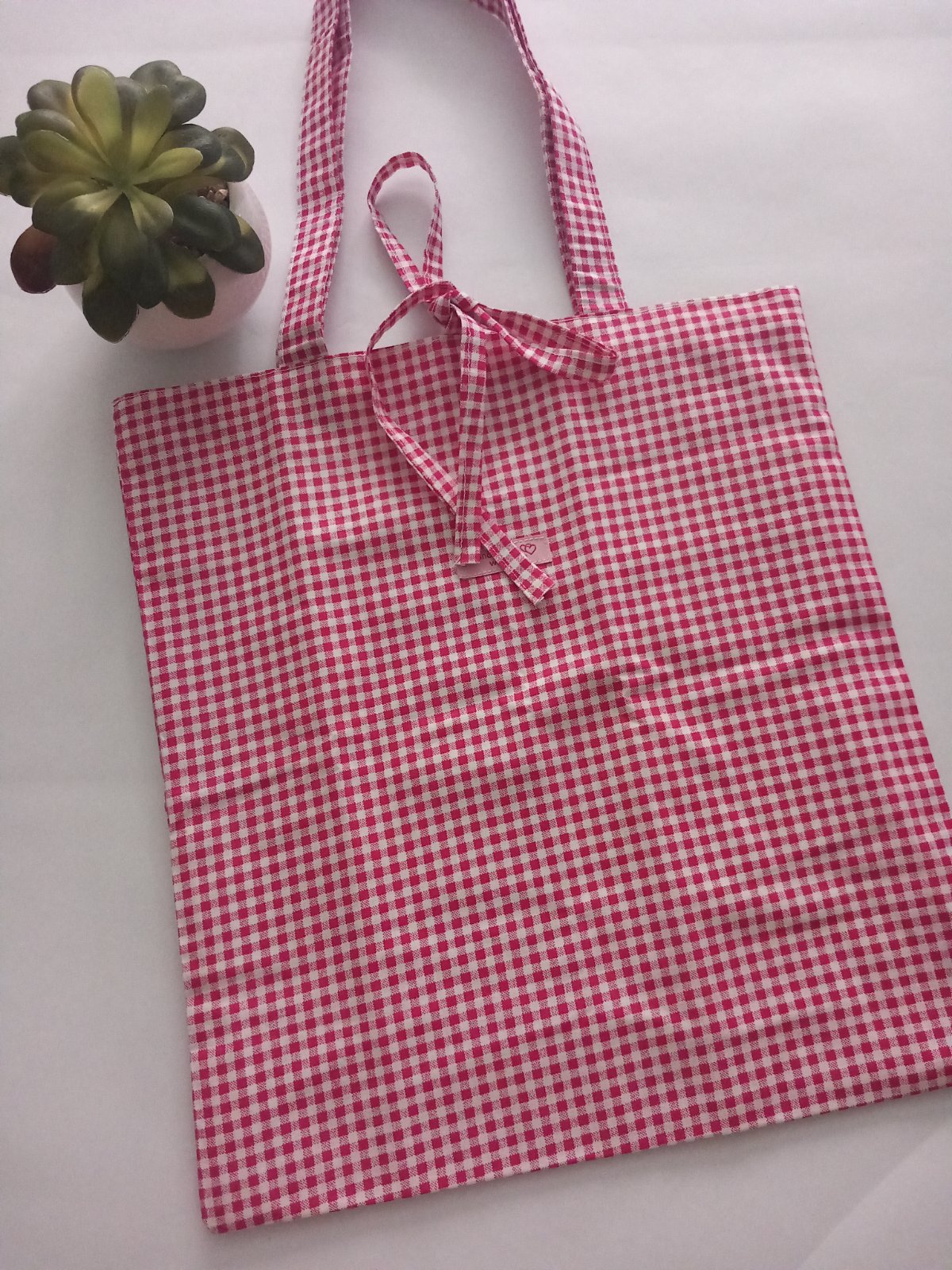 Dámska handamde látková taška karo vzor ružovej farby , je ušitá z kvalitnej 100 % bavlny a podšitá bielou 100 % bavlnou ,taška má vo vnútri aj jedno vrecko . Rúčky sú podlepené sú na rameno ,ale dá sa nosiť aj v ruke . V strede sú šnúrky na viazanie .