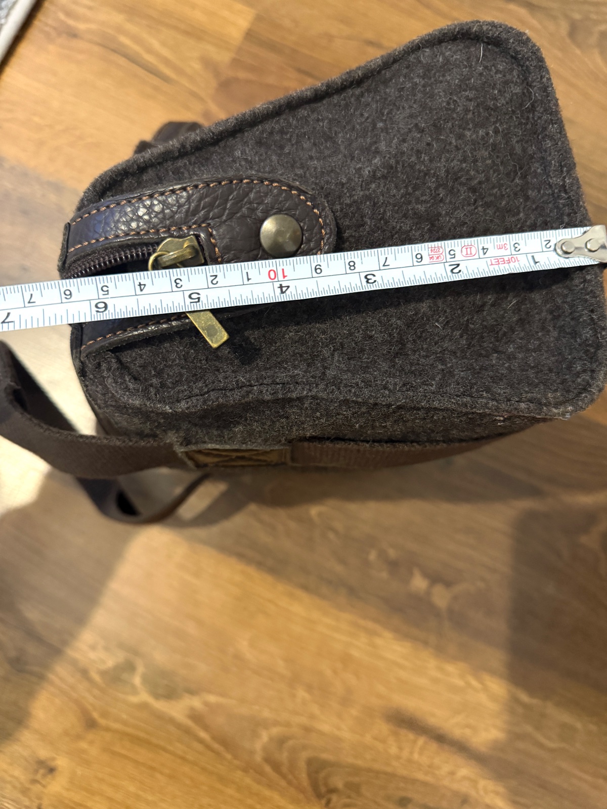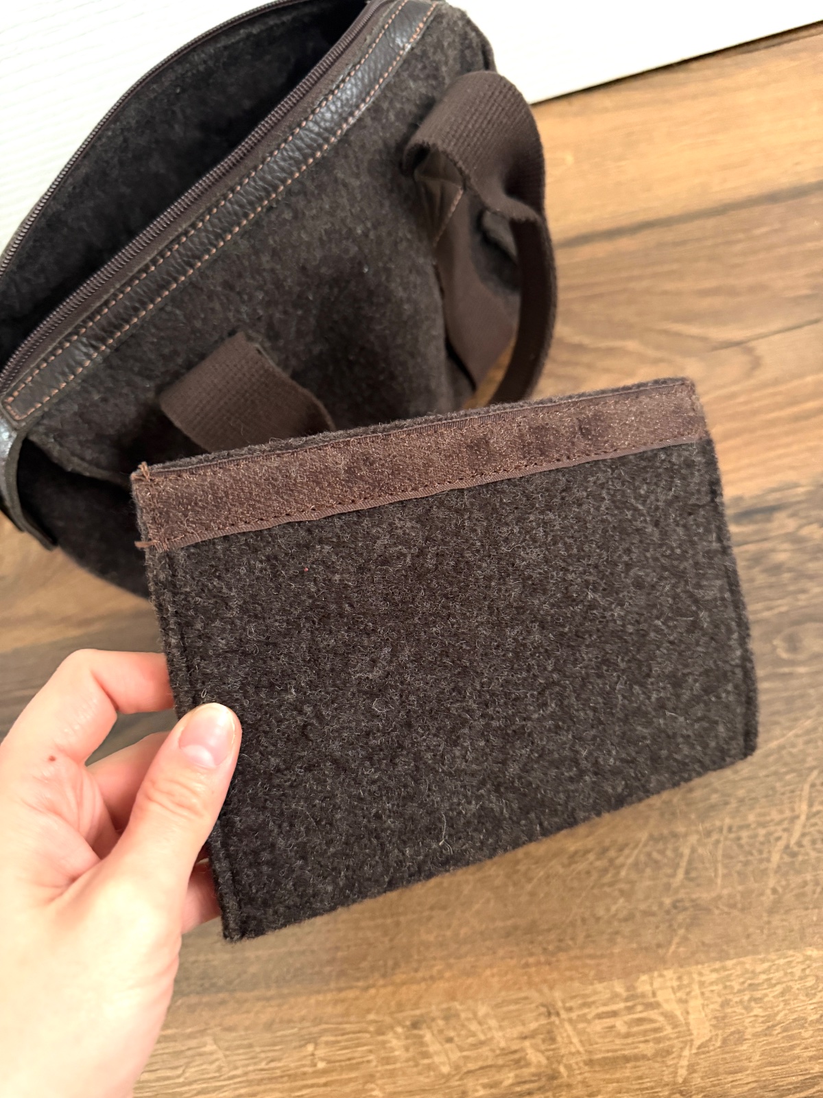 Vlnená kabelka s koženým detailmi od talianskej značky Bonfanti. Kabelka je v krásnej čokoládovo hnedej farbe. Zapína sa na obojsmerný kožený zips s vygravírovaným logom značky. Zips má aj bočné cvočky, ktoré umožňujú pridať dlhý popruh. Vo vnútri ma malý organizér na platobné karty a pero a podobne, ktorý sa zapína suchým zipsom. Kabelka má dve rúčky, je veľmi priestranná a ľahká; všetky rozmery sú na fotografiách. Vyrobená v Taliansku rodinnou firmou Bonfanti, Made in Italy, s dlhoročnými skúsenosťami. Kabelky od tejto značky sa dajú kúpiť za cenu okolo 130 €.