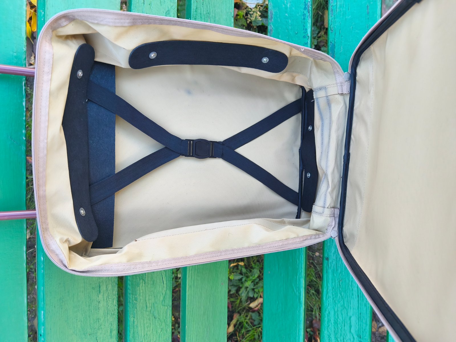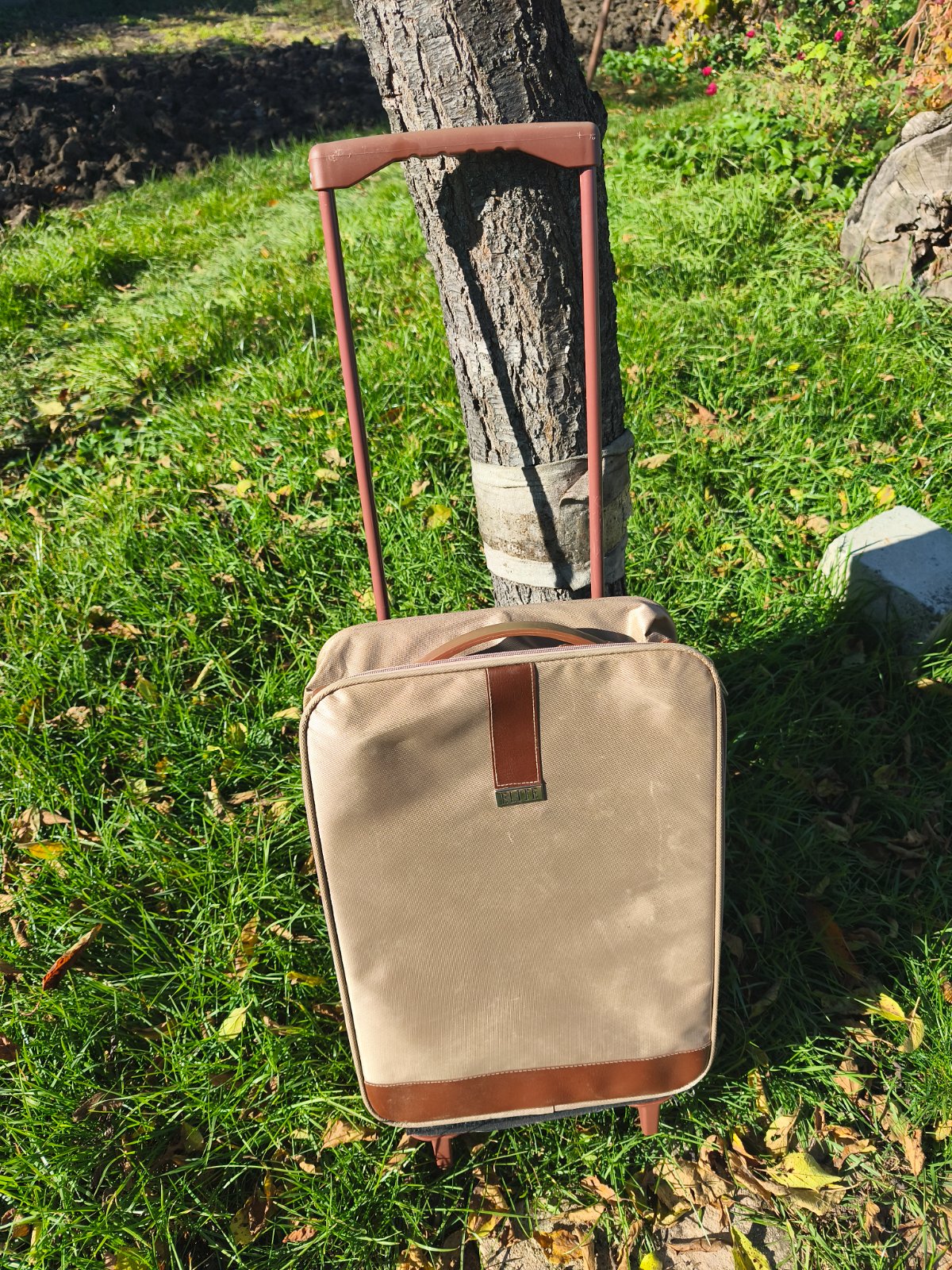 Kufor neutrálnej farby. Plastové malé kolieska, funkčný, Vo vnútri guma na držanie odevov, rozmery sú na fotke.
