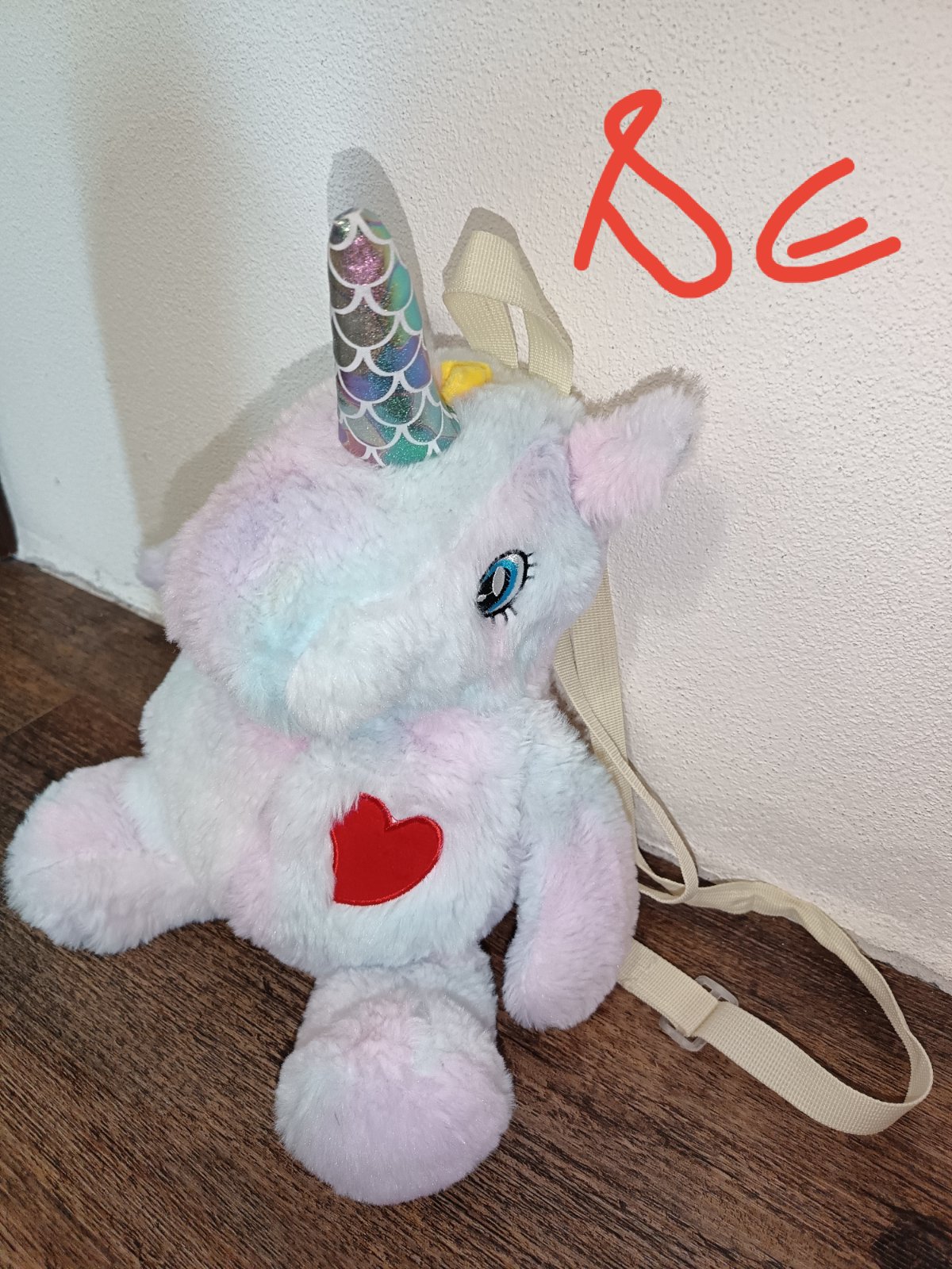Na chrbáte má zips na vecičky, veľmi príjemný materiál na dotyk, nepoškodené, dlžka od rožkov po chvostík 23